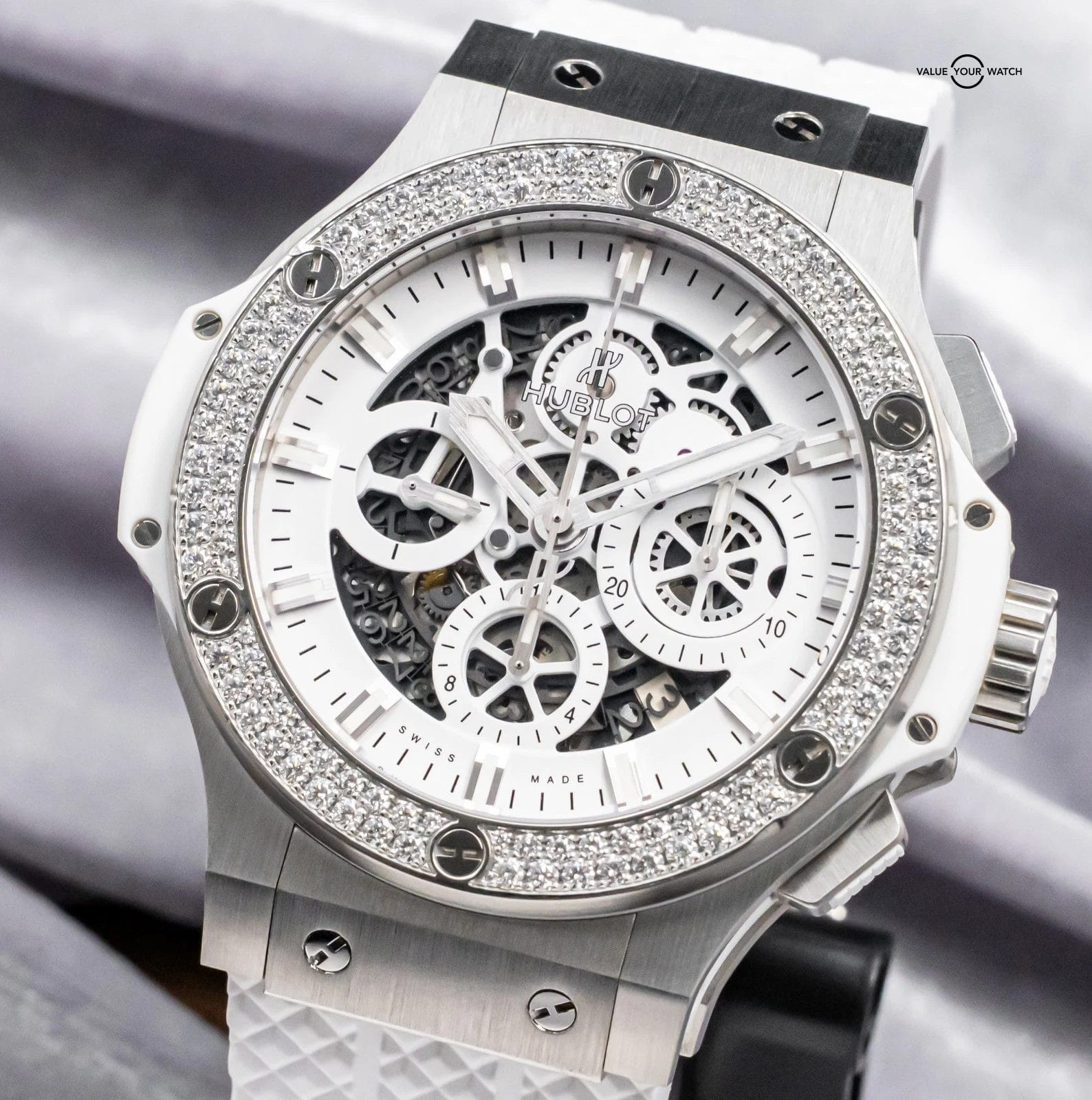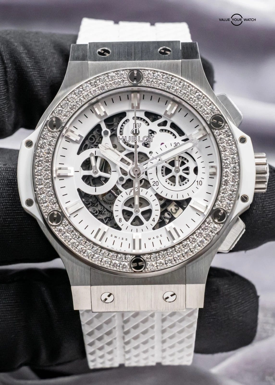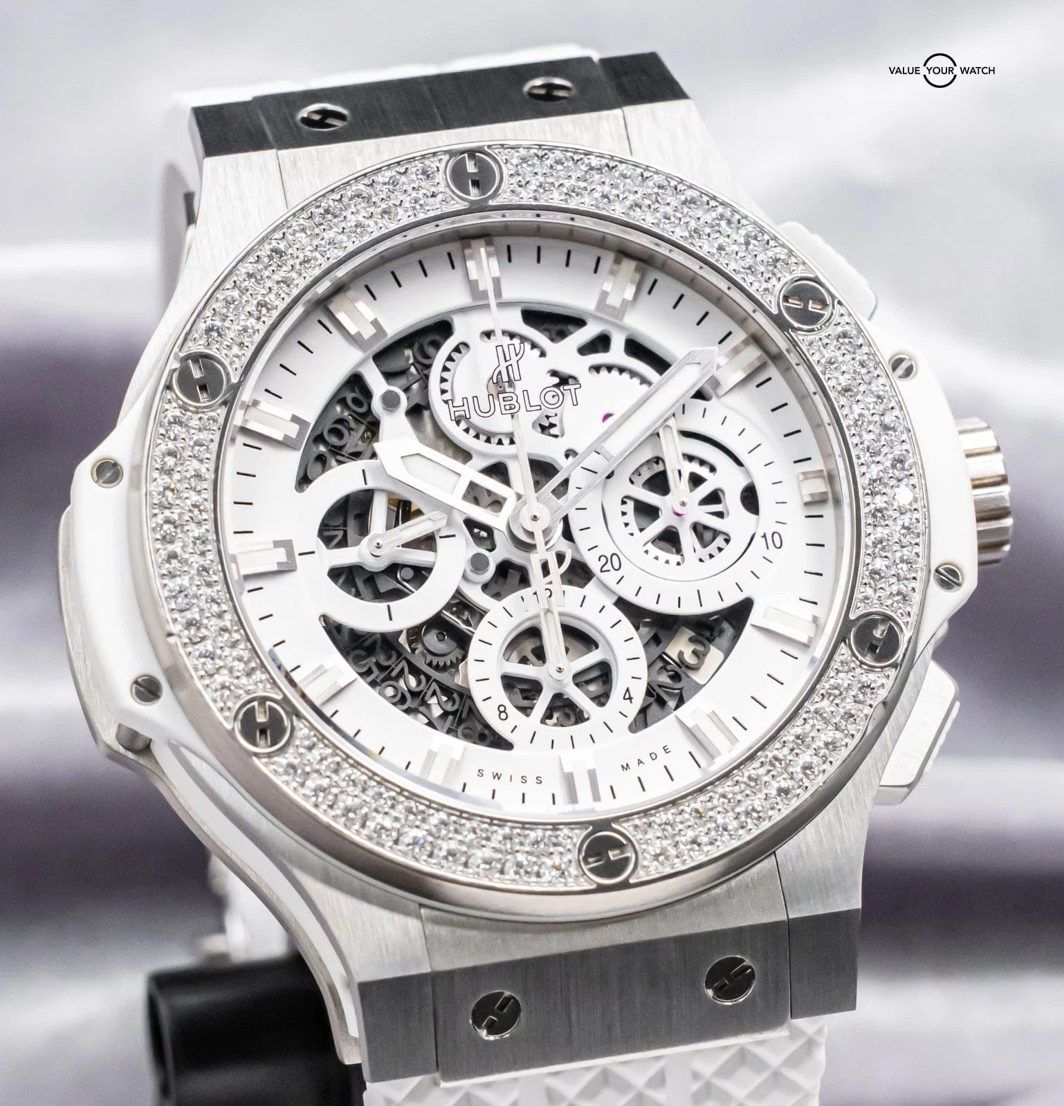 STRIKING Hublot Aero Bang Big Bang 44 All White with FACTORY DIAMOND Bezel & White Skeleton Dial on BRAND NEW UNWORN White Hublot Structured Rubber! Arrives with the original Hublot boxes and papers including the NFC style warranty card. Do not confuse this NFC style card for the older write-in style cards, the NFC card is unreplicatable as it’s embossed with the serial from the factory, a huge value-add. This piece was SERVICED at Hublot in February 2026 and is under WARRANTY through February 2027, a huge value-add!