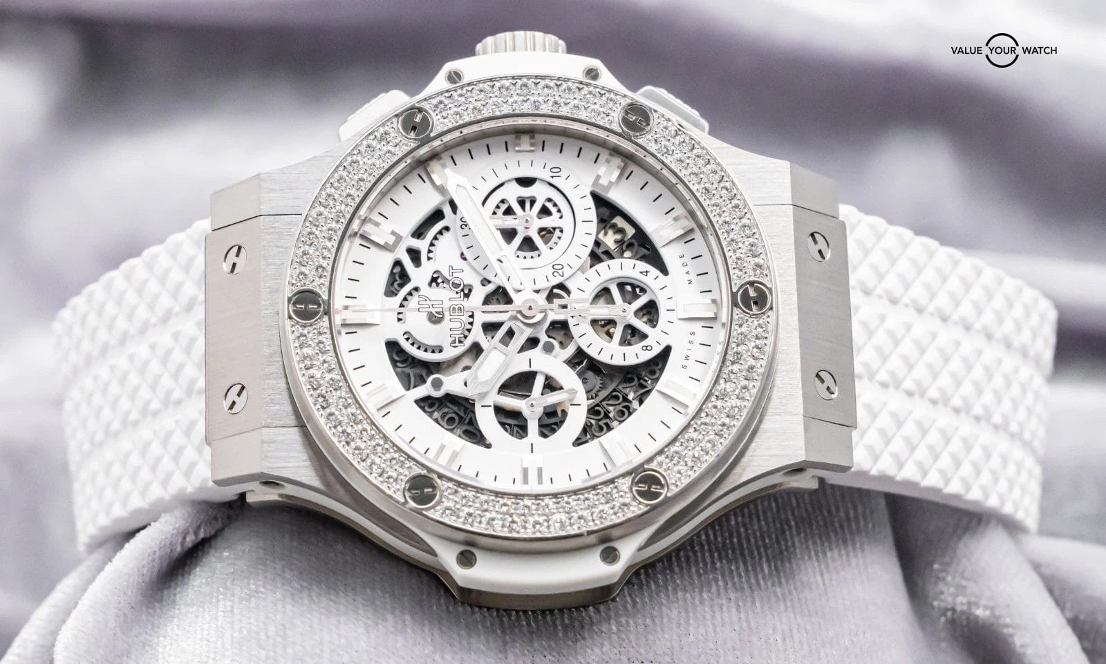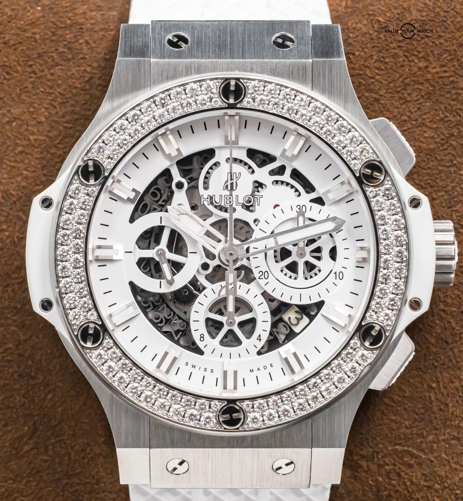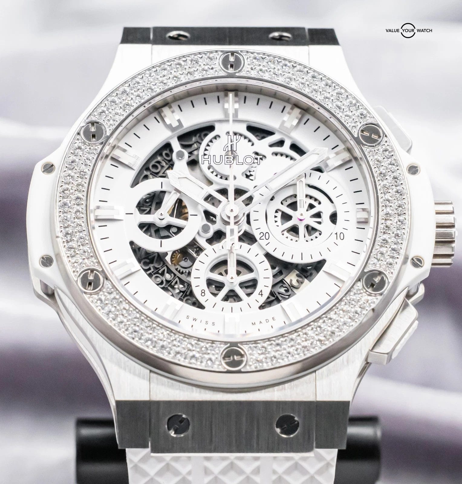 STRIKING Hublot Aero Bang Big Bang 44 All White with FACTORY DIAMOND Bezel & White Skeleton Dial on BRAND NEW UNWORN White Hublot Structured Rubber! Arrives with the original Hublot boxes and papers including the NFC style warranty card. Do not confuse this NFC style card for the older write-in style cards, the NFC card is unreplicatable as it’s embossed with the serial from the factory, a huge value-add. This piece was SERVICED at Hublot in February 2026 and is under WARRANTY through February 2027, a huge value-add!