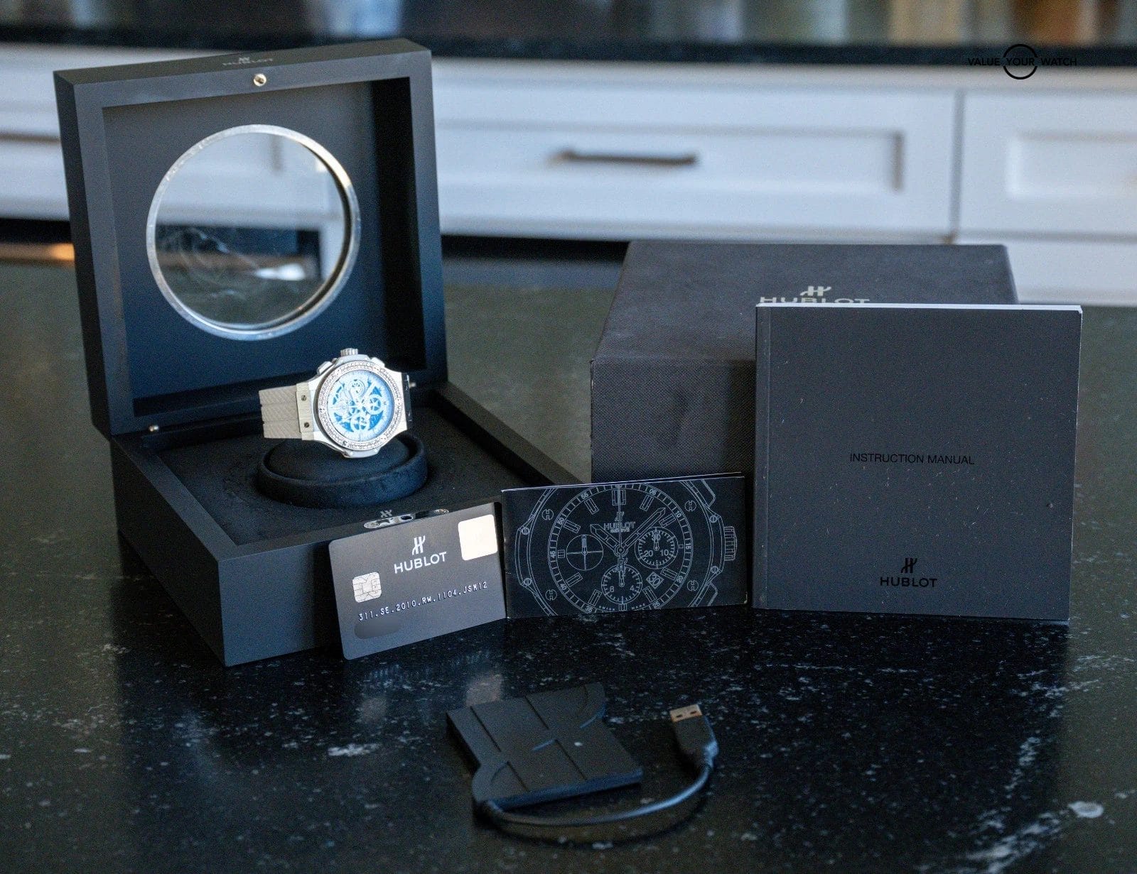 This watch is in great condition with minor wear, nothing notable. Keeping good time on our timegrapher when tested! Do excuse the dust/lint in the pictures from the photography process. The boxes have typical minor wear as pictured (due to the materials Hublot originally used), this is normal. This Aero Bang looks very good and is ready to be on wrist!