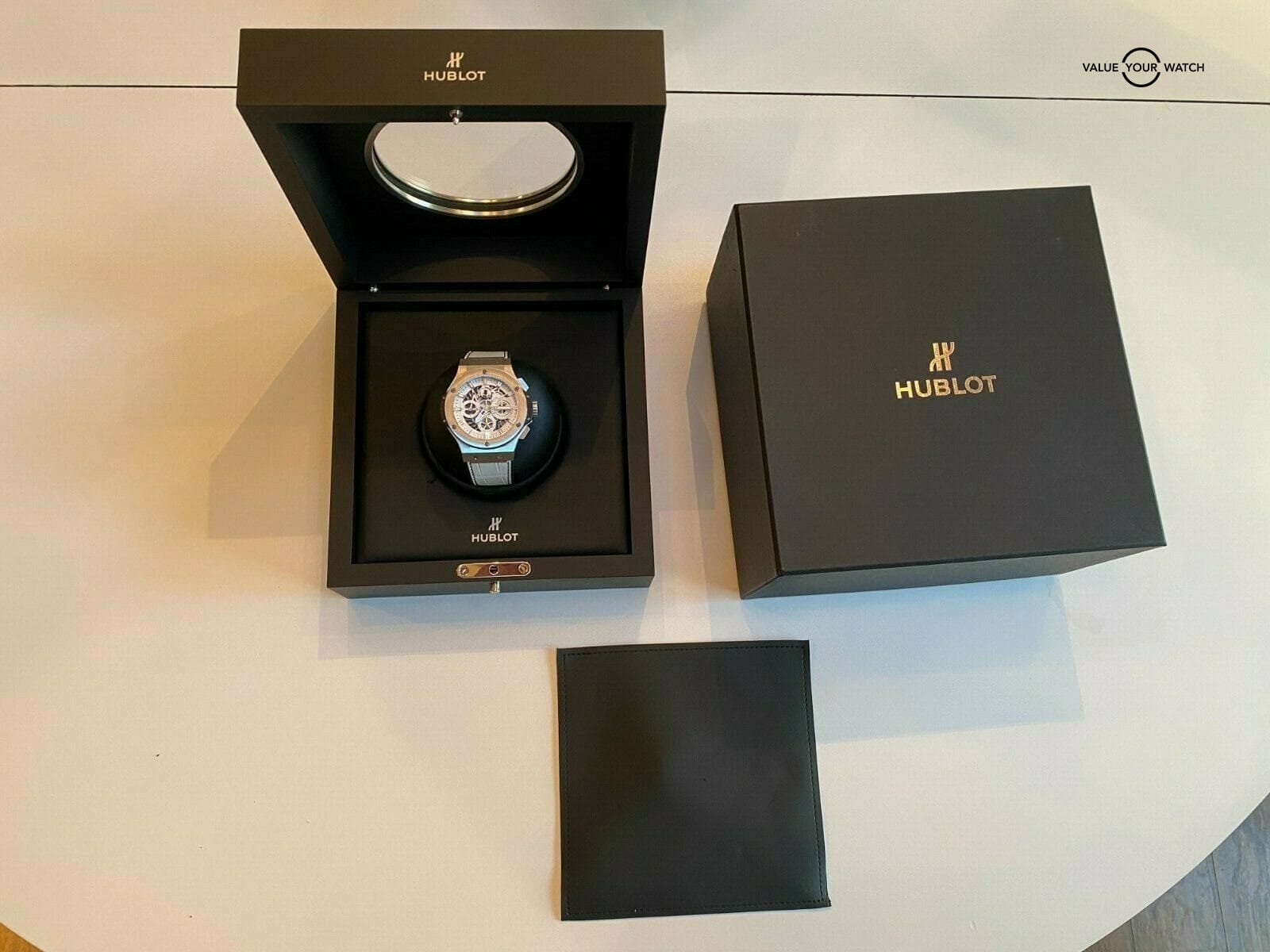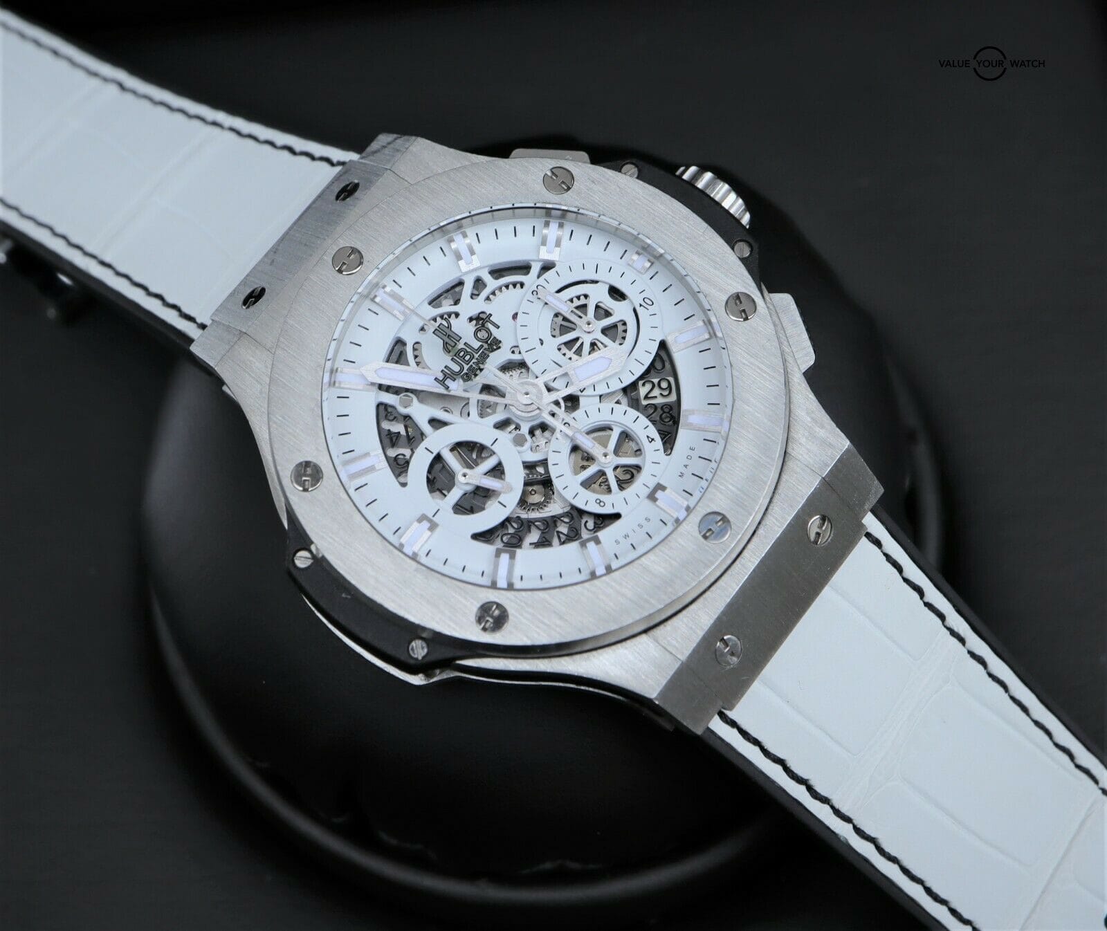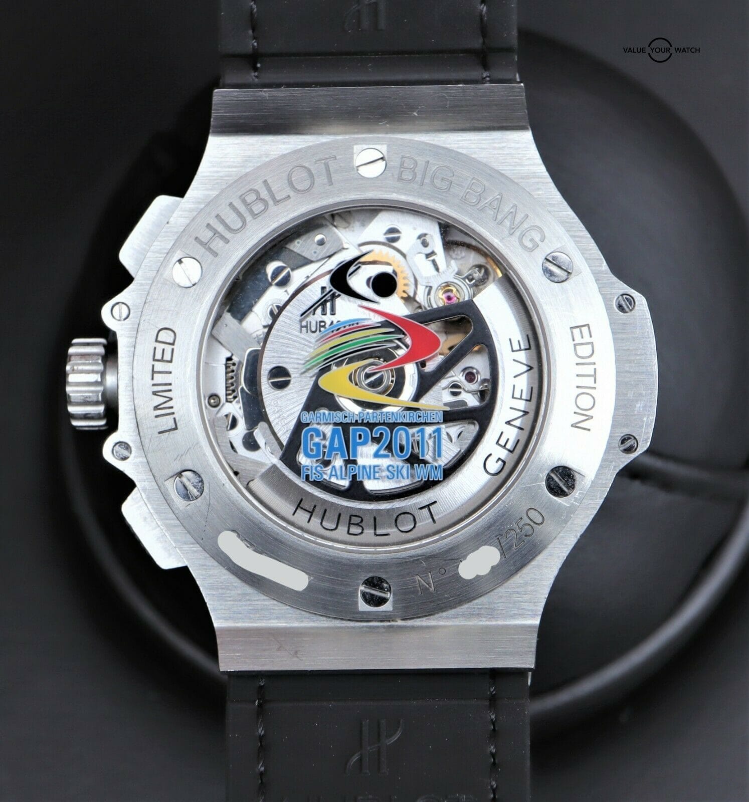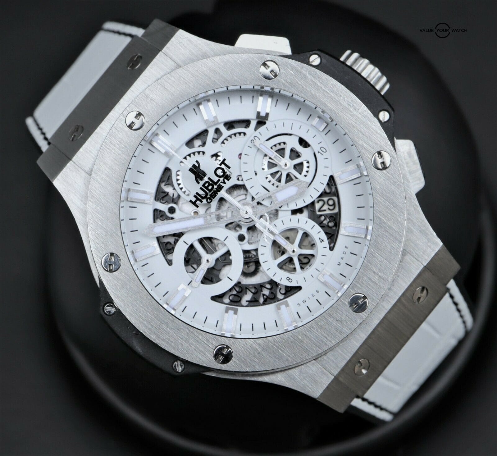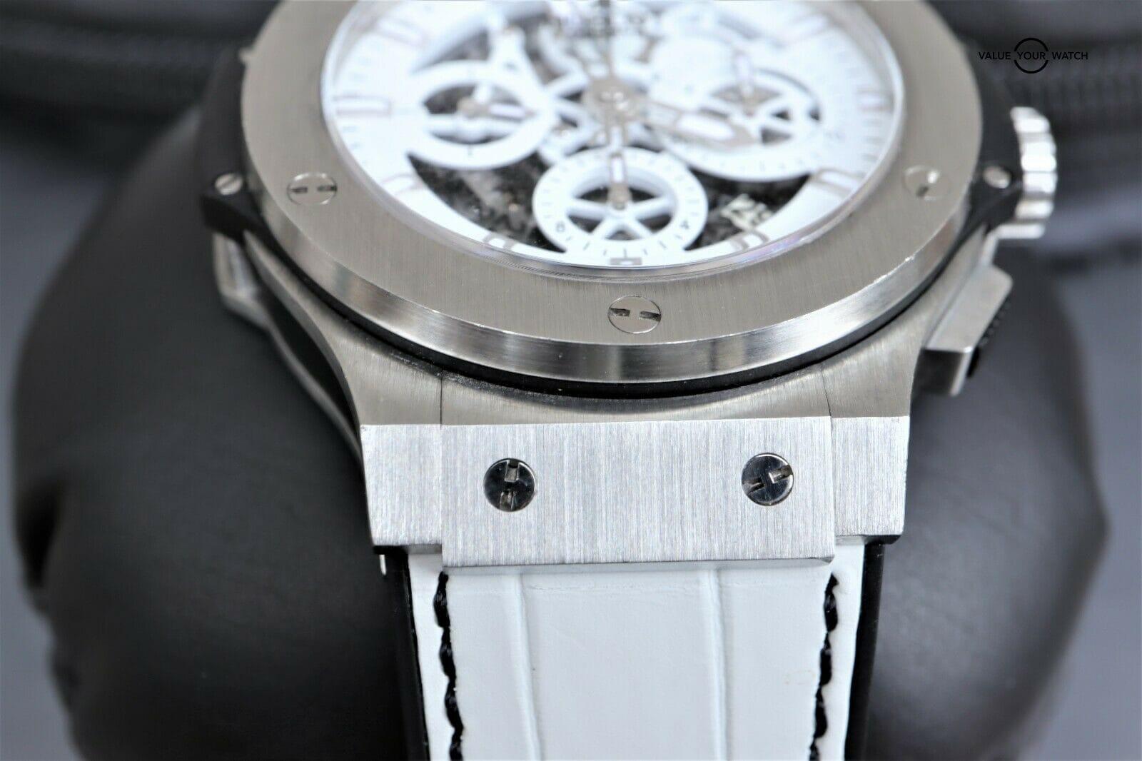 Hublot Big Bang Aero Bang Skeleton Garmisch 44mm LTD 250 pieces This set comes with the watch, outer and inner box (pillow has some minor flaking). The crystal is clean with no nicks or scratches. The was a limited-edition piece of 250. Original msrp was $19,900. Please pay close attention to the pictures as it accurately describes condition. Mechanically the watch is functioning as it should. Serial numbers and names are blurred in photos only for privacy reasons. Hublot is the official timer of the World Ski Championships and Hublot invited Maria Riesch to their ambassador team. To celebrate they launched this white Aerobang Garmisch limited edition after the 2011 World Ski Championships. I am happy to answer all questions about the watch. Just reach out to me via messages. I have many references in the watch world and am happy to provide as many as needed. Feel free to search my username “thegolferguy” in the Rolex Forums under the “Who’s Who” section and see ample feedback.
