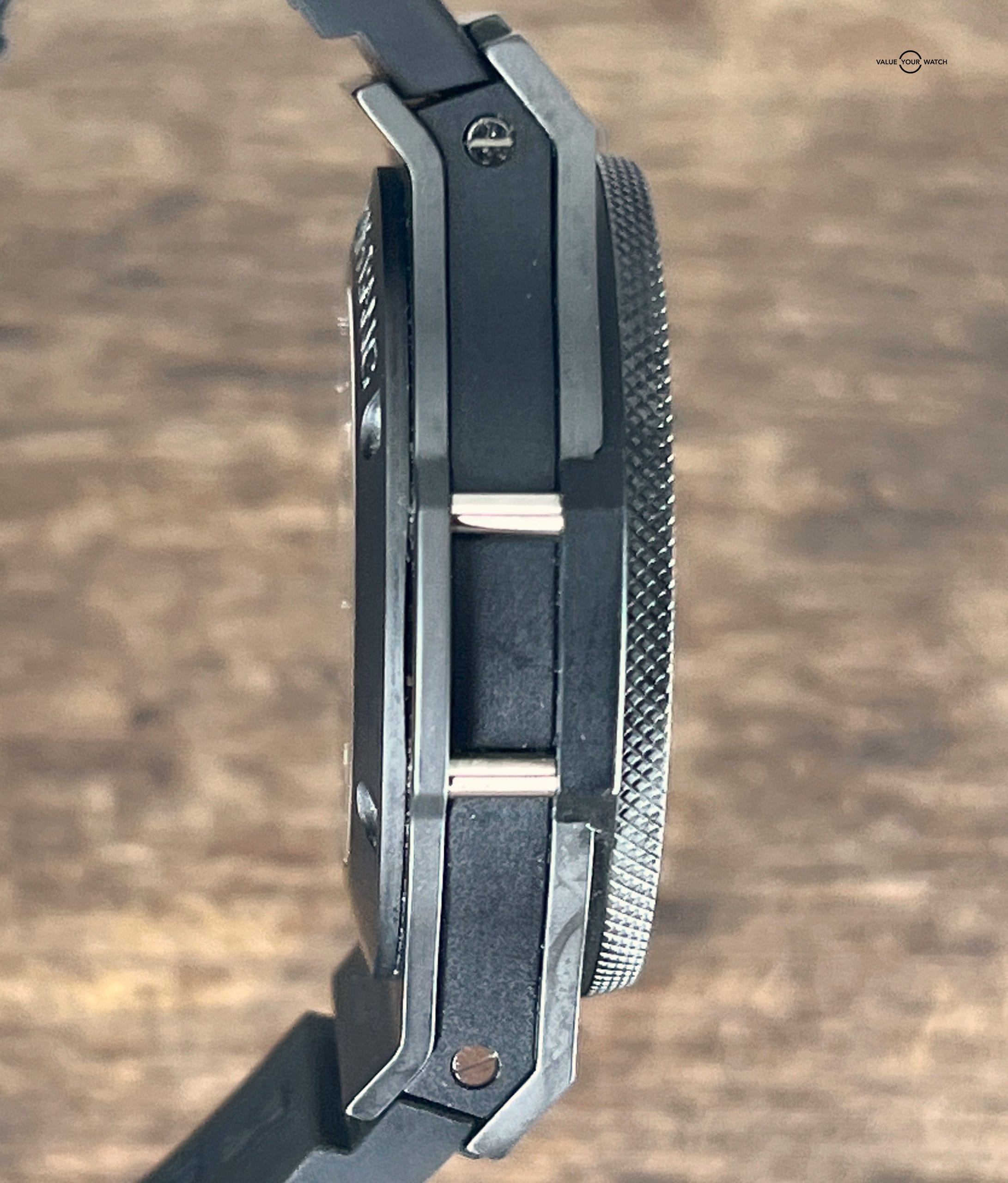 This watch certainly makes its presence felt and seen with a 14.5mm thick ceramic case and bezel. A fold-over push button deployant buckle allows for easy resizing if desired.