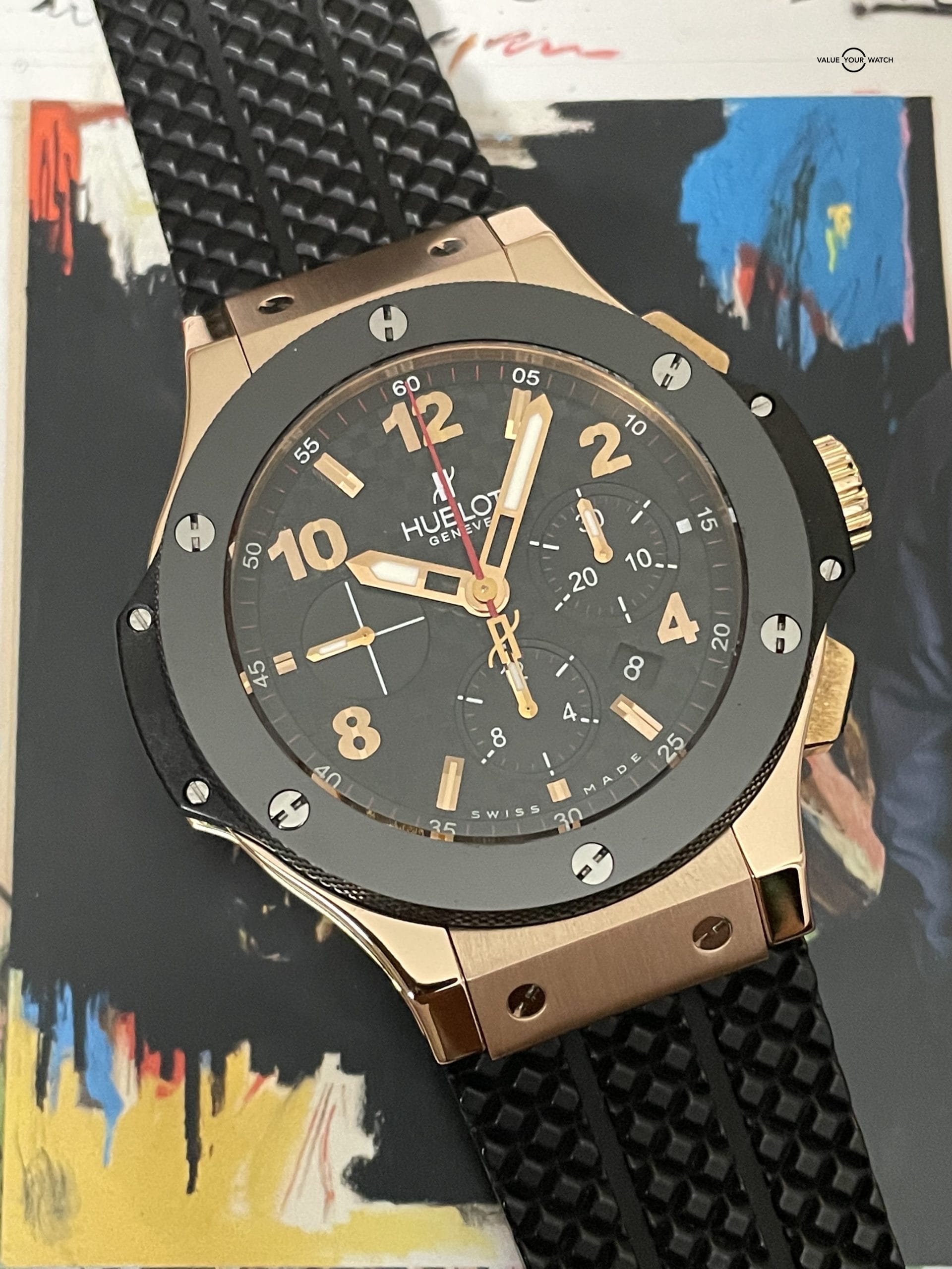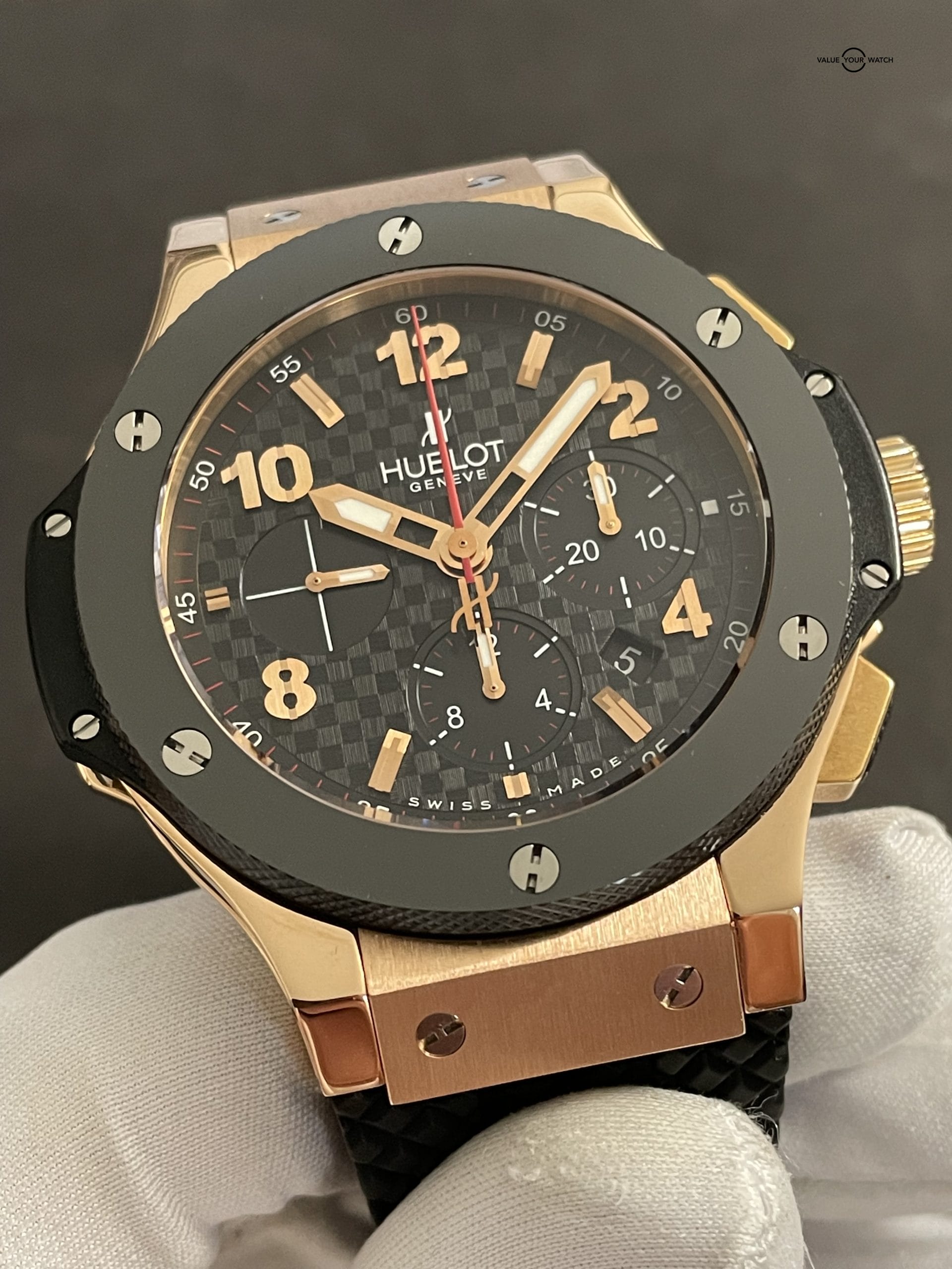 This watch needs no introduction. It’s the iconic Hublot Big Bang. And this one is the big boy all 18k rose gold variant that you certainly don’t see around often! Motorsport inspired and backed by some of the most innovative watch designs in the industry. This thing stands out on your wrist like you wouldn’t believe! The contrast of the carbon fiber dial, surrounded by the ceramic bezel against the incredible polished 18k gold lugs, brushed gold case surfaces and of course the incredible black rubber “tire tread” strap…makes for an absolutely stunning timepiece! Whether you’re into it for the racing connection, or just one of the coolest gold chronograph pieces around, you won’t be disappointed with this Hublot!