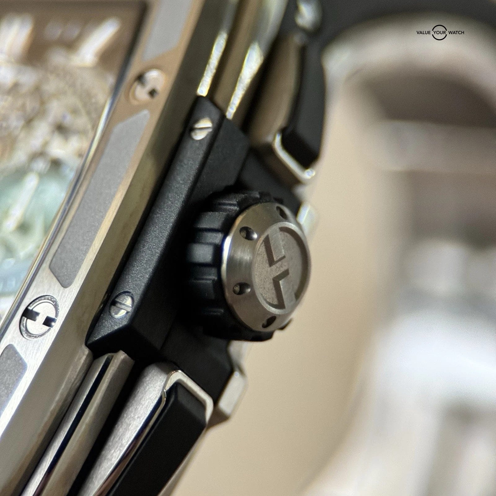 Striking Design: The Spirit of Big Bang offers an updated, elegant barrel-shaped profile. This watch features a satin-finished and polished titanium 42mm case with brushed, microblasted, and polished titanium bezel and signature “H” screws.