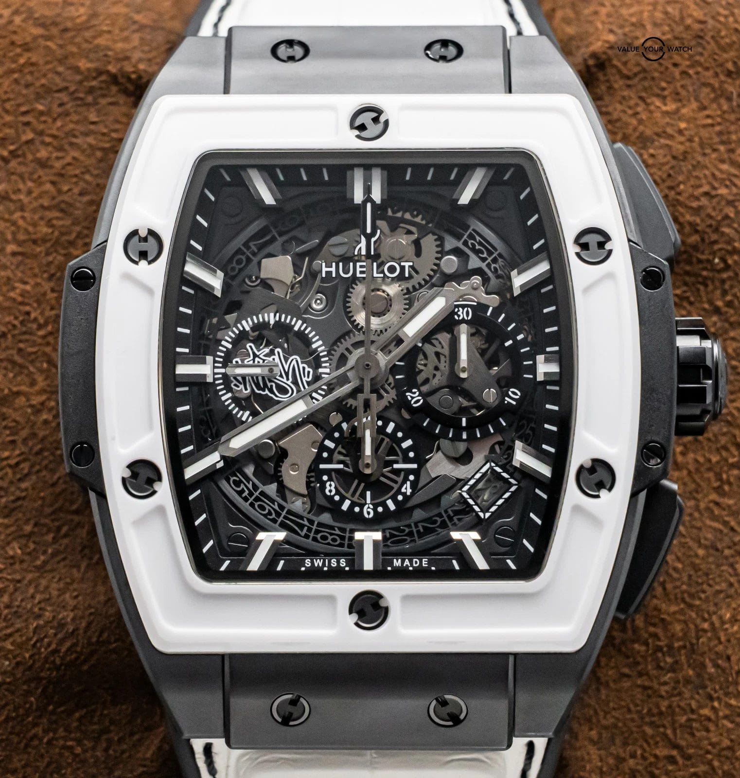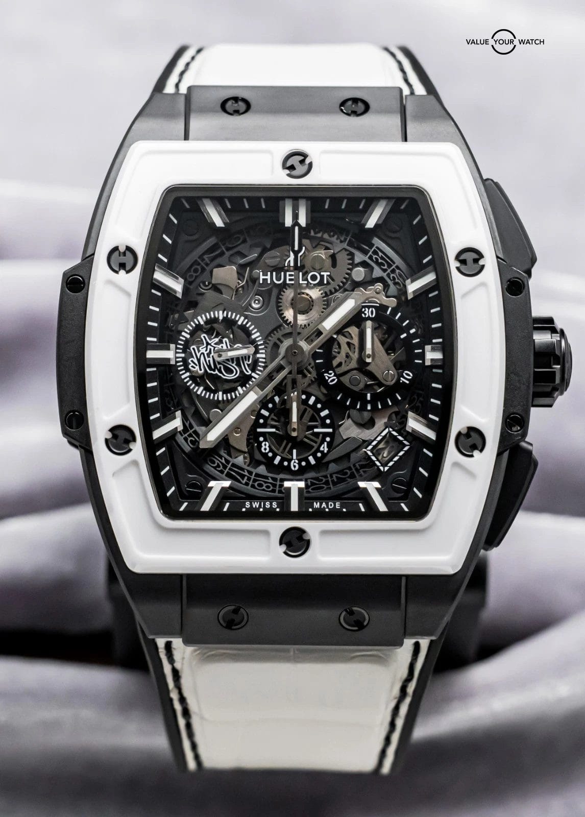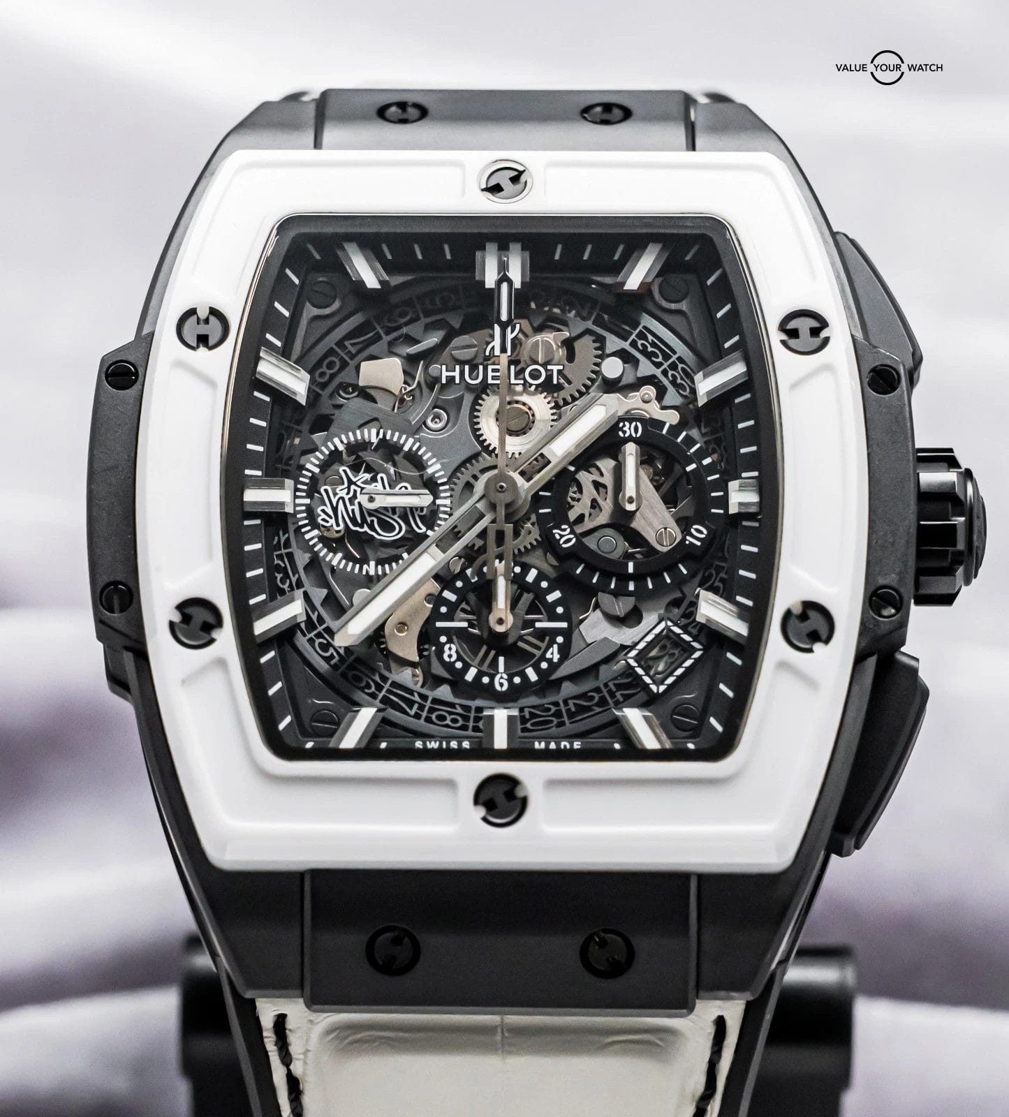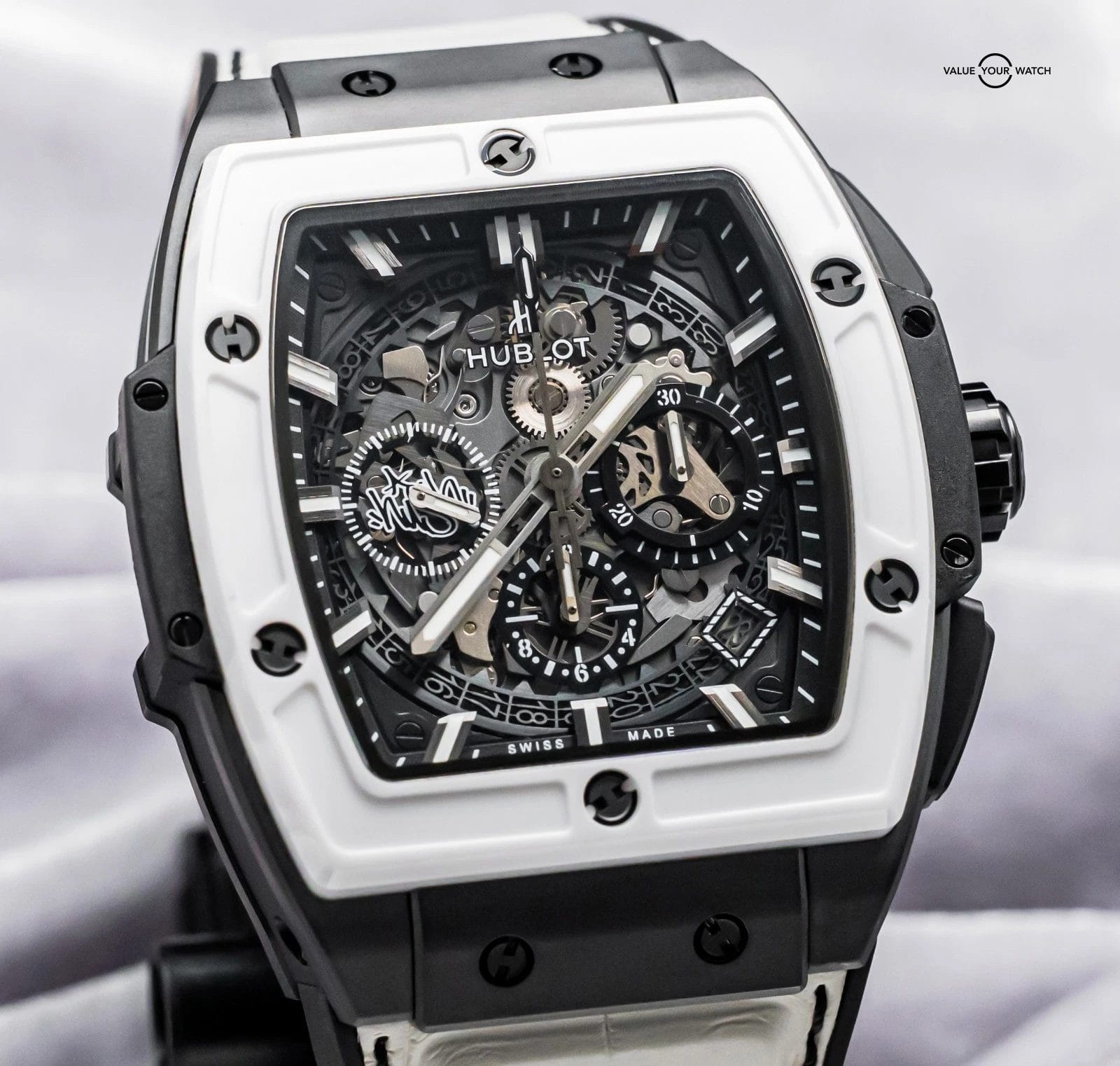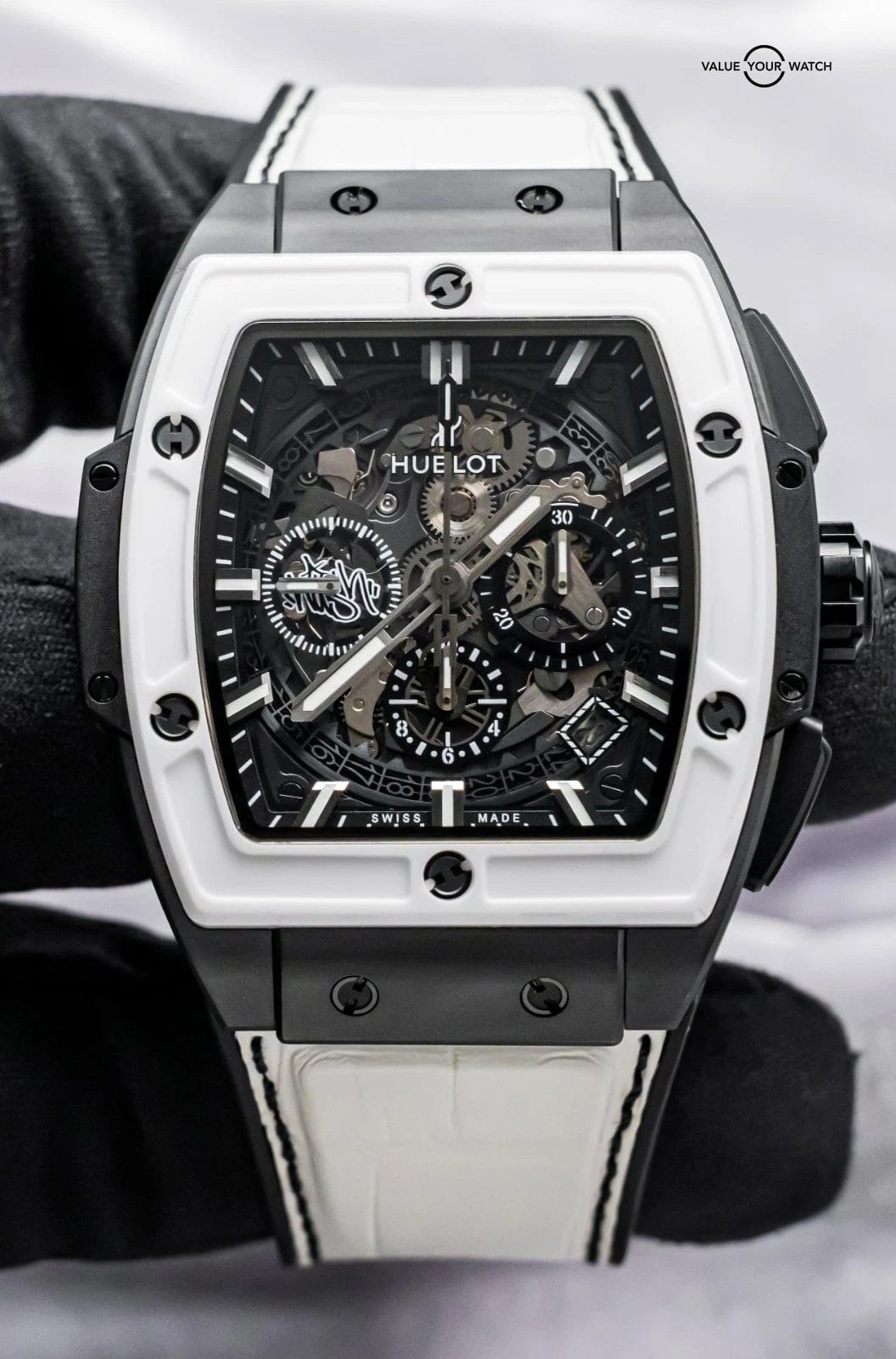 STUNNING Hublot Spirit of Big Bang 42 mm West Coast Ceramic Black and White Limited Edition of 50 with Black Ceramic Case, White Ceramic Bezel, and BRAND NEW UNWORN White Hublot Alligator Strap! Arrives with the original special edition Hublot boxes and papers including the international warranty card. Originally purchased in February 2018 from the Hublot Boutique in Dallas, and it has the original invoice to accompany it! I’ve always wanted this piece since it came out, as I LOVE Black & White Ceramic watch combinations; the Black Ceramic really allows the White Ceramic to pop, hence I also choose the White Alligator with Black Stitching, to tie both colors together. I’ve never seen one for sale, so I ahd to pick this up as soon as I was offered it. I am extremely tempted to keep it!