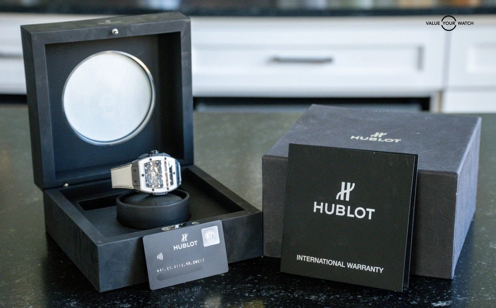 The watch is in phenomenal condition with only very minor wear, nothing notable. Keeping great time on my timegrapher when tested! Do excuse the dust/lint in the photos from the photography process. The skeletonized dial and transparent caseback are pretty sick, and the watch is super comfortable on the rubber. The Hublot boxes have typical wear due to the materials used in their production. Simply striking!
