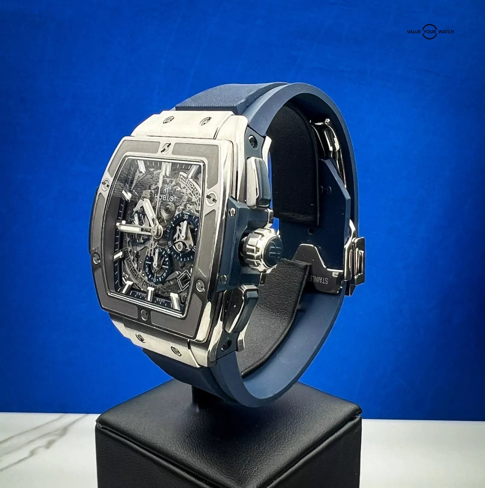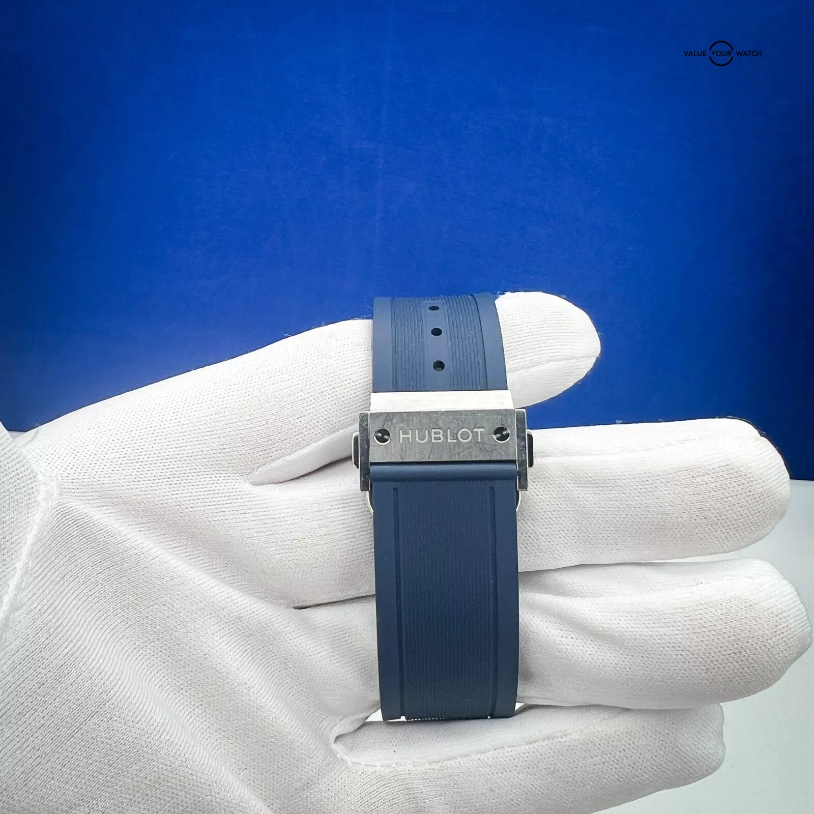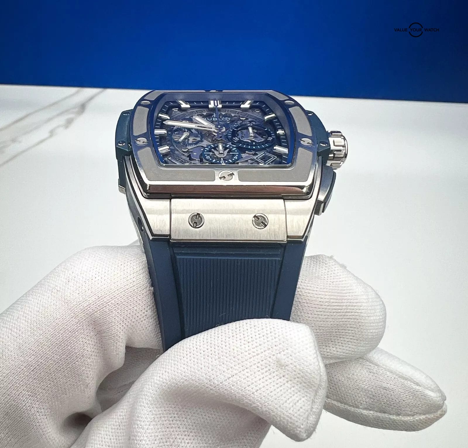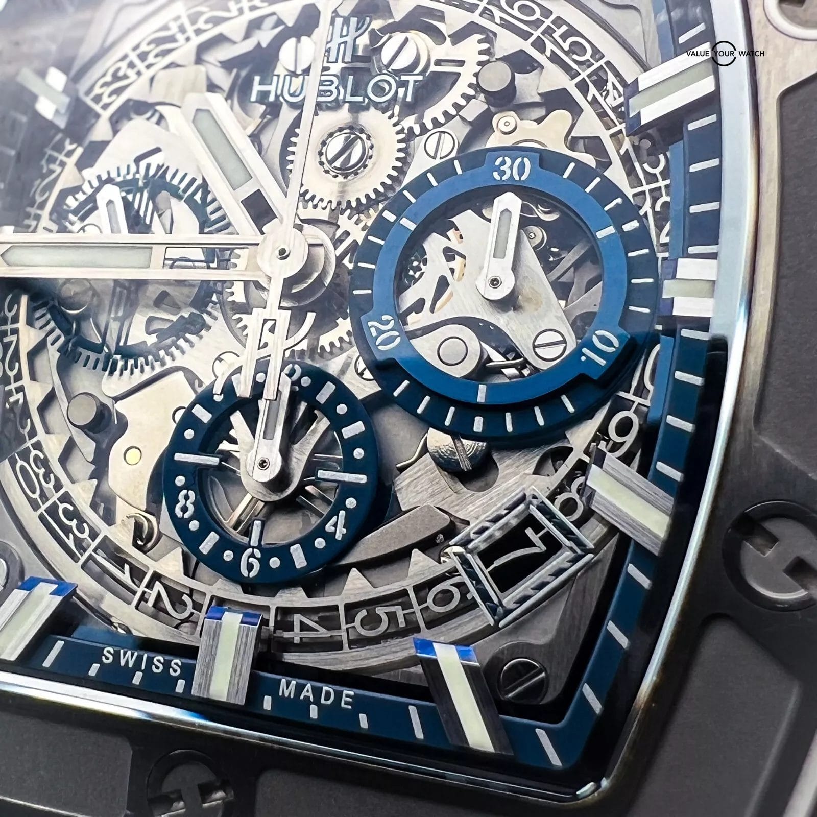 The Hublot Spirit of Big Bang Blue Titanium 641.NX.7170.LR is a stunning chronograph that seamlessly blends bold design with unparalleled Hublot craftsmanship.