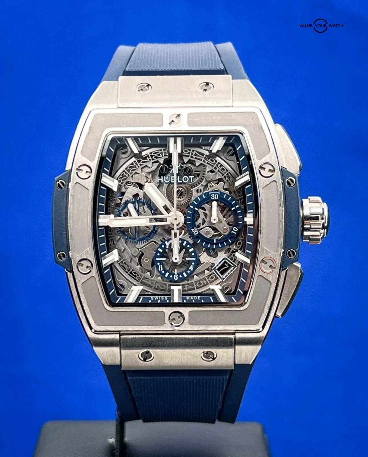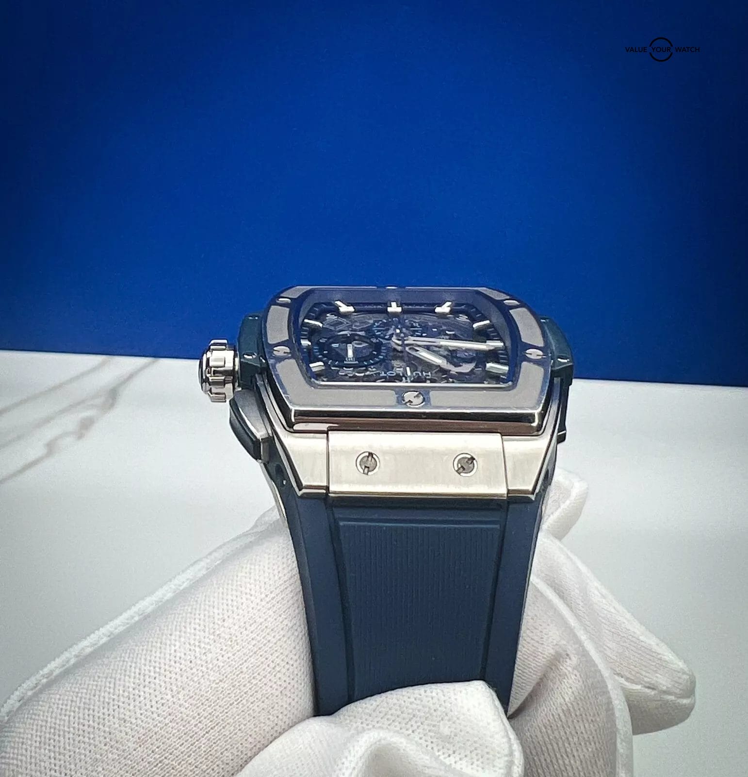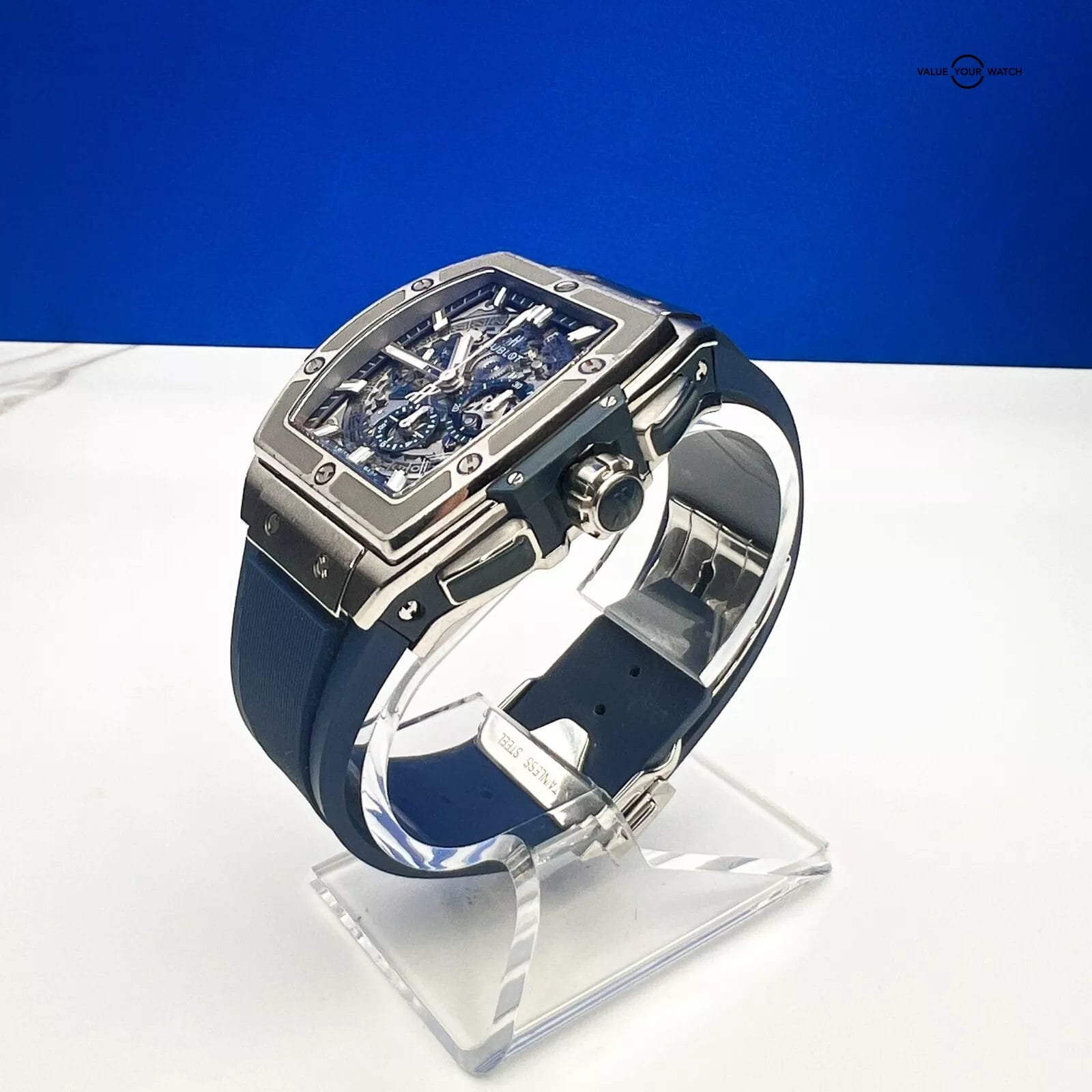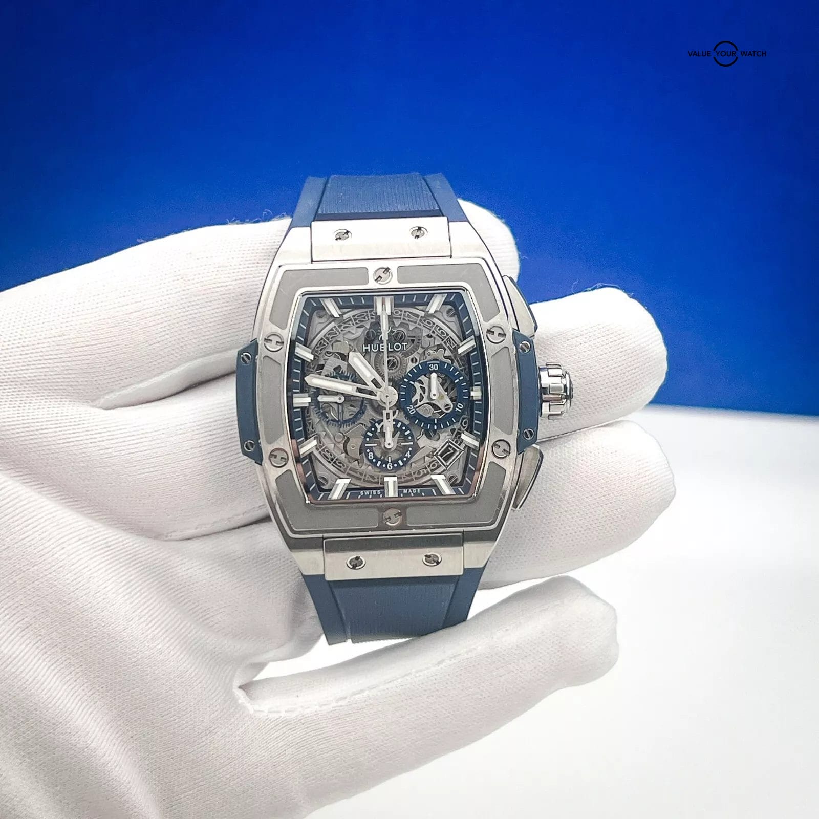 The Hublot Spirit of Big Bang Blue Titanium 641.NX.7170.LR is a stunning chronograph that seamlessly blends bold design with unparalleled Hublot craftsmanship.