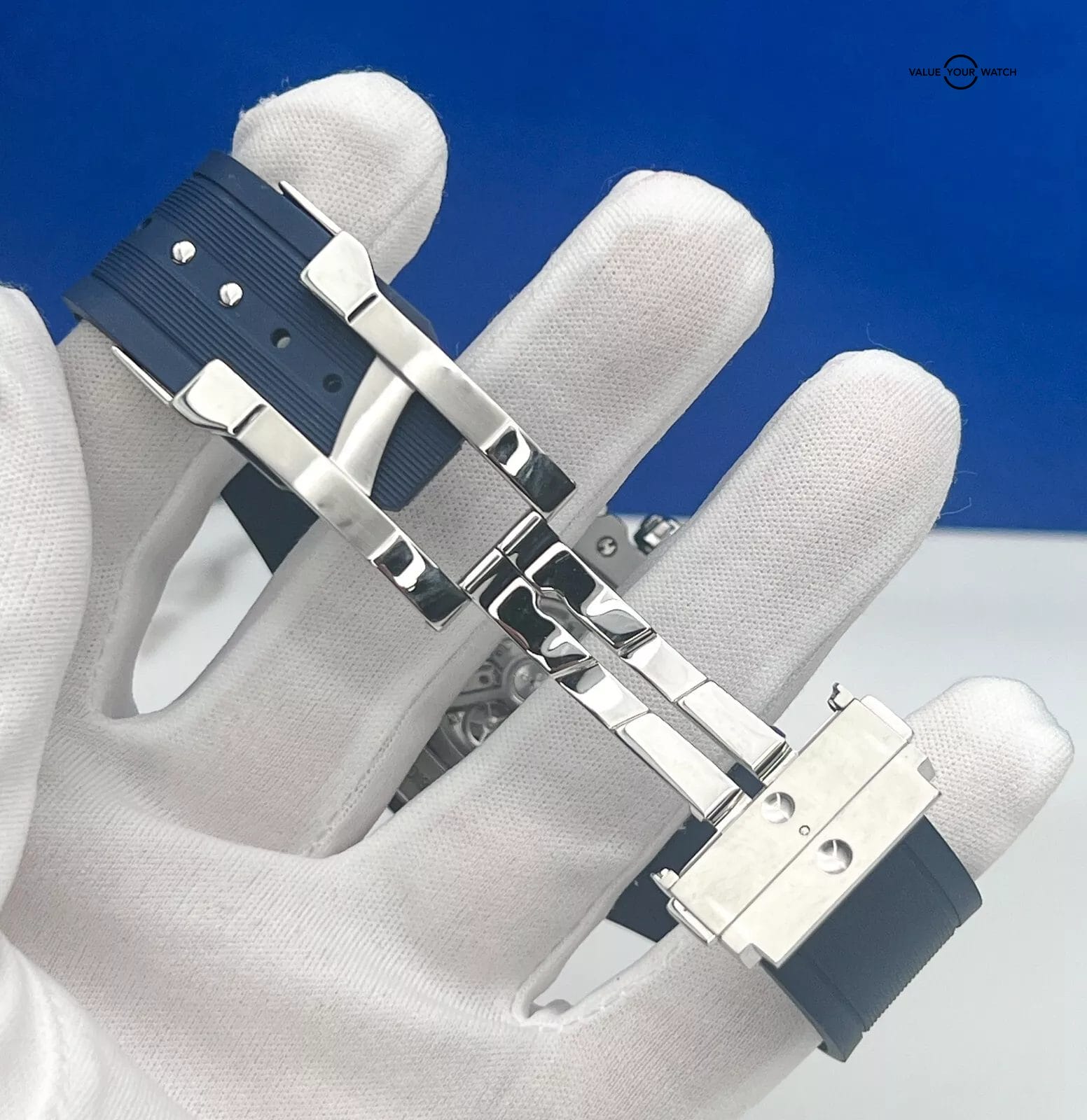The Hublot Spirit of the Big Bang Blue Titanium 641.NX.7170.LR is crafted from lightweight and robust titanium. It boasts a 42mm titanium case and micro blasted bezel, resulting in a lightweight yet durable timepiece. The sapphire crystal highlights the skeletonized dial which provides a fascinating view of the internal mechanics, showcasing the intricate movement and gears. Luminescent hour markers and hands ensure easy legibility in low-light settings. The subdials at 3, 6, and 9 o’clock not only add to the design but also enhance the functionality of the watch. Additionally, a date window is positioned between 4 and 5 o’clock.