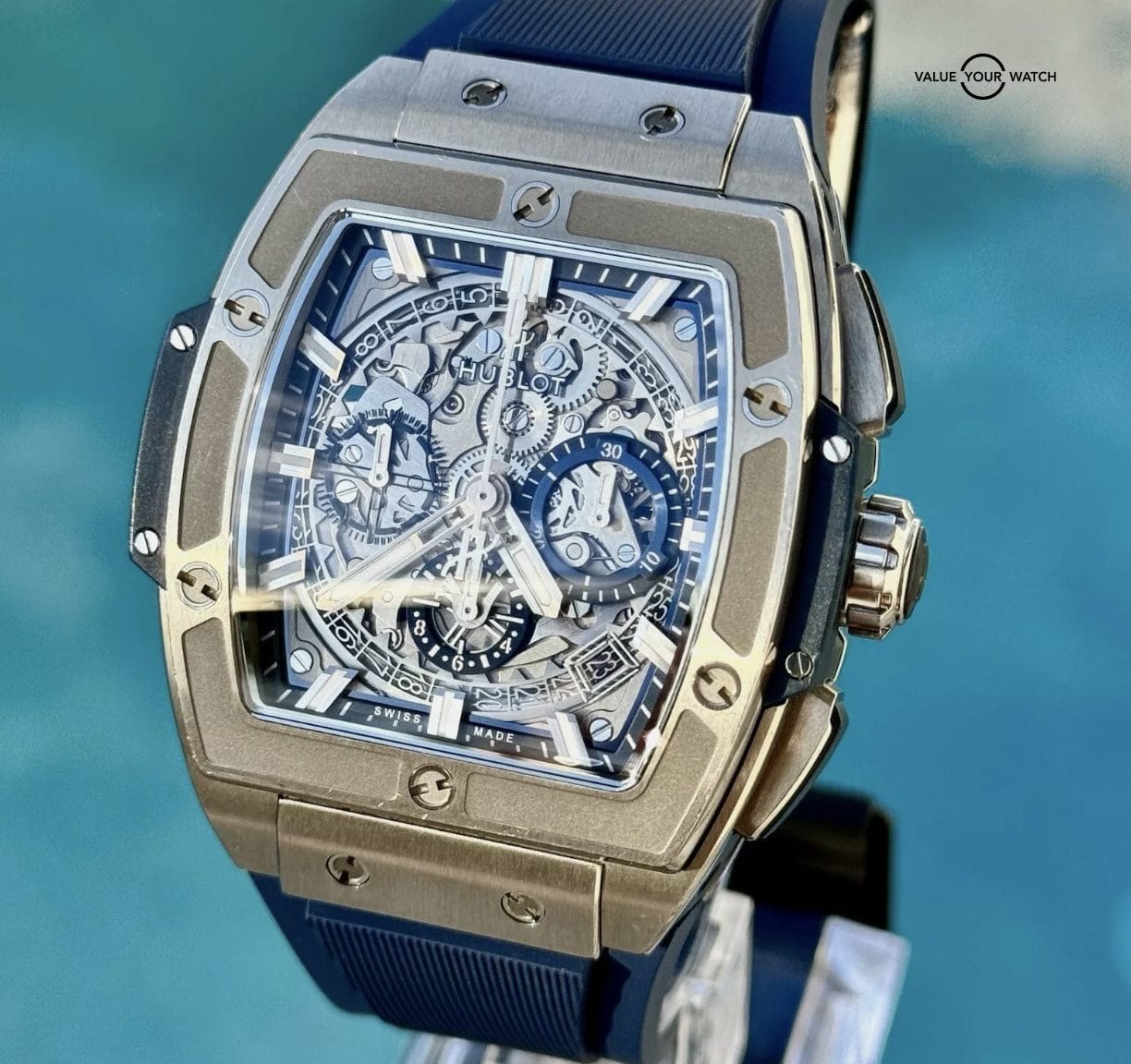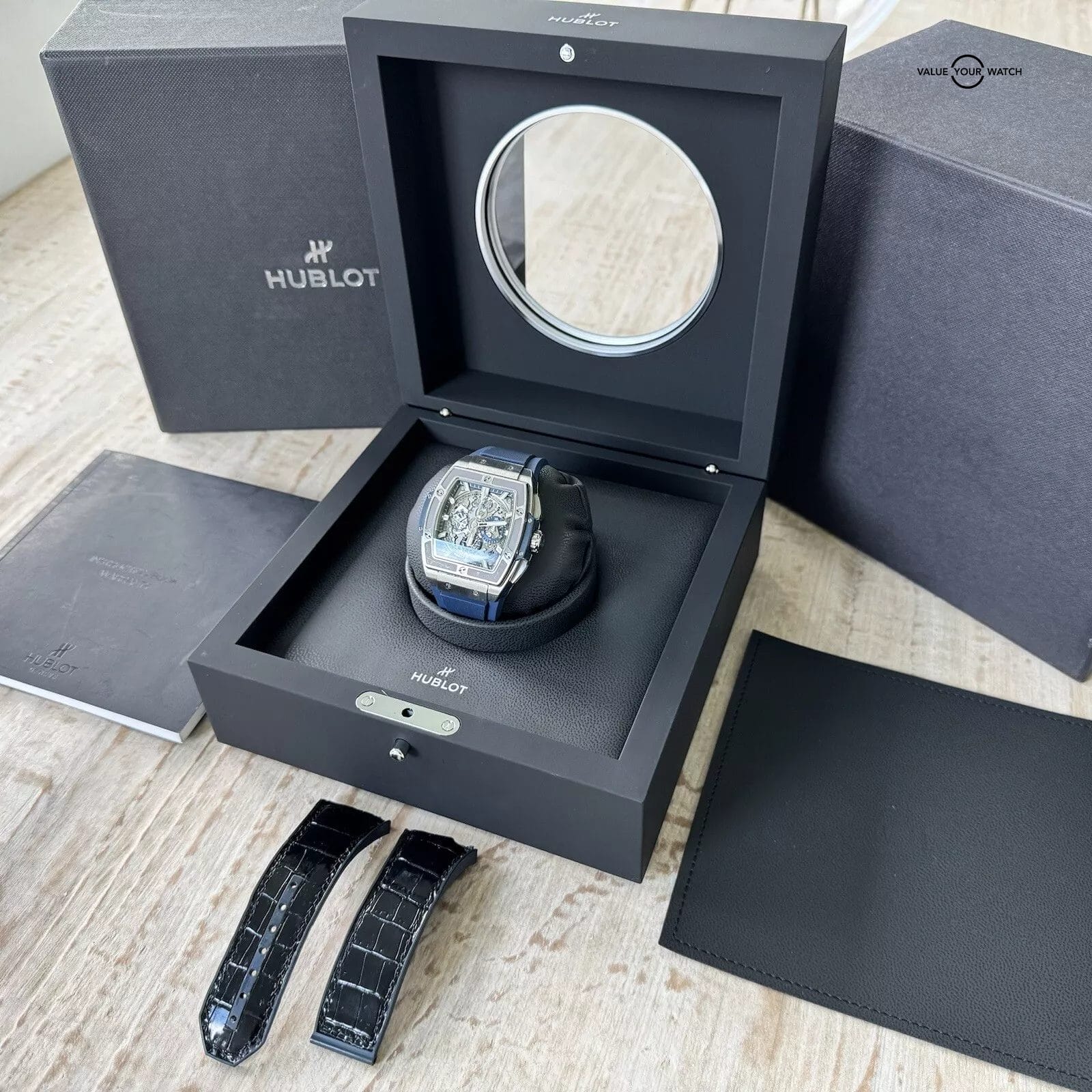 This full set includes the original blue alligator strap as well as a brand new Hublot rubber strap, offering versatility and extending the wearability of this magnificent timepiece.