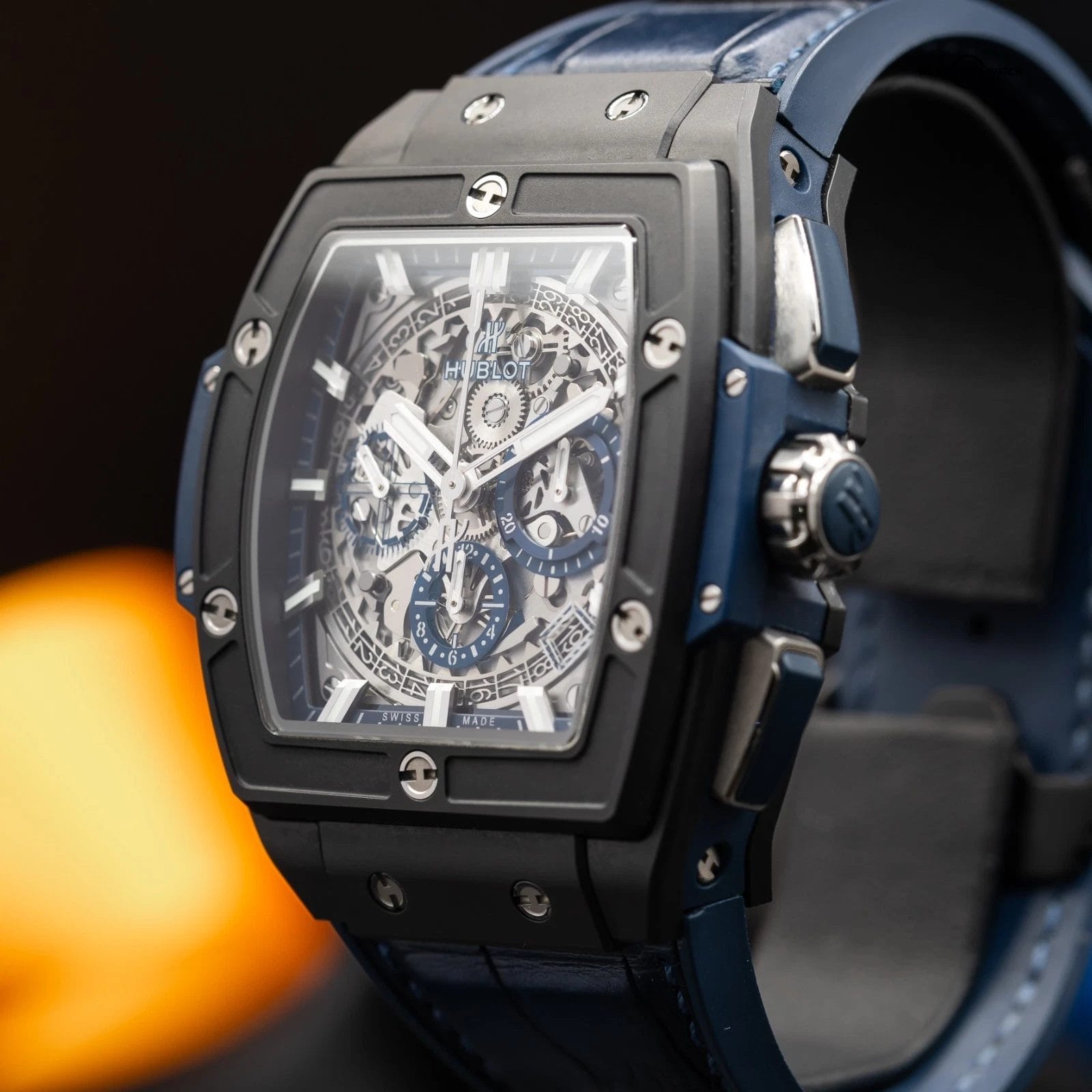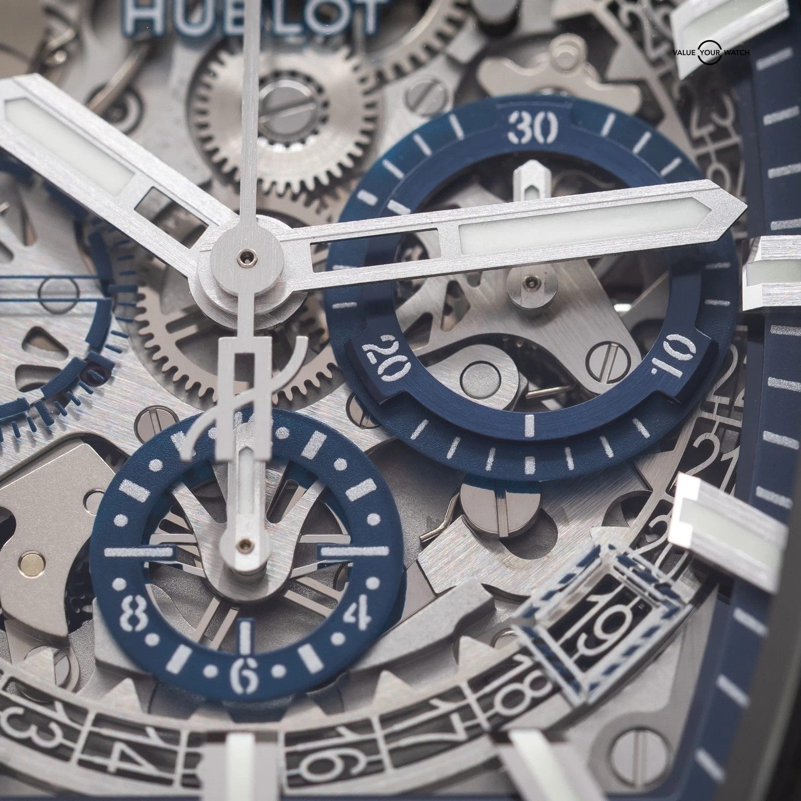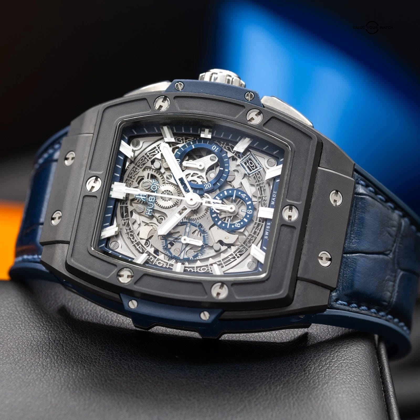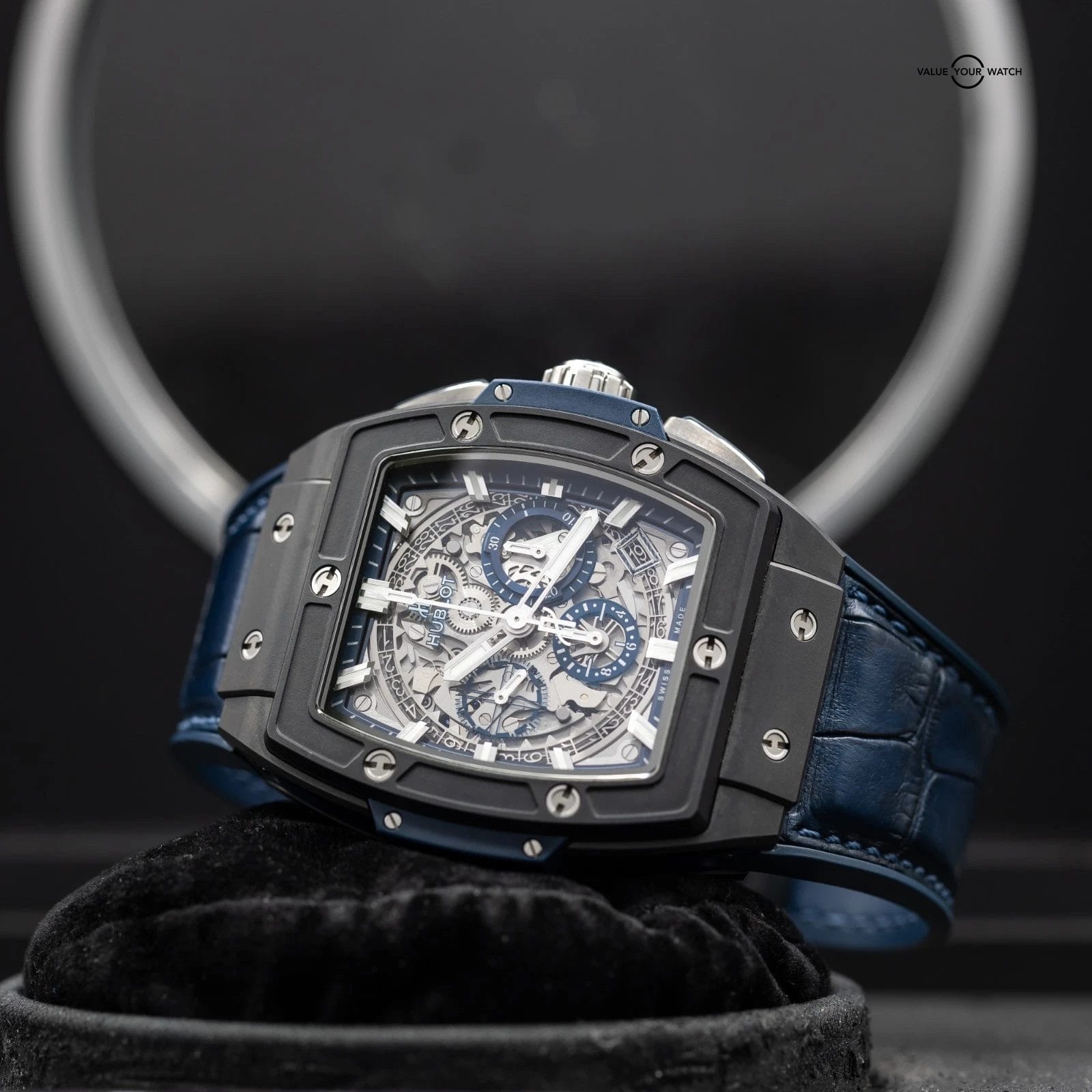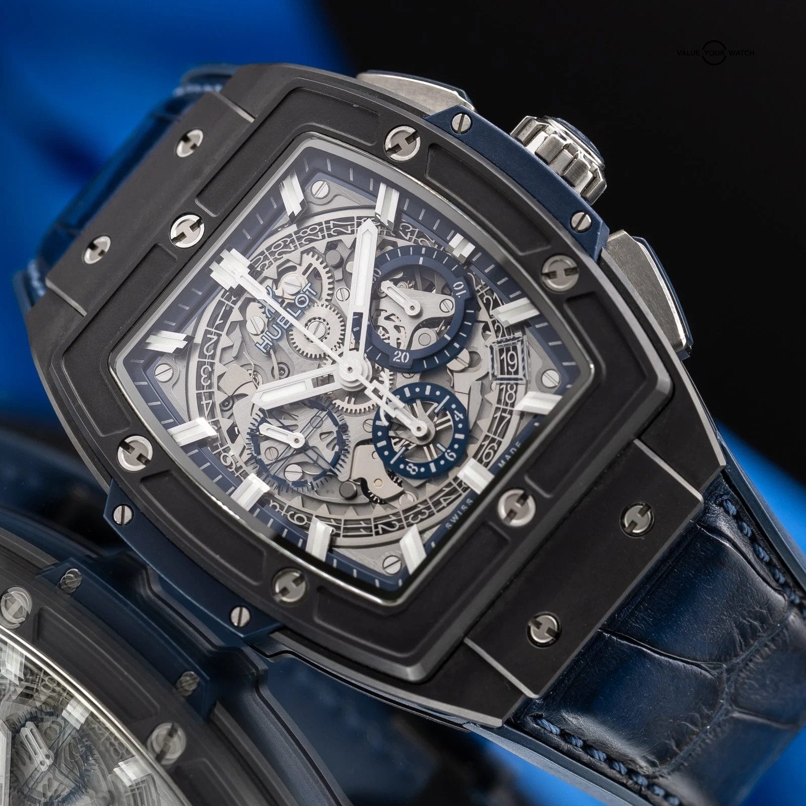 · Dial: Skeletonized sapphire dial with black and blue detailing, visible date disc, luminous hands and hour markers