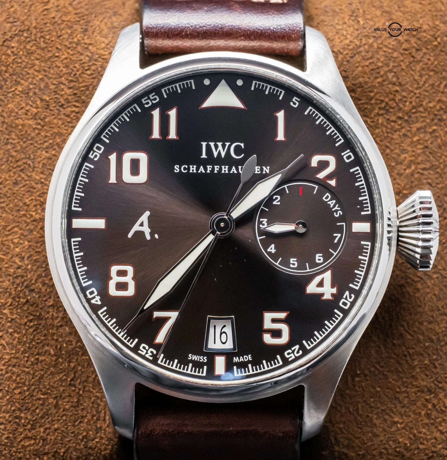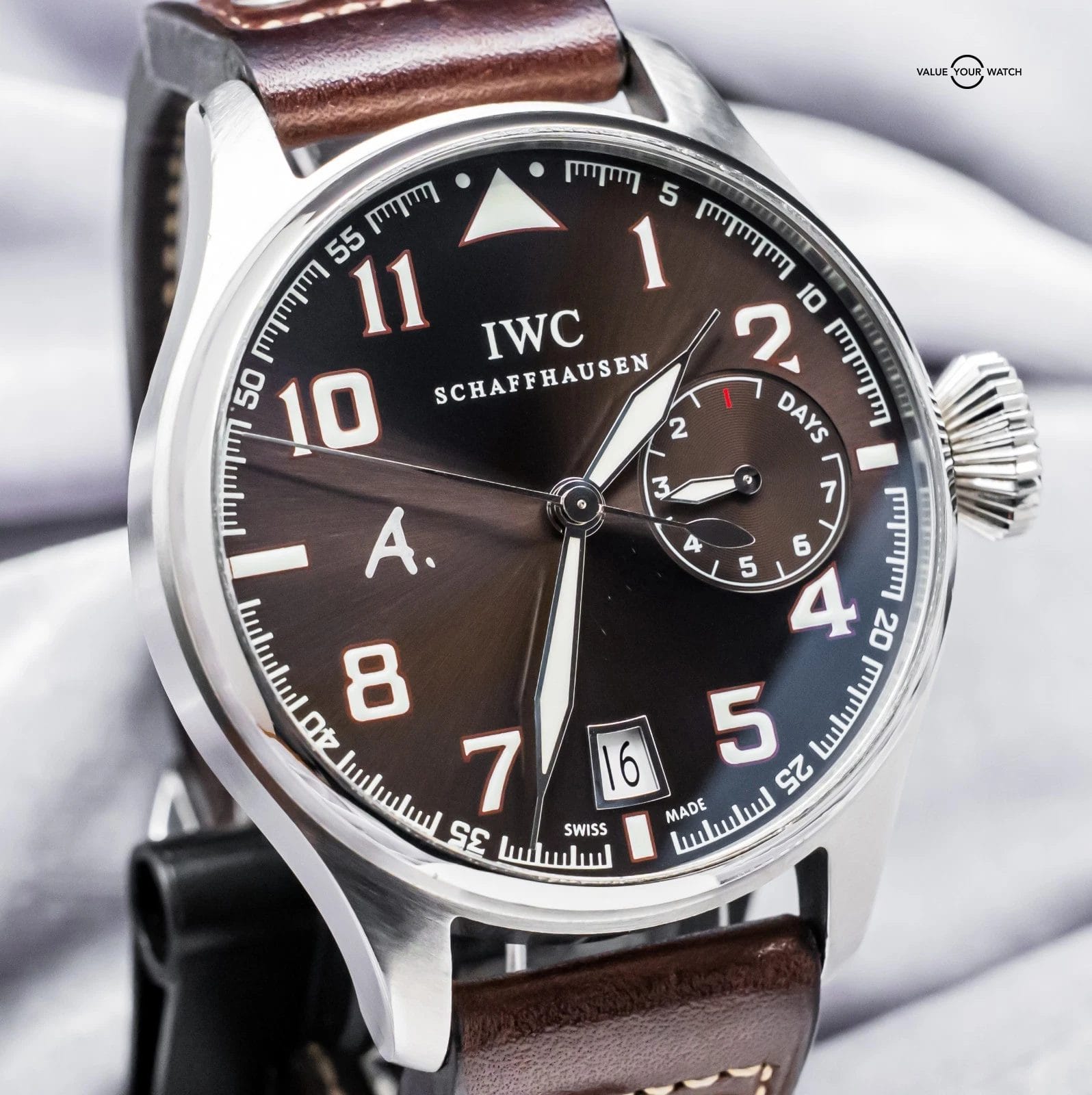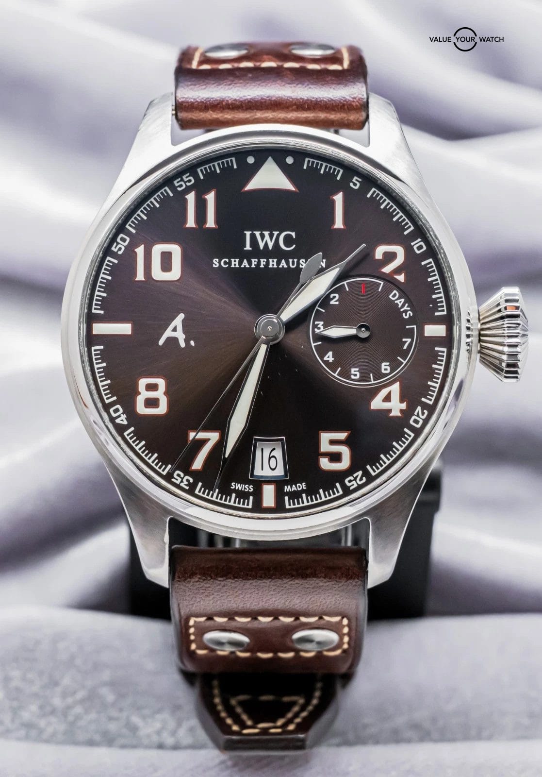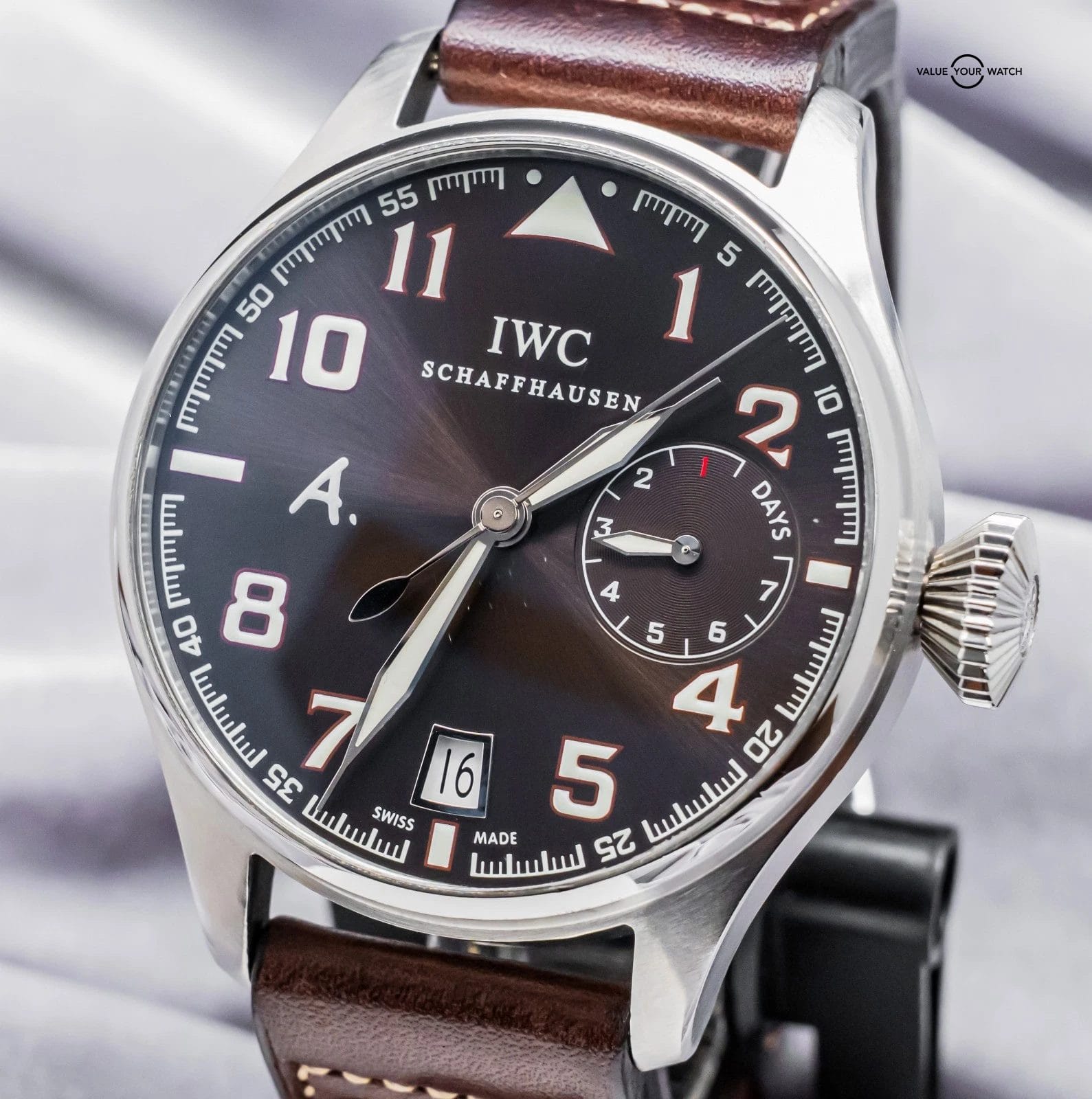 STUNNING IWC Big Pilot’s Watch Antoine De Saint Exupery Limited Edition of 1149 in Stainless Steel 46 mm with Brown Dial on Brown IWC Leather & Deploy Clasp! Arrives as a complete set with original IWC boxes and papers including the international warranty card. This Antoine De Saint Exupery Limited Edition of 1149 is essentially the classic Seven Day Power Reserve Big Pilot with Brown Dial & Leather to commemorate the historic French writer & aviator, Antoine De Saint Exupery. Ready to be on wrist!