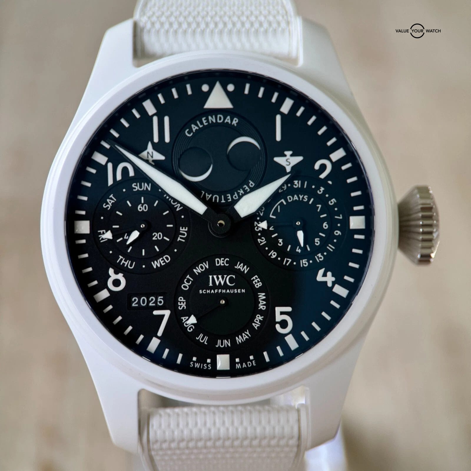 I’m thrilled to present a timepiece that embodies both formidable presence and sophisticated elegance: the IWC Big Pilot Perpetual Calendar White Ceramic “Lake Tahoe” Ref# IW503008.