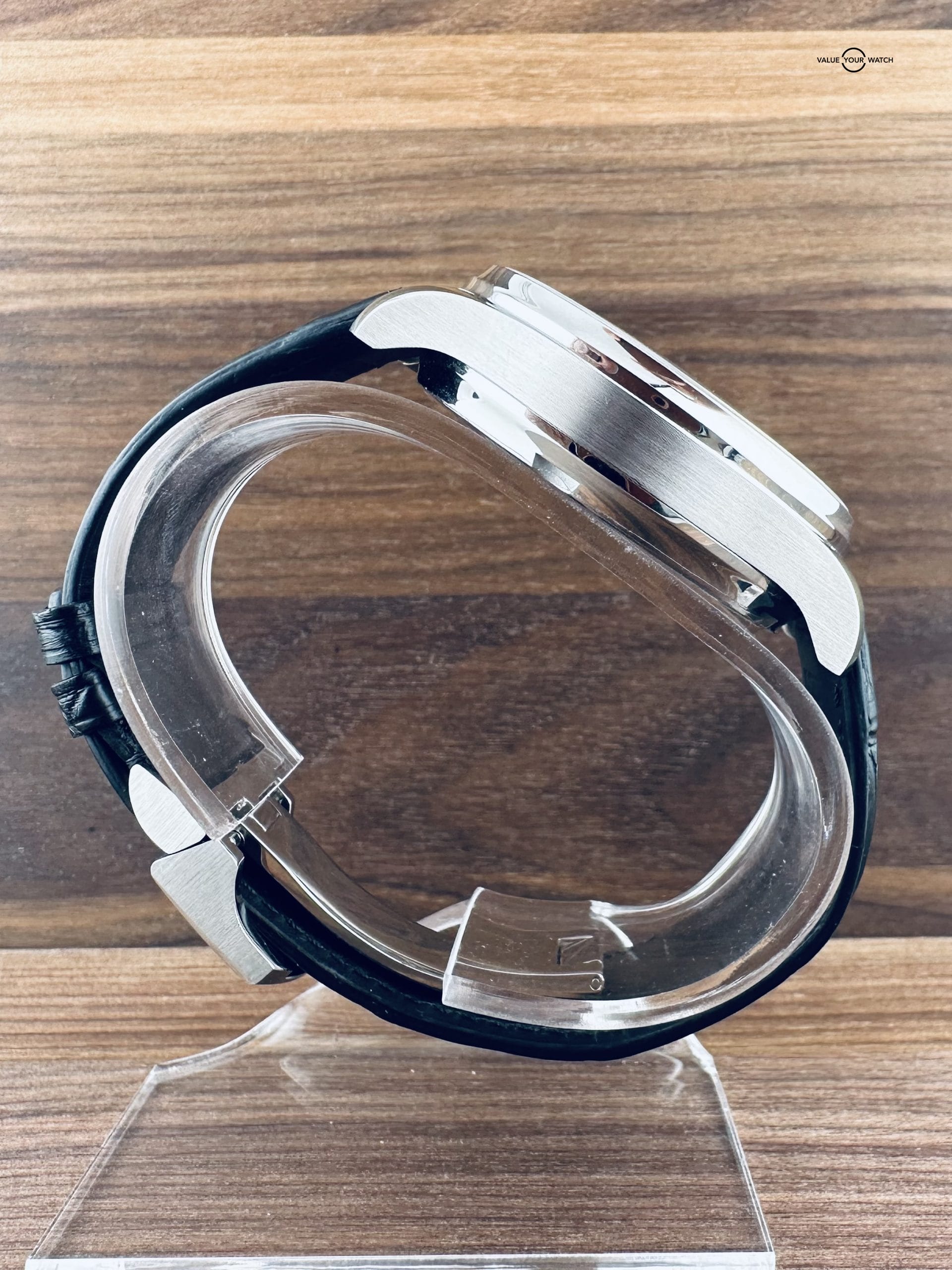 Strap: Premium black alligator leather, with stainless steel folding clasp.
