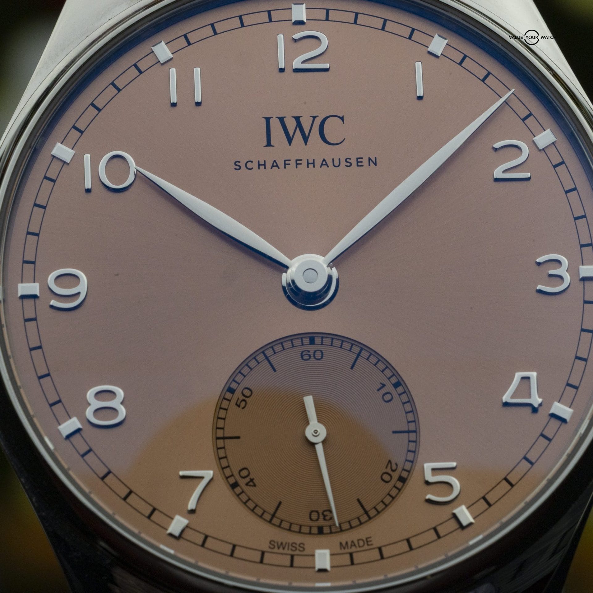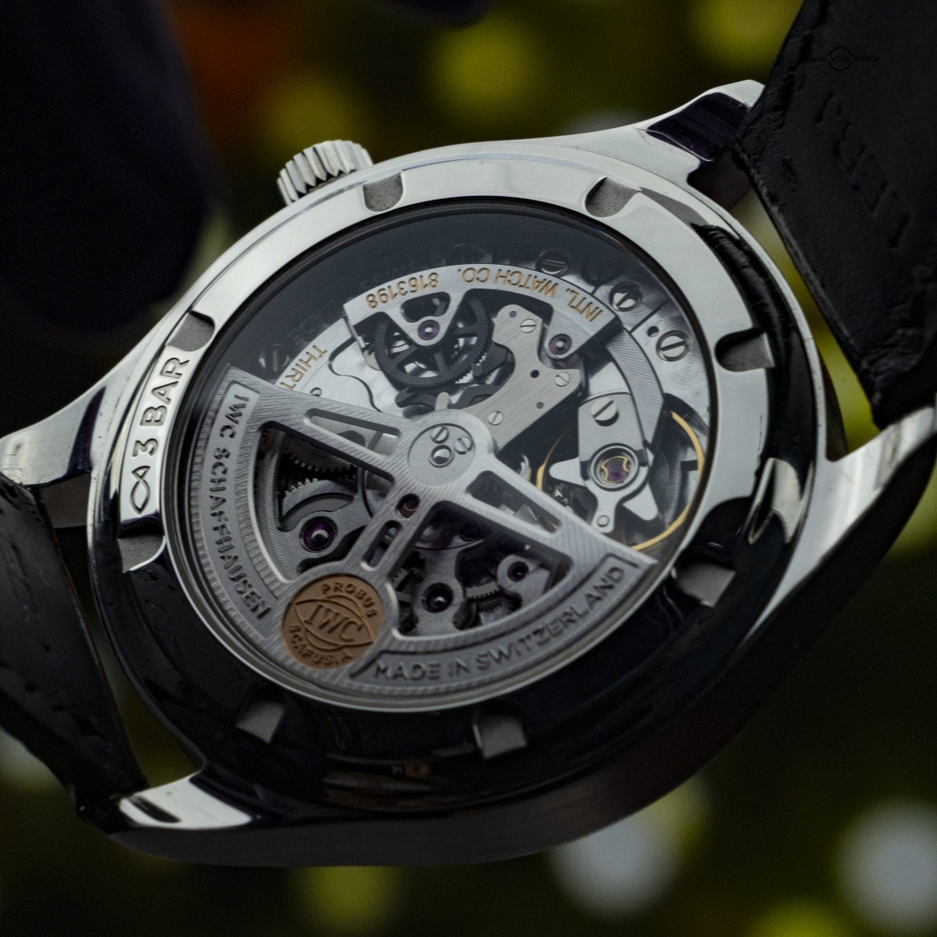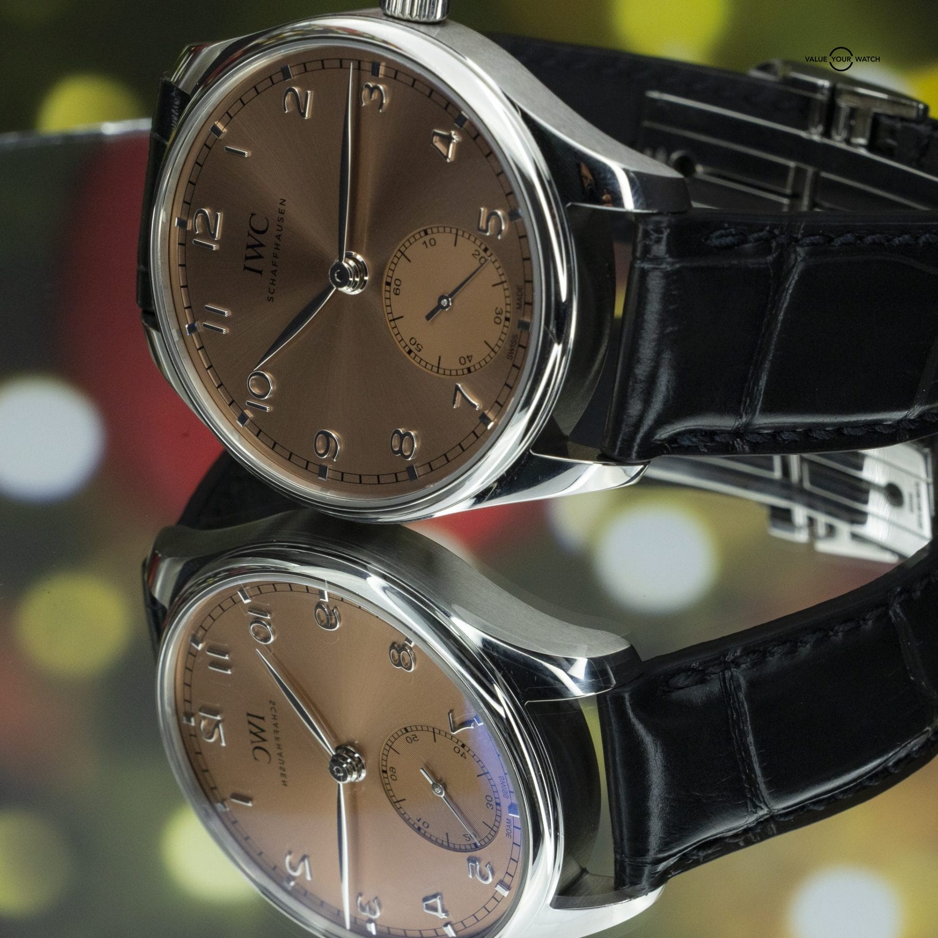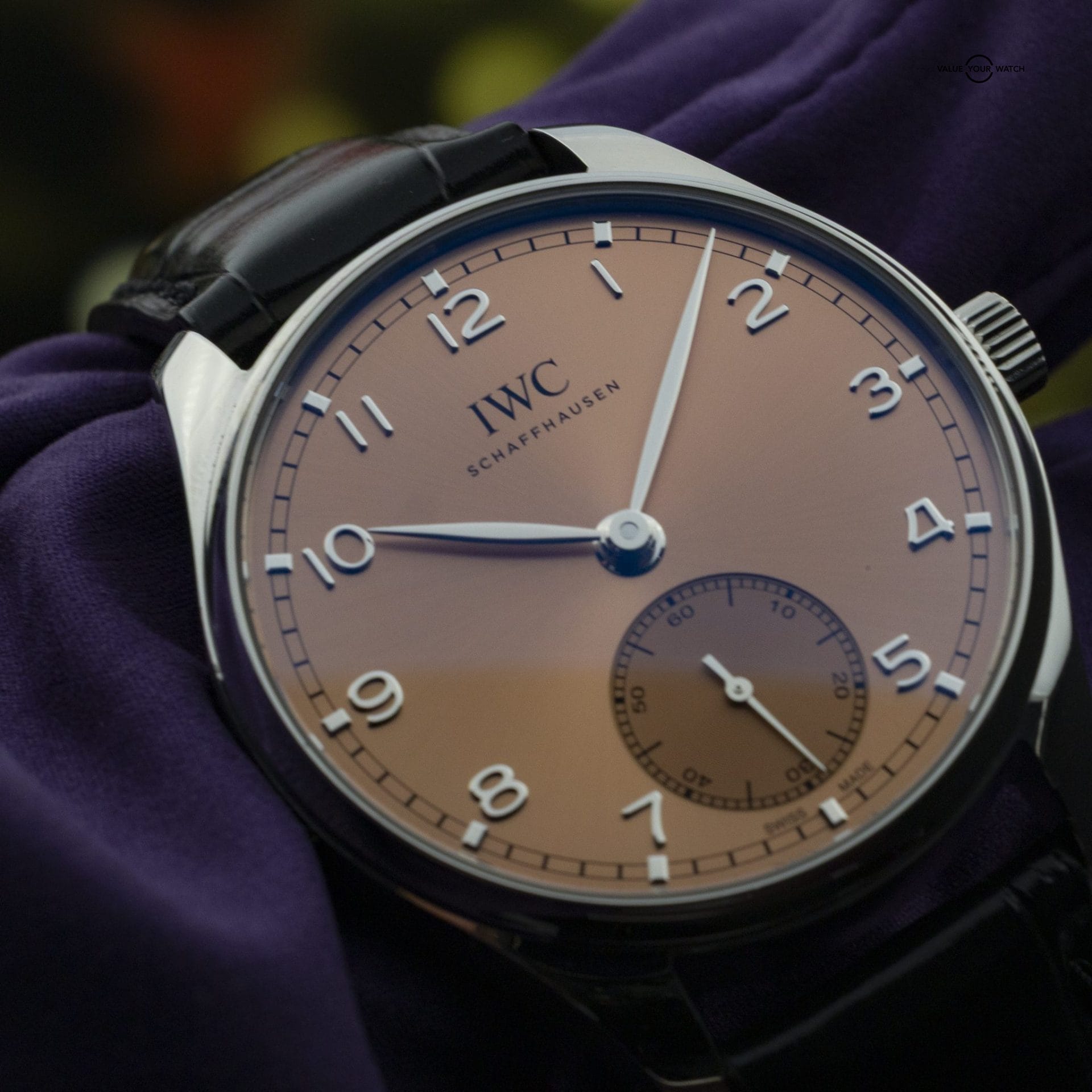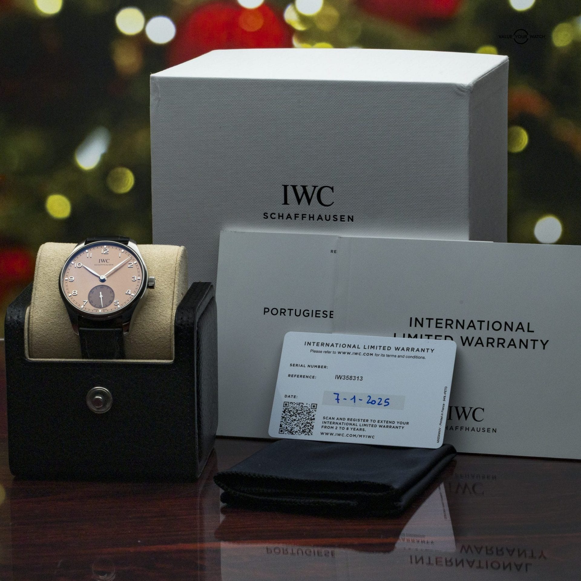 Excellent condition, recently tested for functionality and performance. Stainless steel case shows no notable marks throughout. Polished bezel excellent with no scratches. Sapphire crystal clear without scratches or chips. Large signed crown in excellent condition. Salmon pink dial pristine with no fading or moisture damage—applied Arabic numerals and railroad track markers excellent. Manual-wind movement running accurately with smooth hand-winding action and exceptional 8-day power reserve. Small seconds subdial operating smoothly. Recently tested for functionality and performance. Black leather strap with crocodile embossing in excellent condition throughout. IWC buckle excellent. Complete original presentation set included.