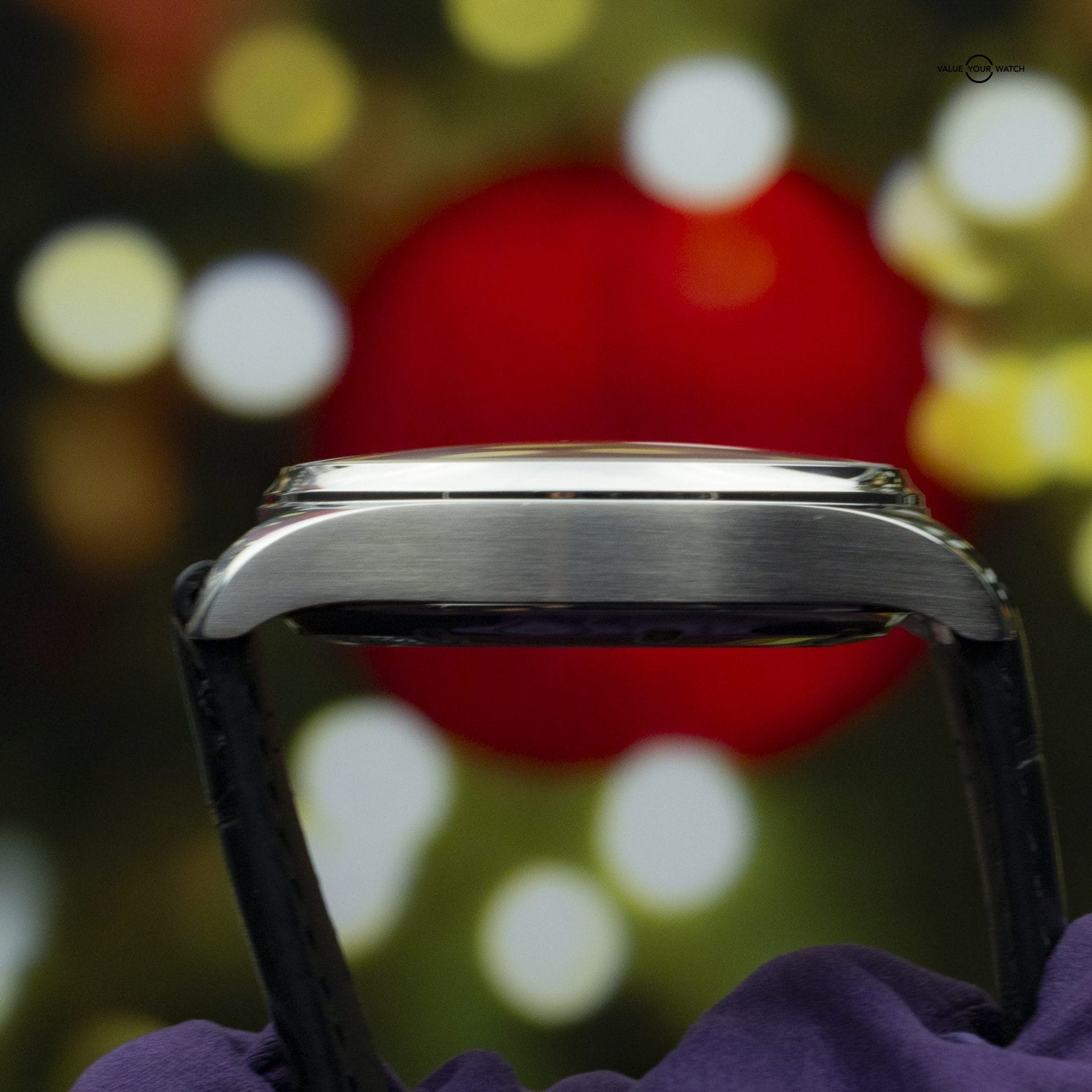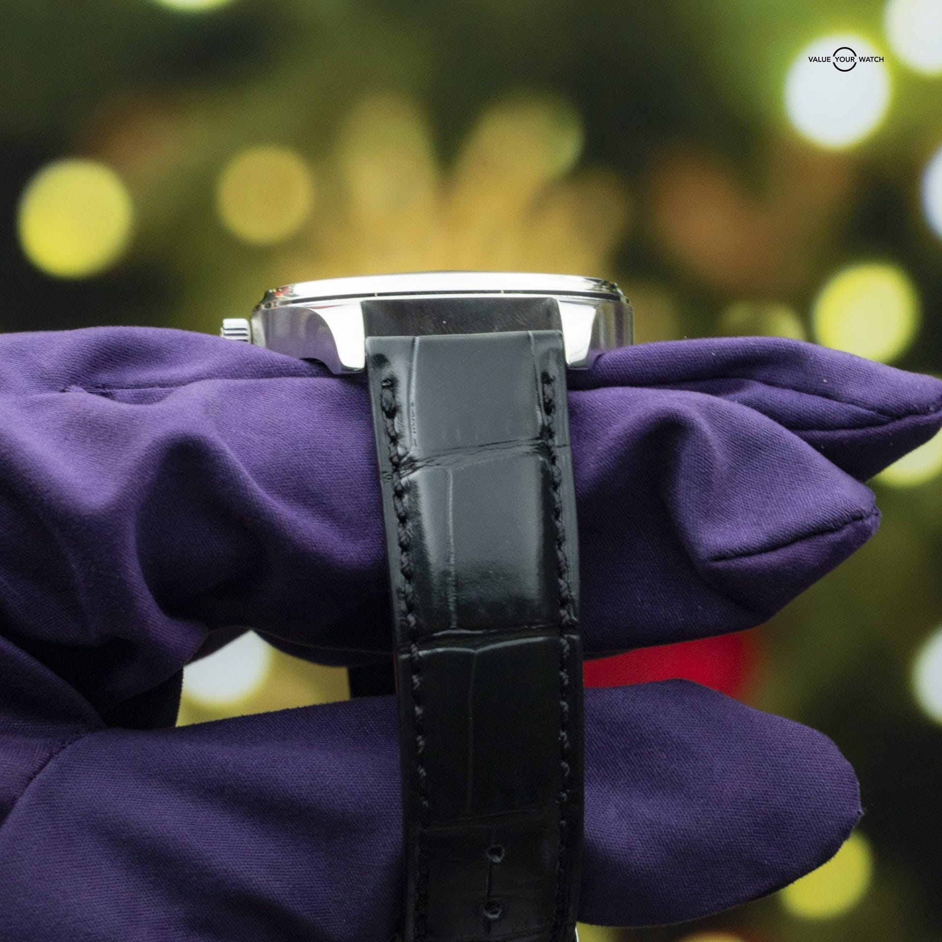This 2024 example maintains excellent condition throughout and has been recently tested for functionality and performance. Case and crystal show no notable wear. The salmon pink dial remains pristine—no fading or moisture damage. Movement running accurately with smooth hand-winding action and small seconds operation. The black leather strap with crocodile embossing is in excellent condition throughout. Complete presentation set with box and papers makes this ready for gifting or personal collection. This is dress watch elegance at its finest.
