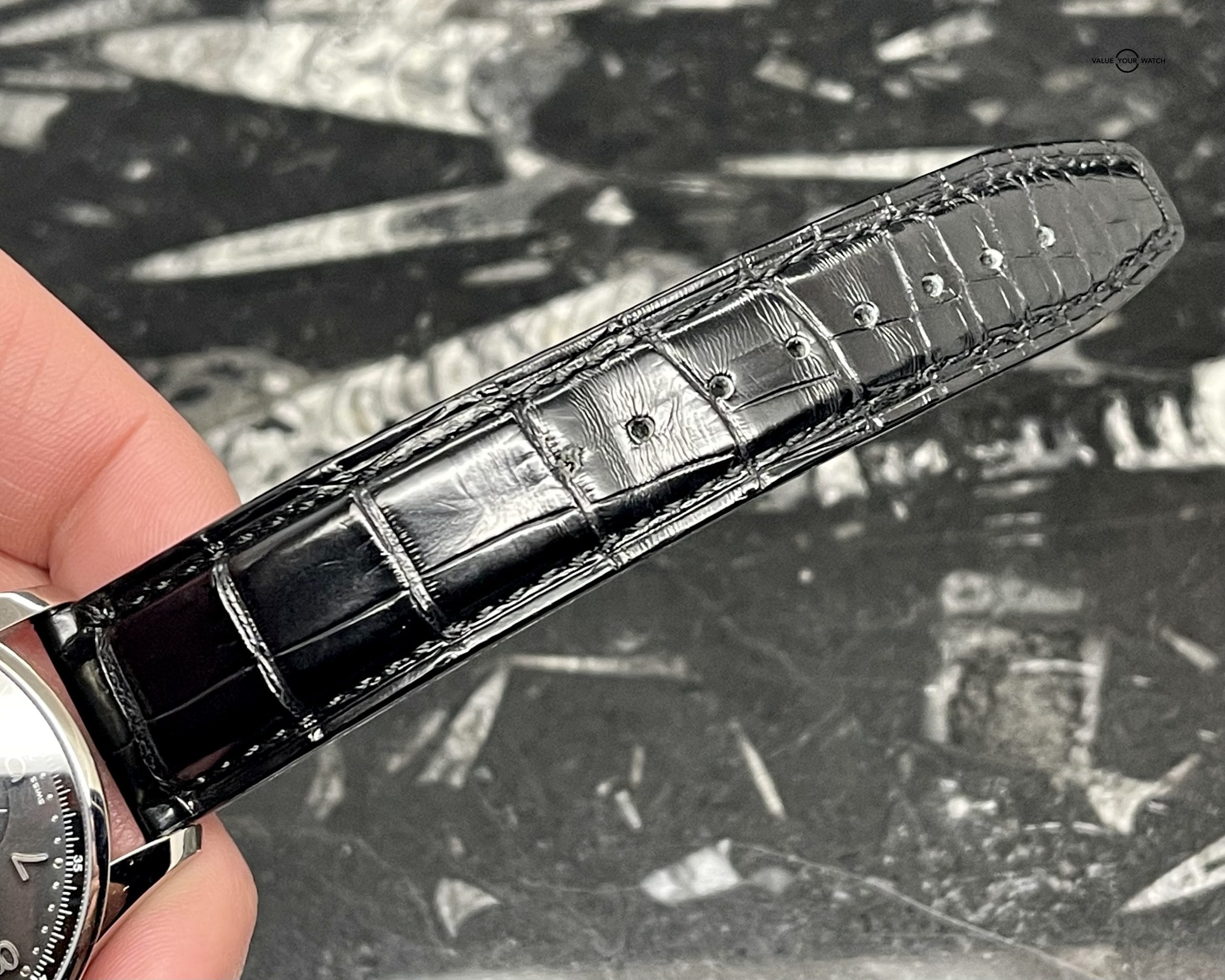 This watch comes with the leather travel box, outer cardboard box, guarantee/ service booklet, and warranty card. There is a very light scratch or two on the case back (couldn’t even get it to show up in photos) and a slight crease in the leather from where it has been buckled, but outside of these two minor blemishes this piece is in nearly unworn condition. The buckle, case, leather, and crystal are all mint. The original retail price of this watch was $16,600. Get this beautiful pre-owned timepiece before it’s gone!