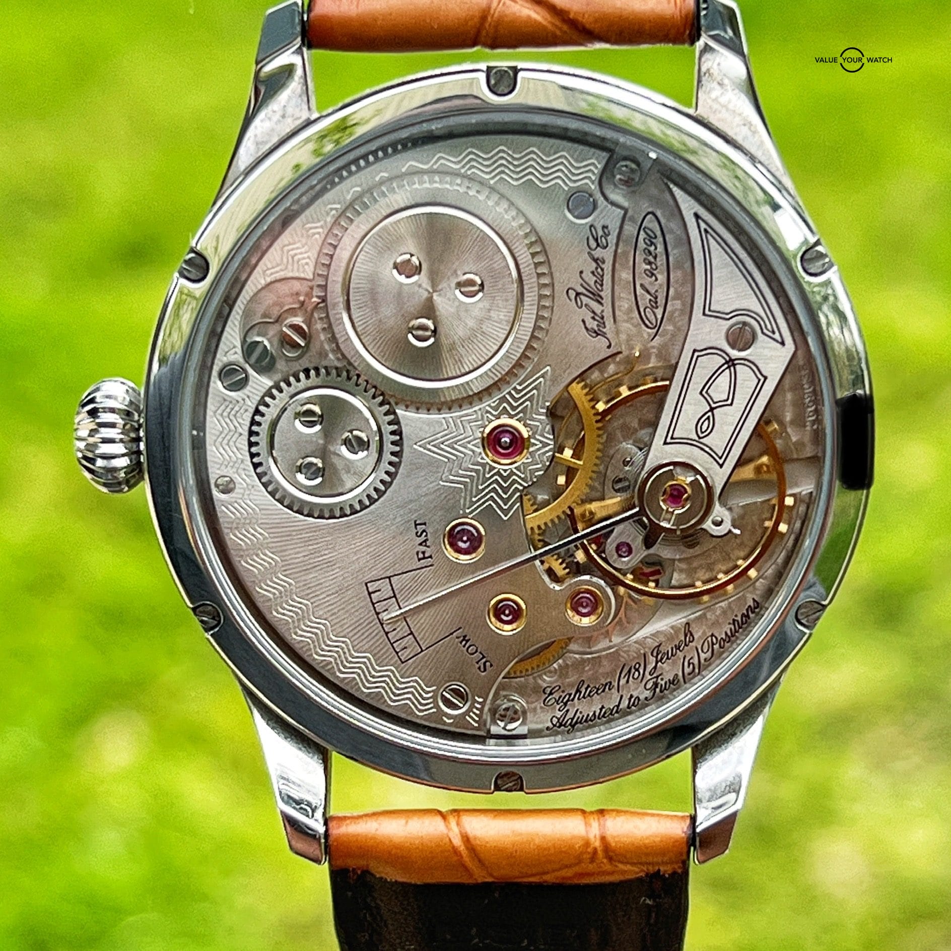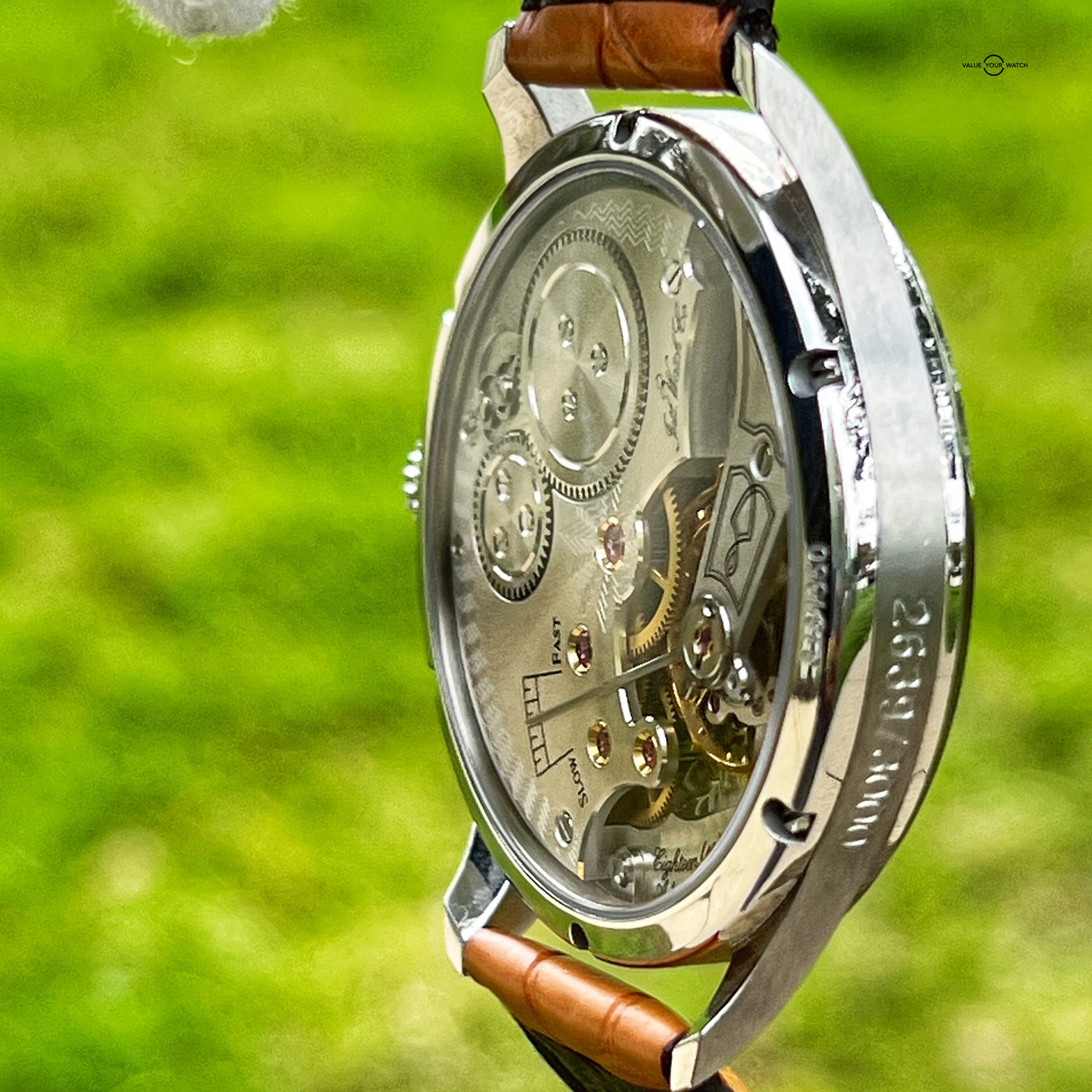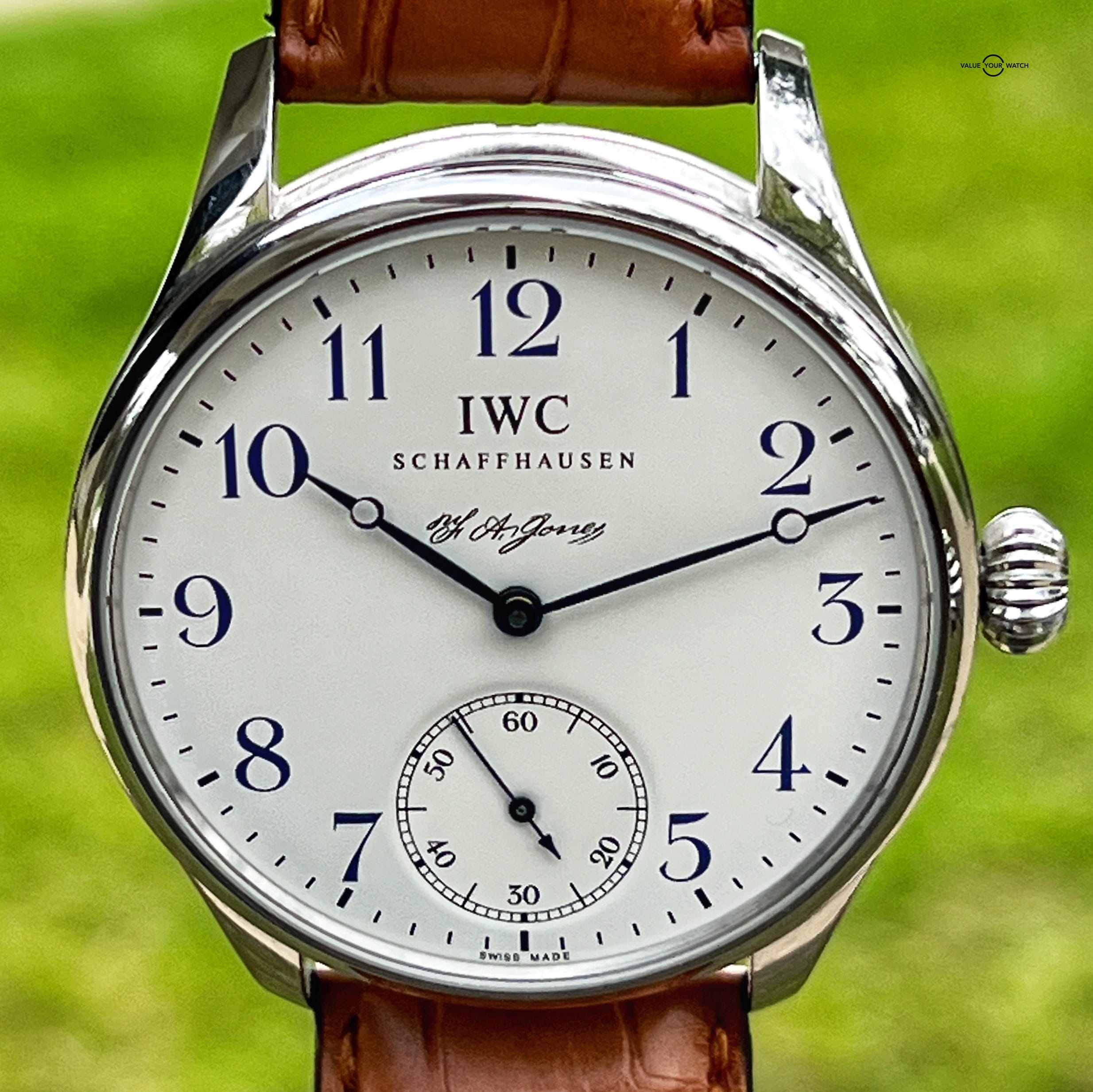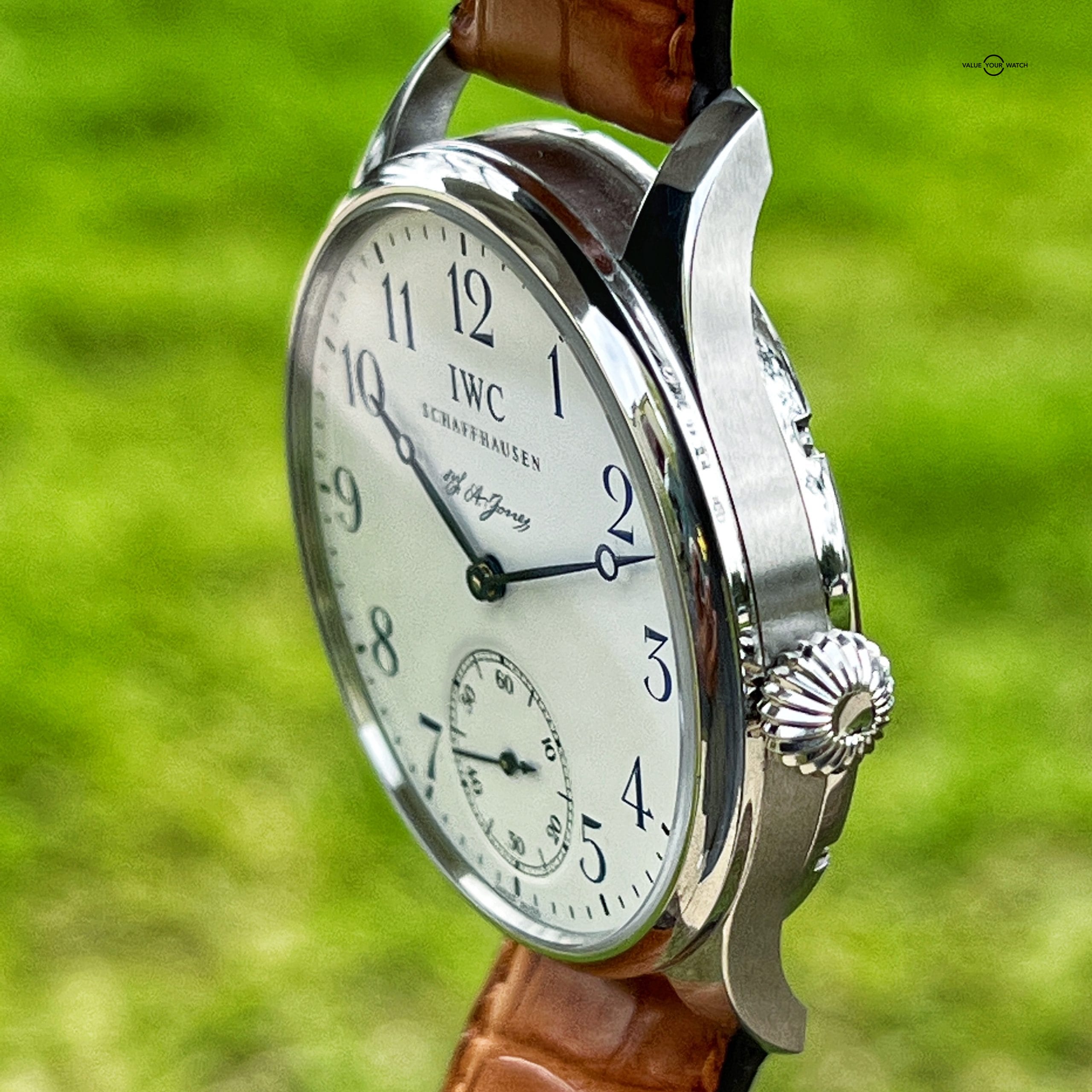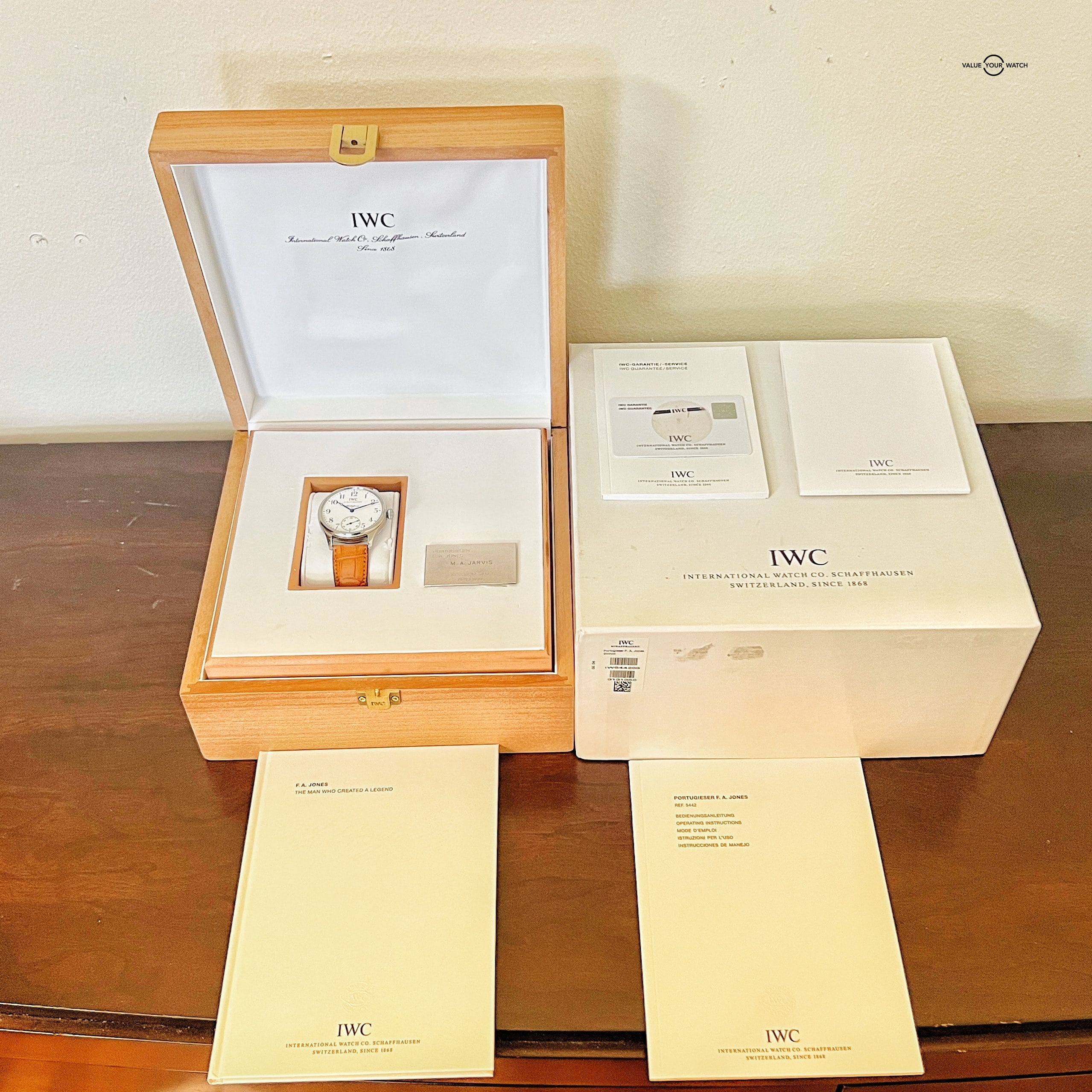 The watch is in excellent condition with no wear marks on the case or crystal. The watch comes as a full set with the inner and outer box, engraved reference plate, unopened cleaning cloth, guarantee service booklet and card, and F. A. Jones historical book.
