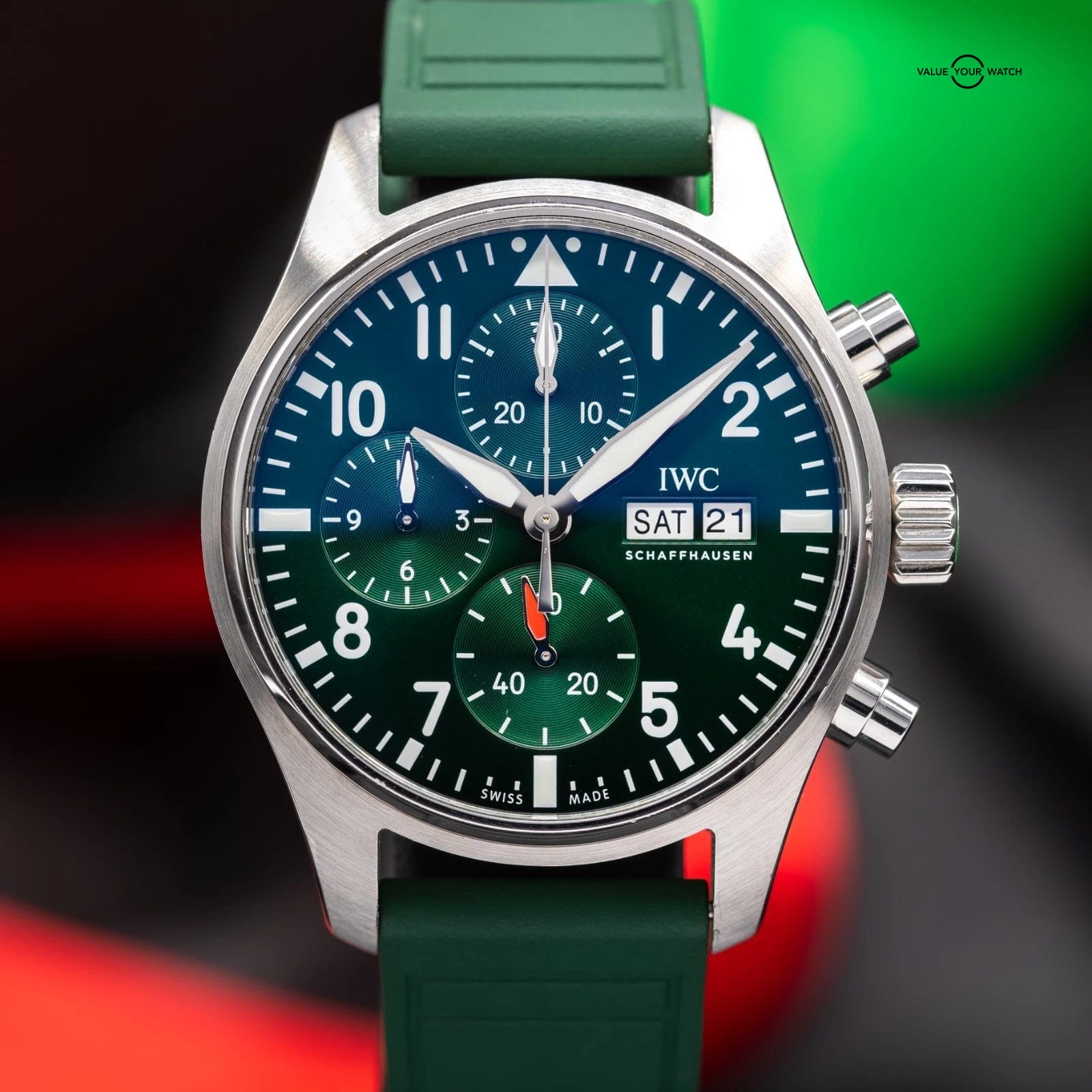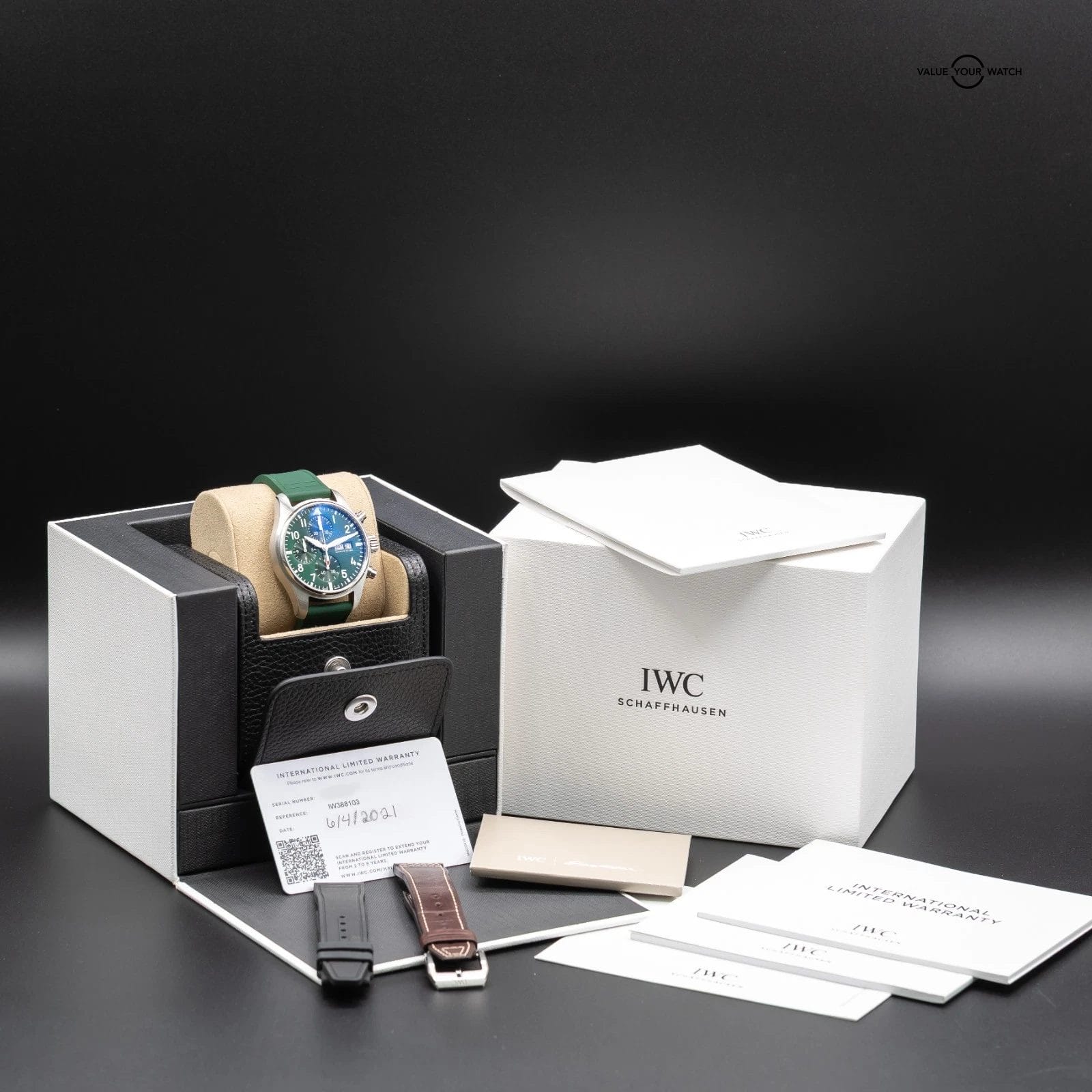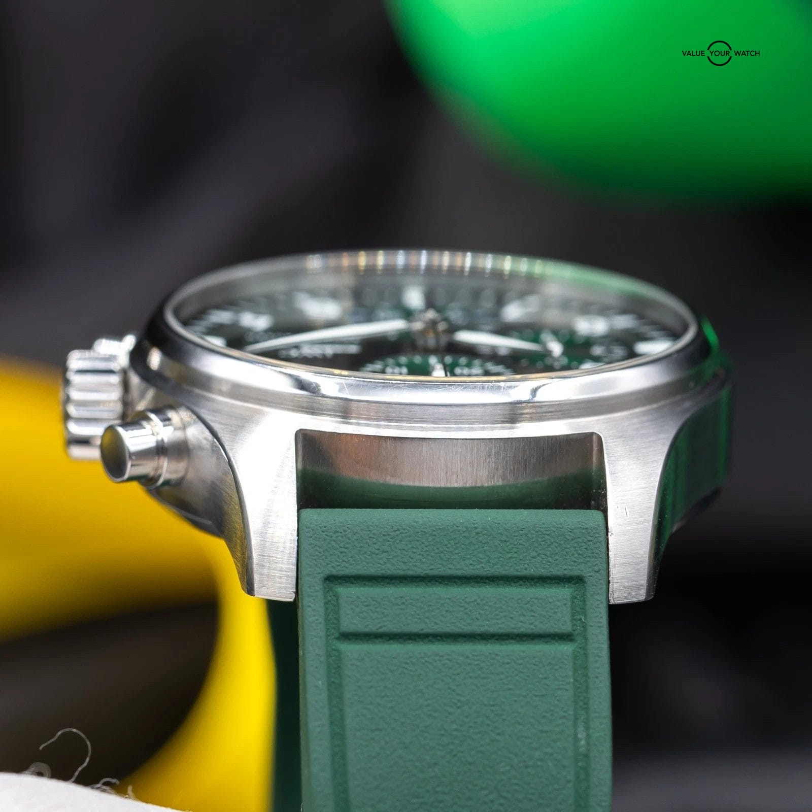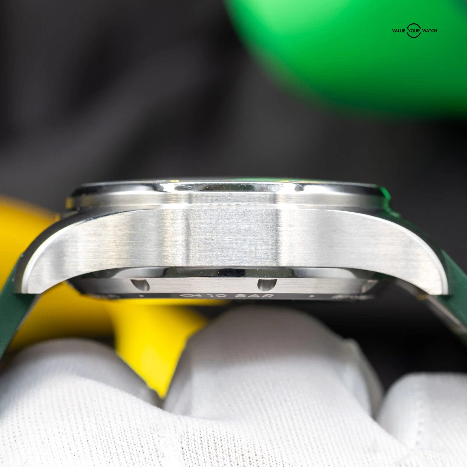 The IWC Pilot’s Watch Chronograph 41 Ref. IW388103 delivers sporty elegance with unmistakable wrist presence. Its stunning deep green sunburst dial turns heads in any light, while the in-house movement and bold chronograph layout offer rugged precision and everyday reliability. Whether you’re headed to the boardroom, the beach, or the cockpit, this watch adapts instantly with three interchangeable straps — green rubber, black rubber, and the original brown leather — thanks to IWC’s Quick-Change system. It’s one of the most versatile luxury chronographs on the market, designed for those who expect style and substance in every setting.