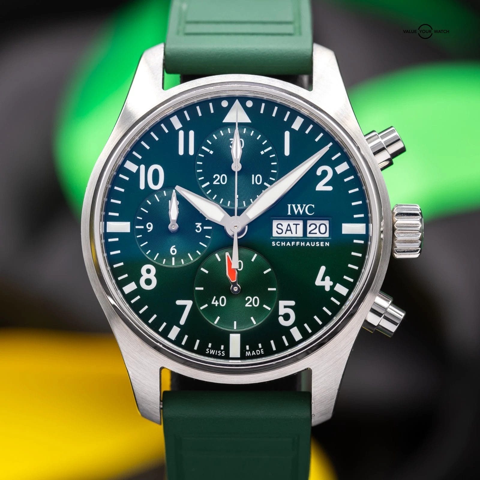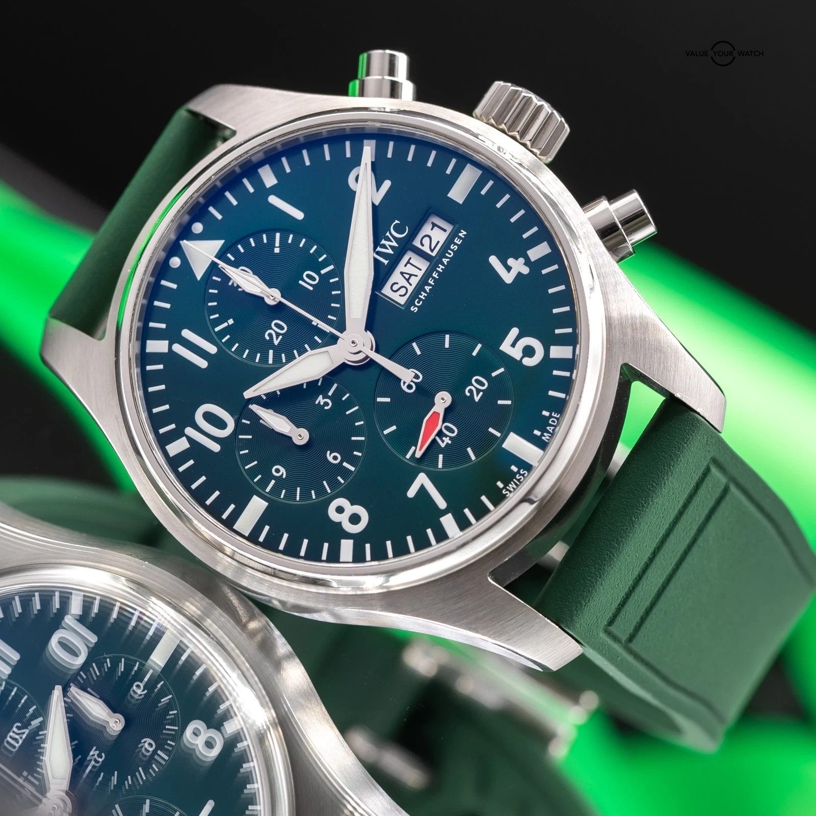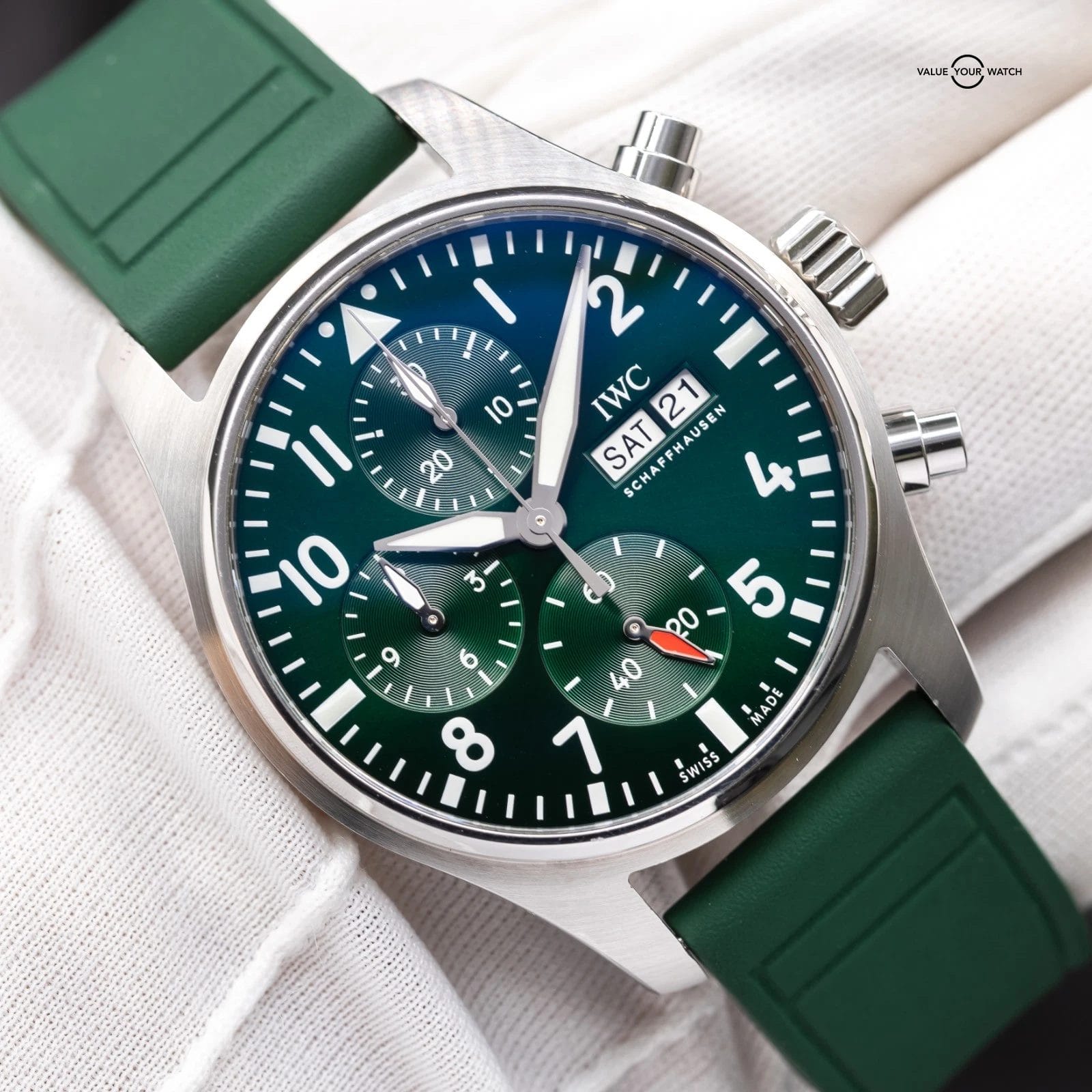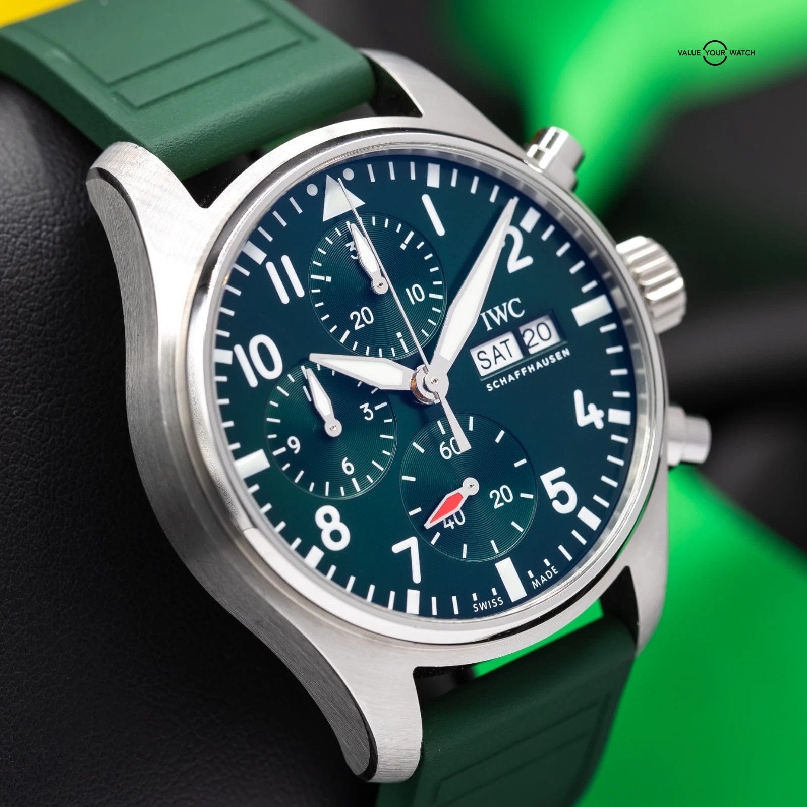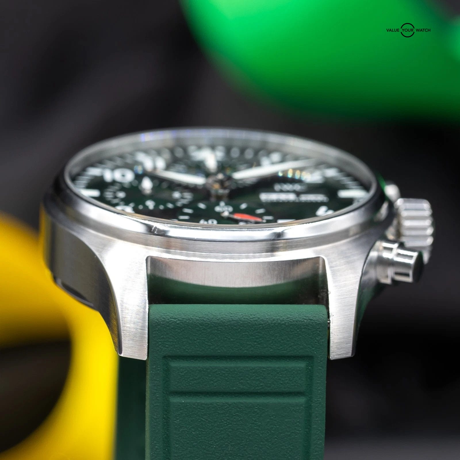 The IWC Pilot’s Watch Chronograph 41 Ref. IW388103 delivers sporty elegance with unmistakable wrist presence. Its stunning deep green sunburst dial turns heads in any light, while the in-house movement and bold chronograph layout offer rugged precision and everyday reliability. Whether you’re headed to the boardroom, the beach, or the cockpit, this watch adapts instantly with three interchangeable straps — green rubber, black rubber, and the original brown leather — thanks to IWC’s Quick-Change system. It’s one of the most versatile luxury chronographs on the market, designed for those who expect style and substance in every setting.