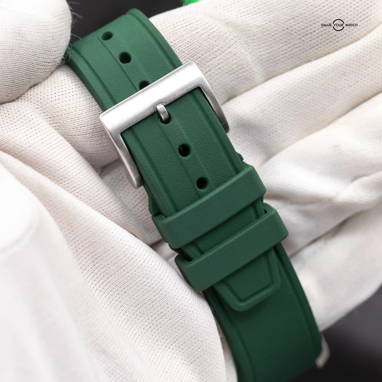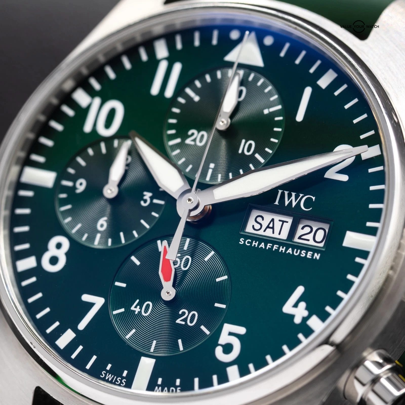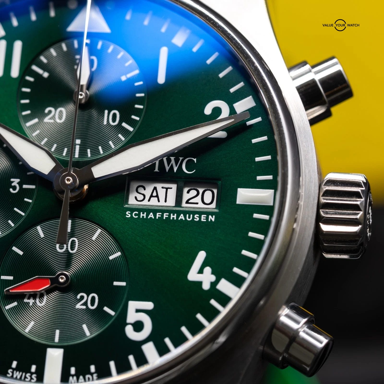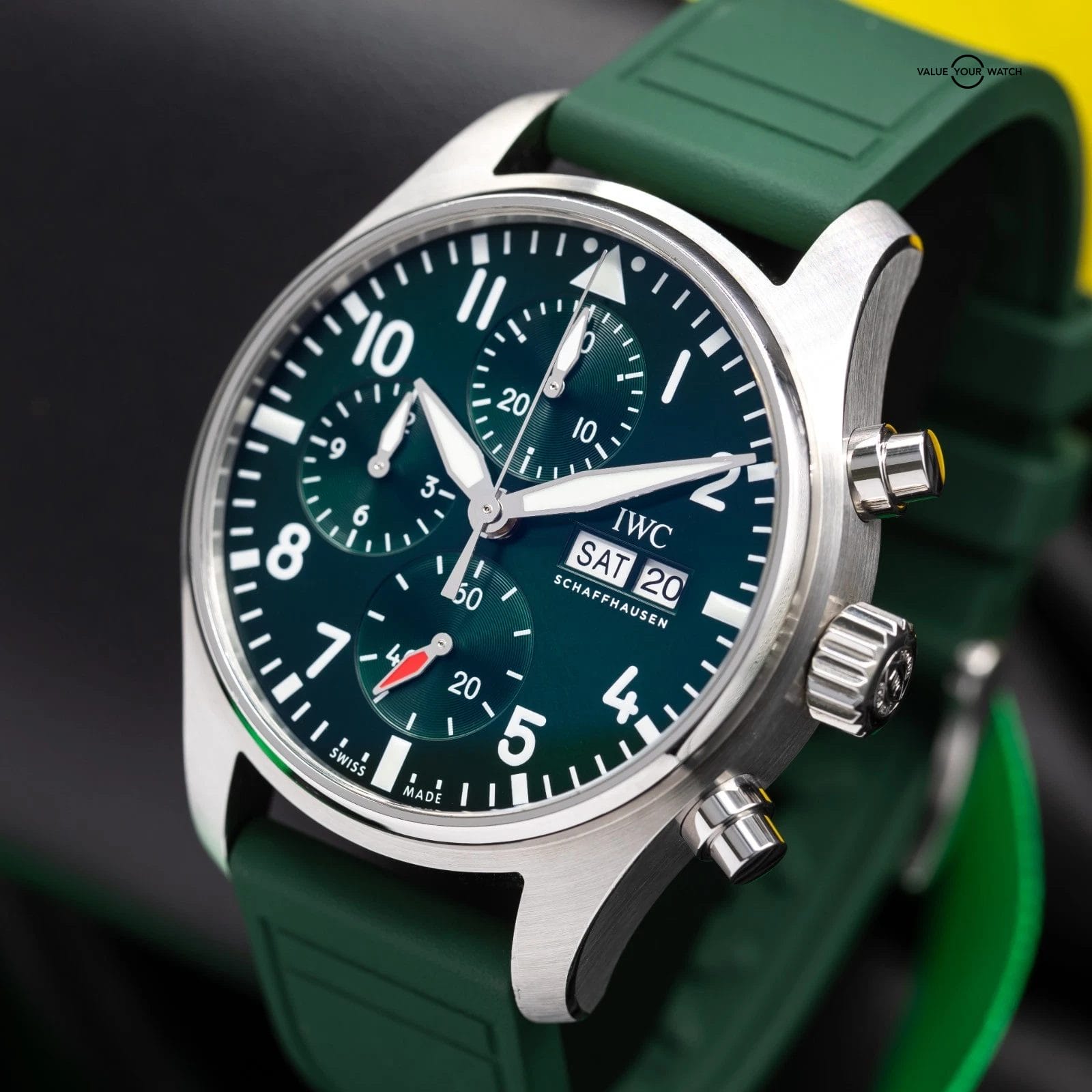 The IWC Pilot’s Watch Chronograph 41 Ref. IW388103 delivers sporty elegance with unmistakable wrist presence. Its stunning deep green sunburst dial turns heads in any light, while the in-house movement and bold chronograph layout offer rugged precision and everyday reliability. Whether you’re headed to the boardroom, the beach, or the cockpit, this watch adapts instantly with three interchangeable straps — green rubber, black rubber, and the original brown leather — thanks to IWC’s Quick-Change system. It’s one of the most versatile luxury chronographs on the market, designed for those who expect style and substance in every setting.