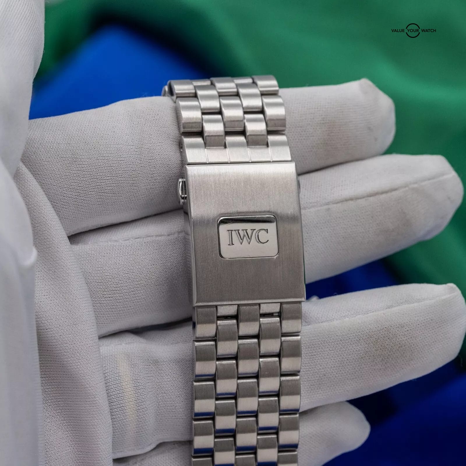 The IWC Schaffhausen Pilot Chronograph IW377710 features a 43mm steel case paired with a matching smooth fixed bezel. The black dial is adorned with luminescent-coated Arabic numerals and hands providing optimal readability in any environment. With three chronograph subdials positioned at 6, 9, and 12 o’clock, one of which is accentuated with a red hand for added flair. This timepiece also includes a date window with a day indicator at 3 o’clock, offering additional functionality. Completed with stainless steel “jubilee style” bracelet and locking clasp.