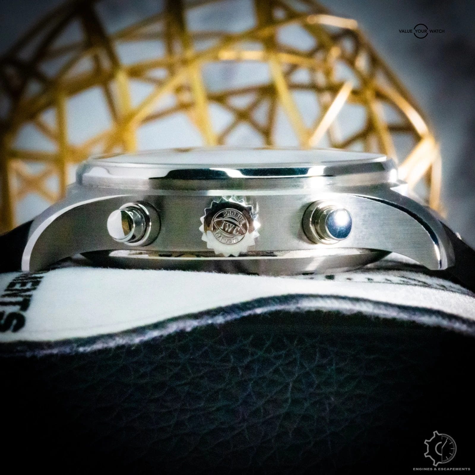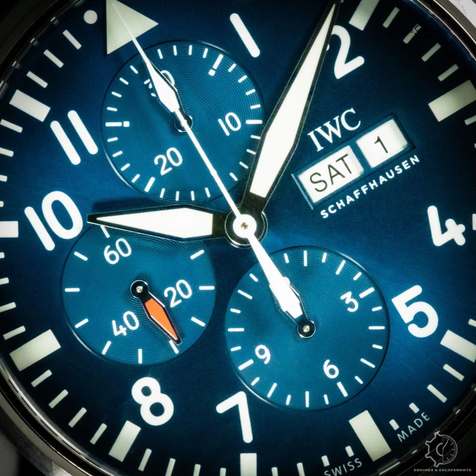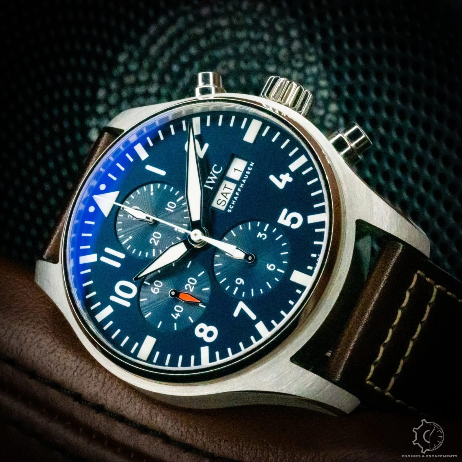 The IWC Pilot’s Chronograph “Le Petit Prince” IW377714 is a poetic blend of aviation heritage and timeless elegance. Its deep sunburst blue dial, signature to the “Le Petit Prince” line, shimmers beautifully in changing light, adding depth and character to the classic pilot’s layout. The 43mm stainless steel case, bold Arabic numerals, and luminous hands evoke IWC’s storied connection to flight instruments, offering both legibility and presence on the wrist.