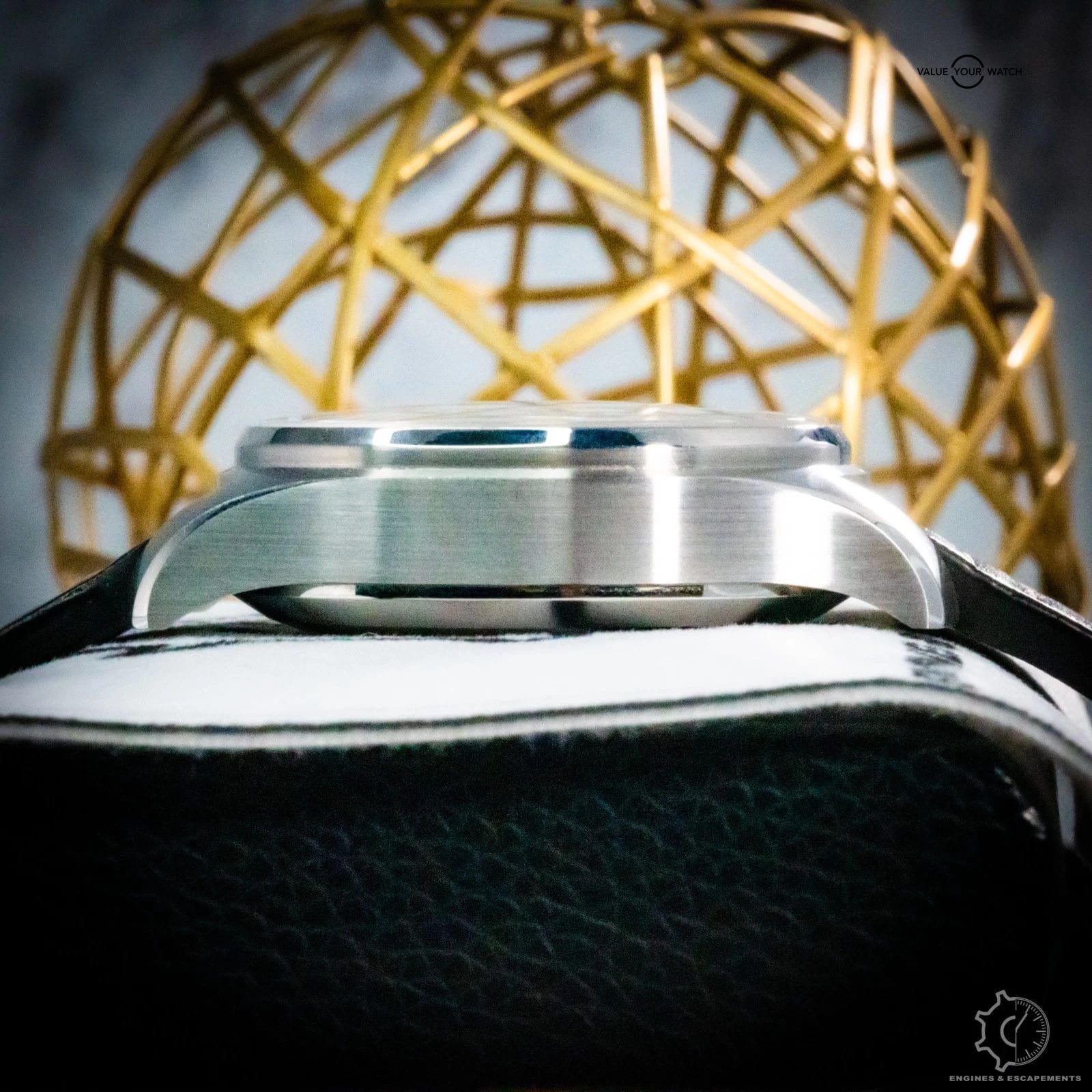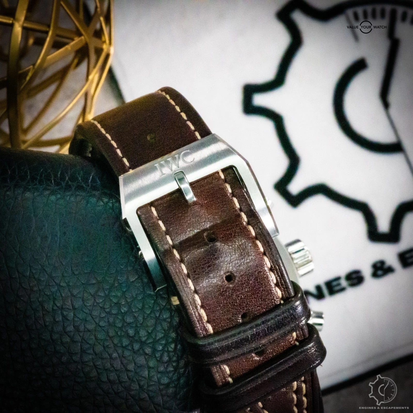 Powered by the reliable self-winding Caliber 79320, this chronograph delivers precision timing and a 44-hour power reserve, combining performance with enduring craftsmanship. The brown calfskin strap, inspired by vintage aviation gear, completes the look with understated sophistication.