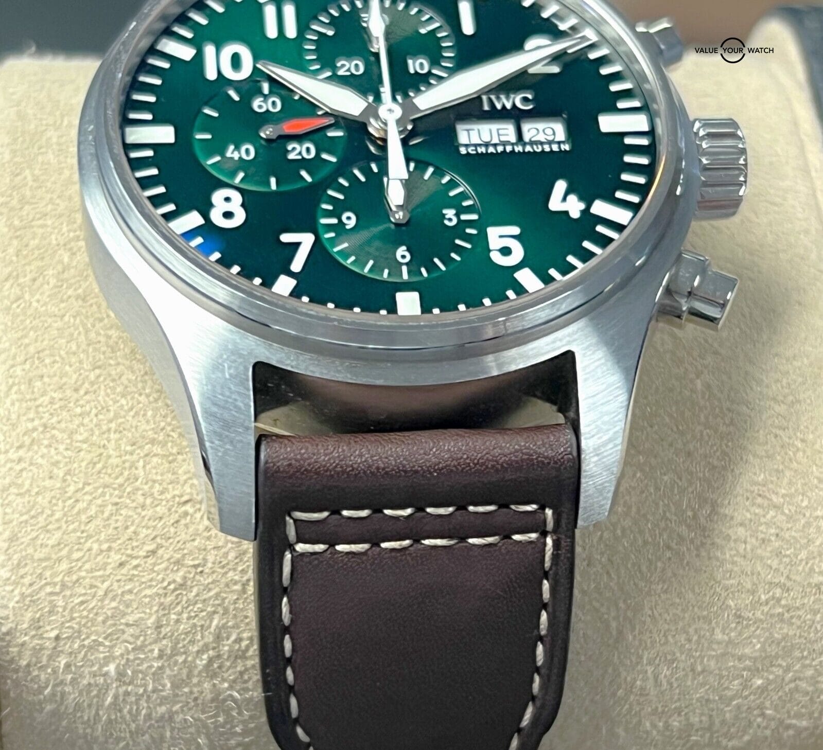 Comprehensive Listing: When selling the IWC Pilot’s Chronograph Racing Green Dial 43mm IW377726 online, provide a comprehensive listing that outlines the watch’s features, condition, and any unique attributes. Highlight the racing green dial.