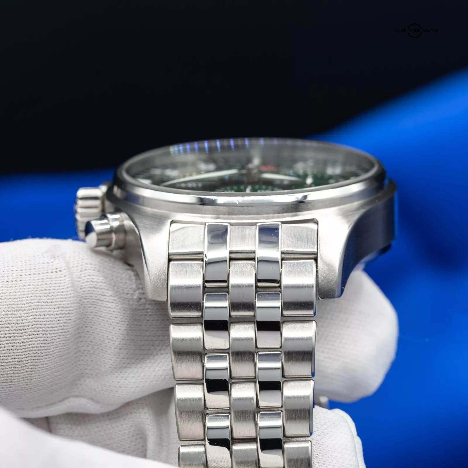 This watch has a strong and commanding presence, thanks to its carefully designed 41mm steel case and bezel. The stunning green dial showcases luminous hands and Arabic hour markers, alongside three chronograph subdials at 6, 9, and 12 o’clock, as well as practical day and date windows at 3 o’clock. With its water resistance of up to 100 meters, you can enjoy water related activities with confidence.