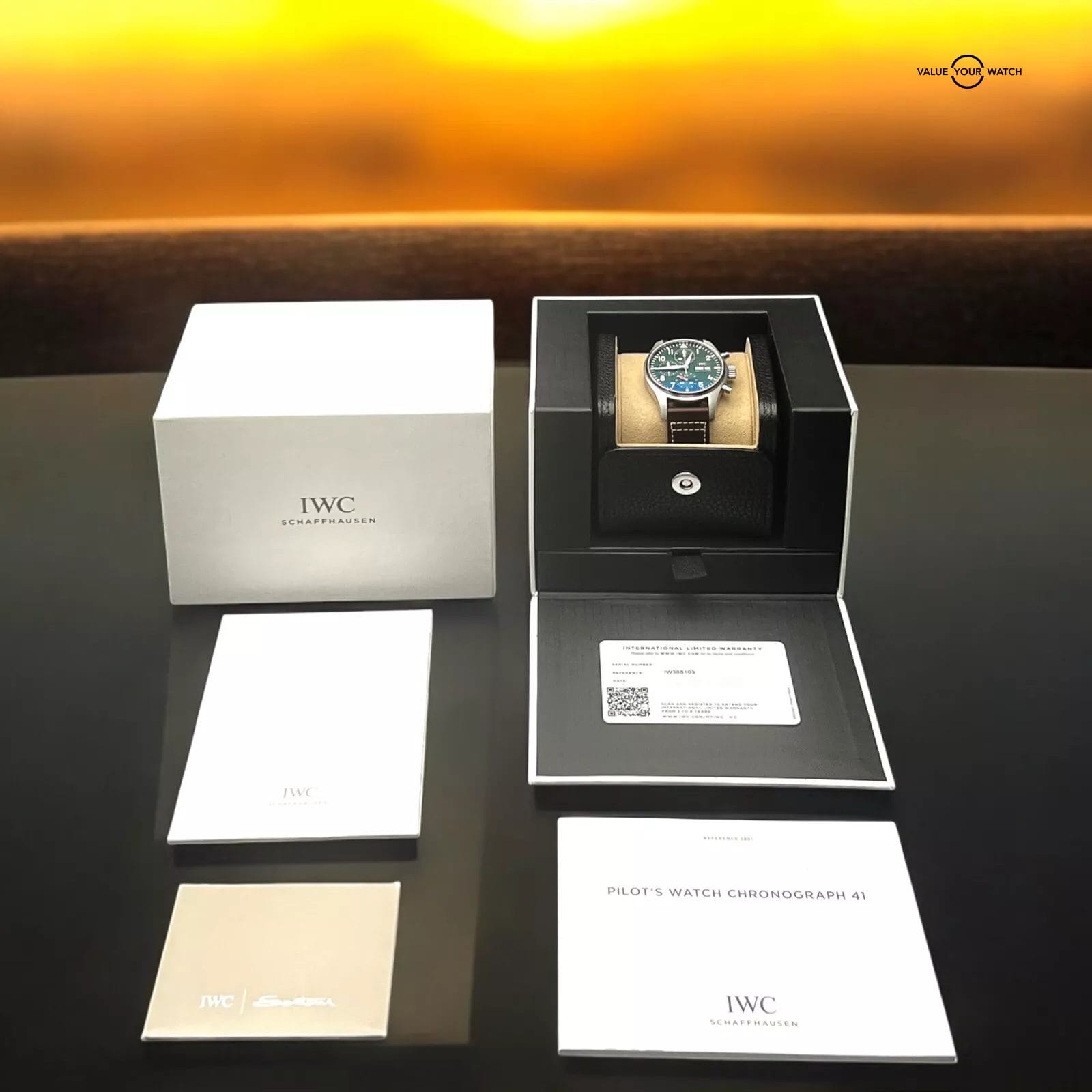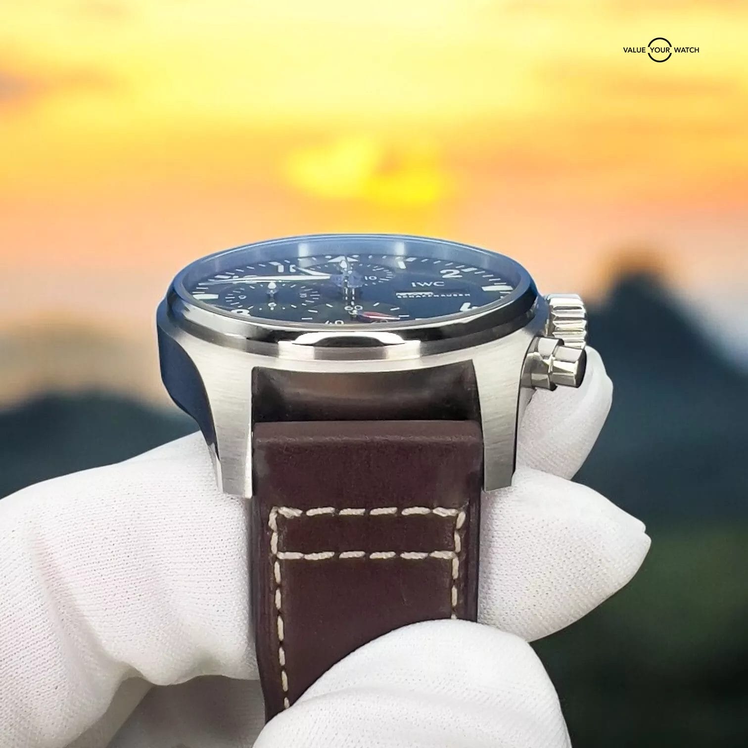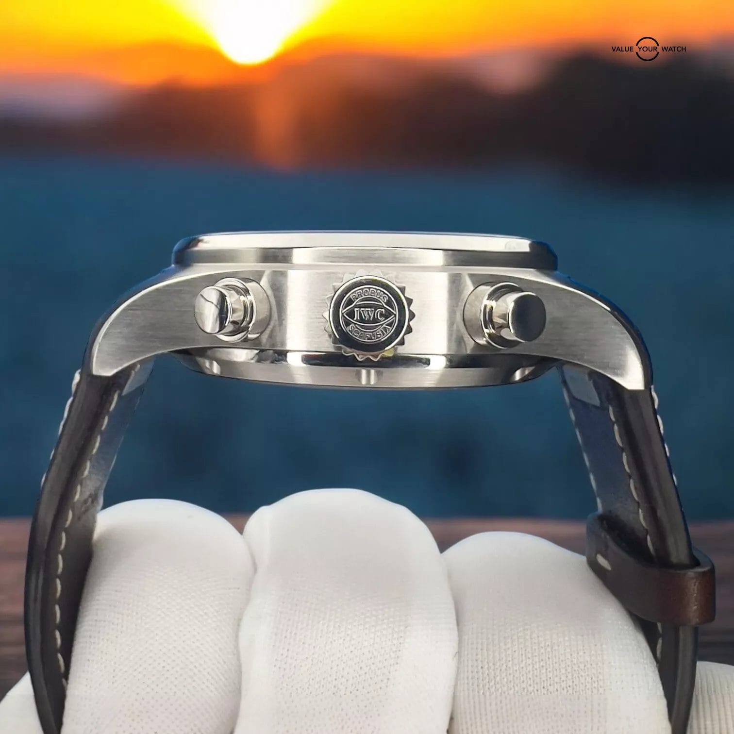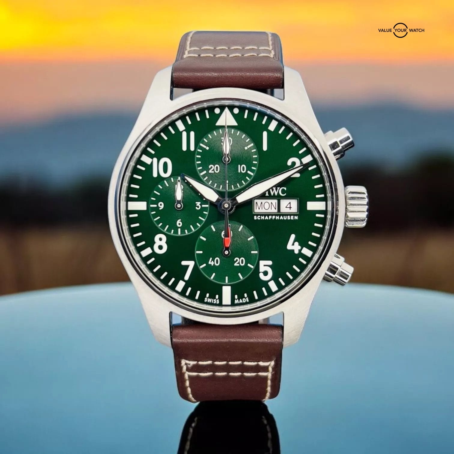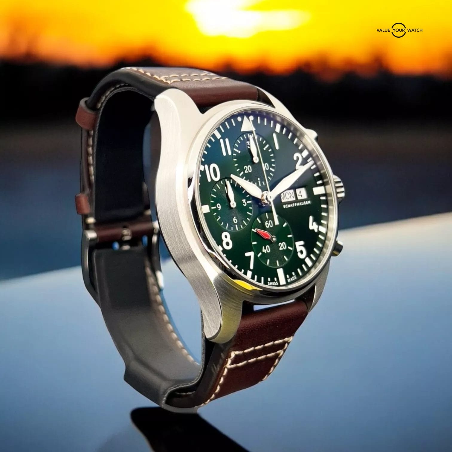 The 2024 IWC Pilot Chronograph (IW388103) is an iconic timepiece that has become a symbol of adventure and exploration, accompanying pilots on their daring journeys through the skies. Exemplifying a harmonious blend of style and functionality, this timepiece features a resilient 41mm steel case housing a captivating green dial graced by Arabic numerals. The steel bezel seamlessly complements the case, while the leather strap adds a touch of sophistication to its overall design. Fueled by the automatic 69385 movement, this watch offers precision and reliability, boasting up to a 46-hour power reserve. With a water resistance of up to 100 meters, this model stands as a testament to both aesthetic appeal and practical durability, making it a versatile and dependable accessory for any occasion.