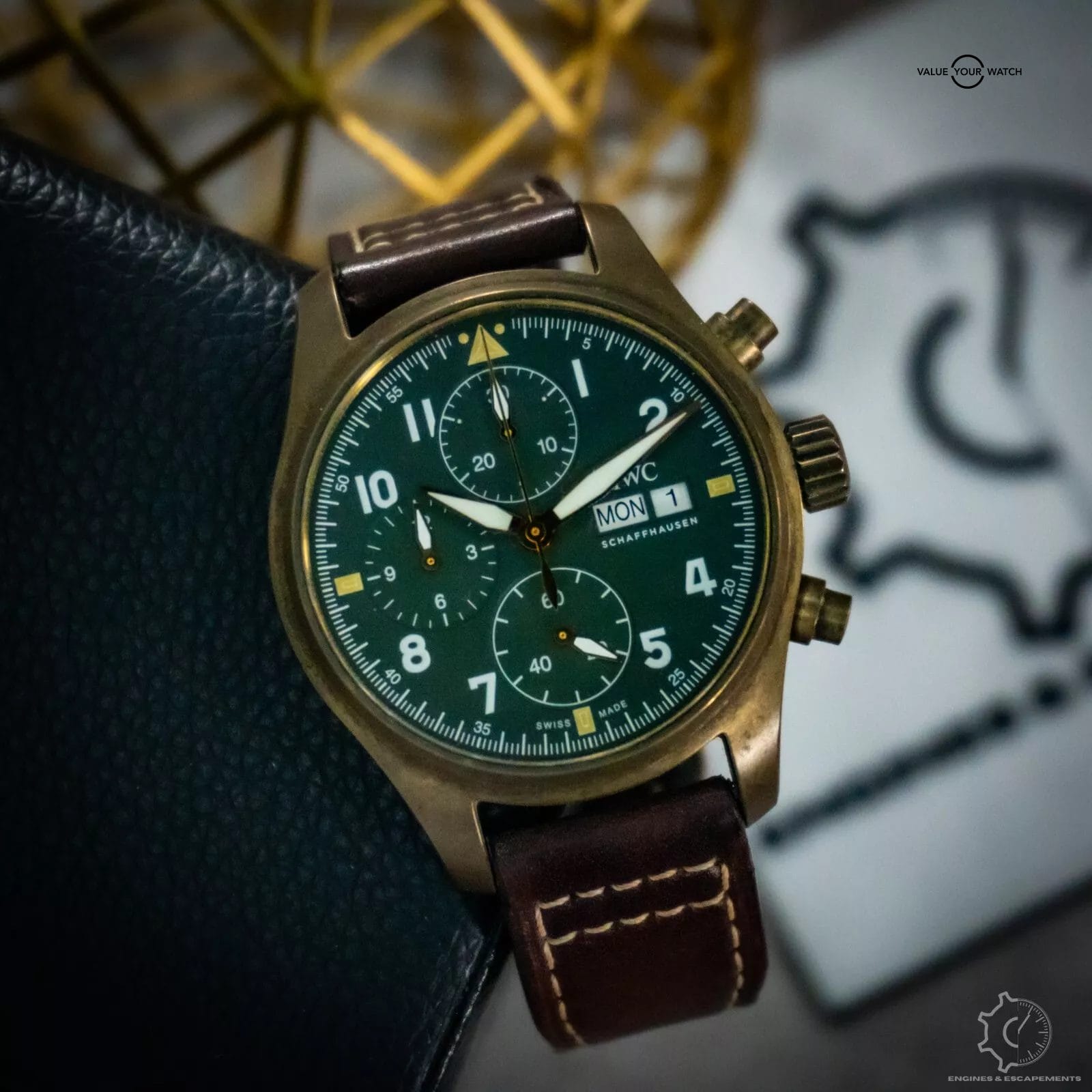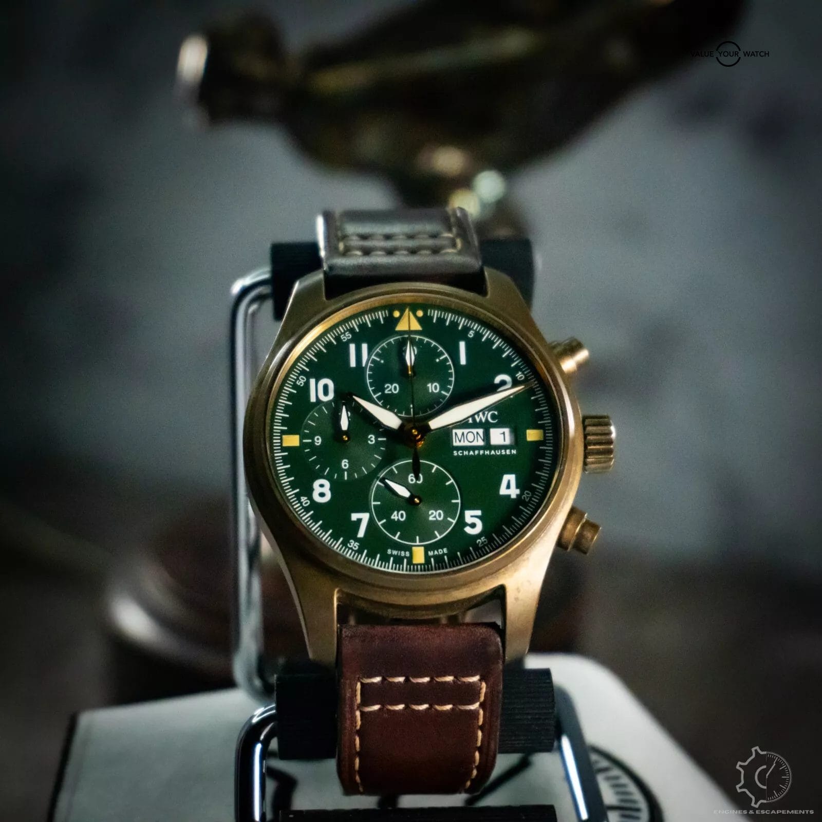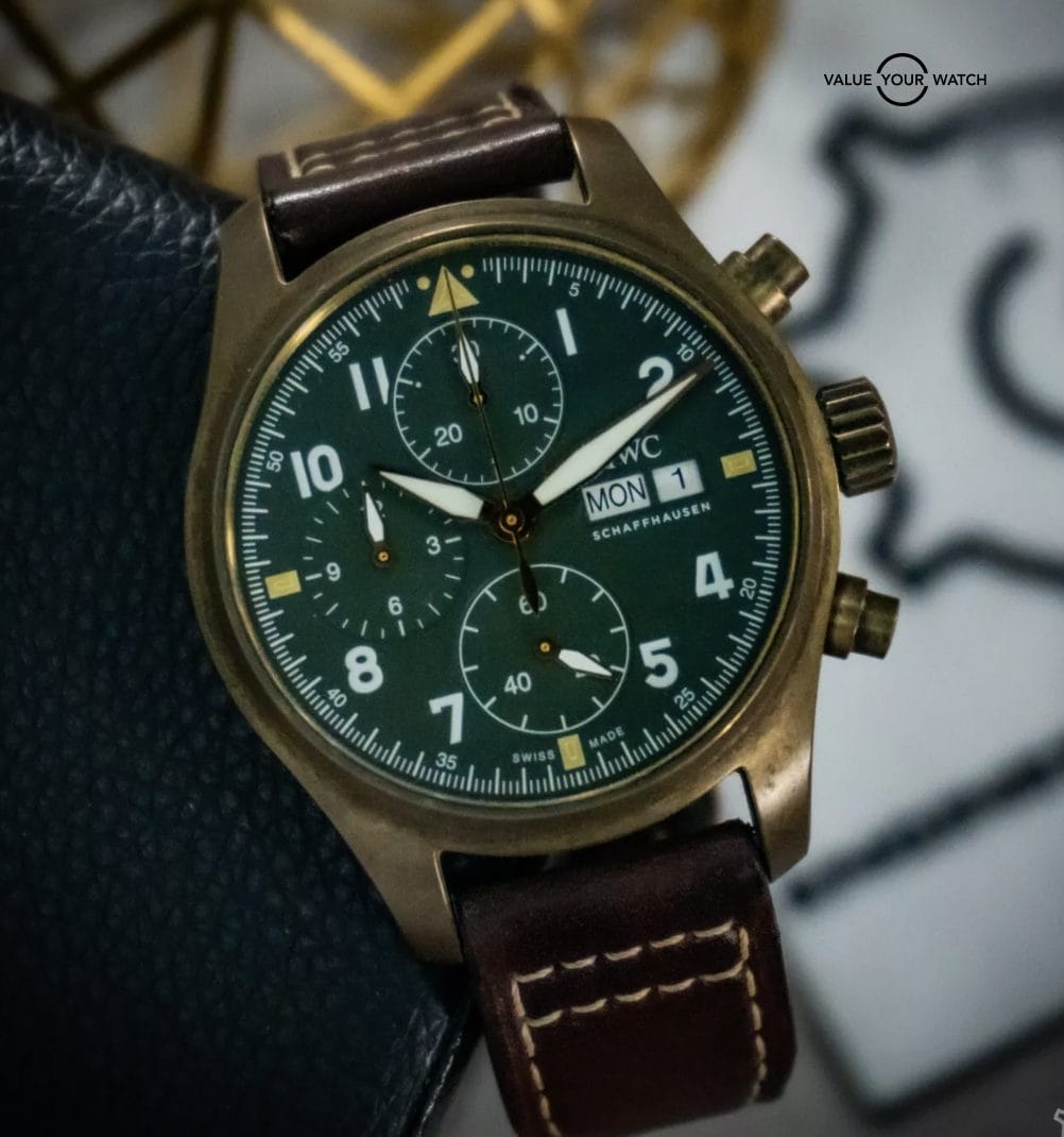 Introducing the IWC Pilot Spitfire Chronograph in bronze with a stunning green dial. A stunning timepiece that combines precision engineering with classic aviation-inspired design.