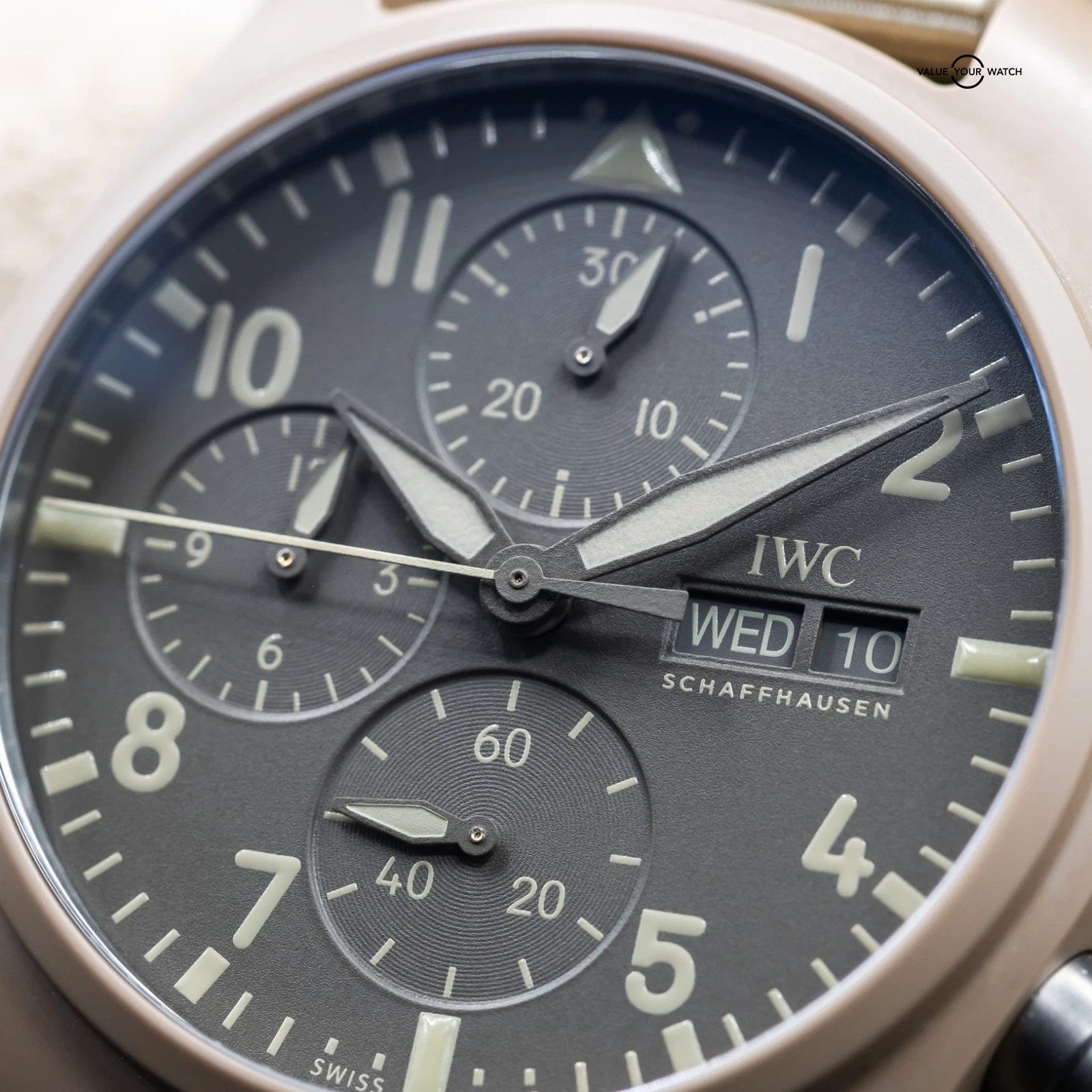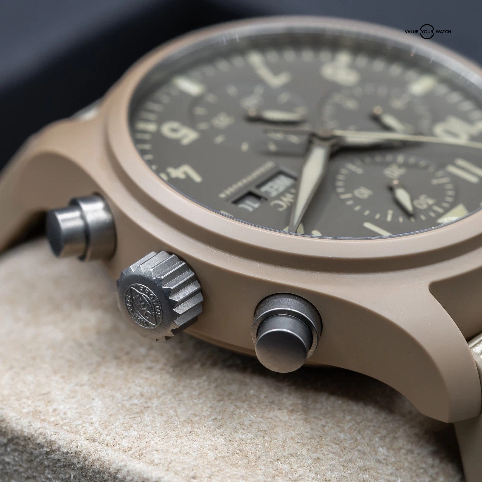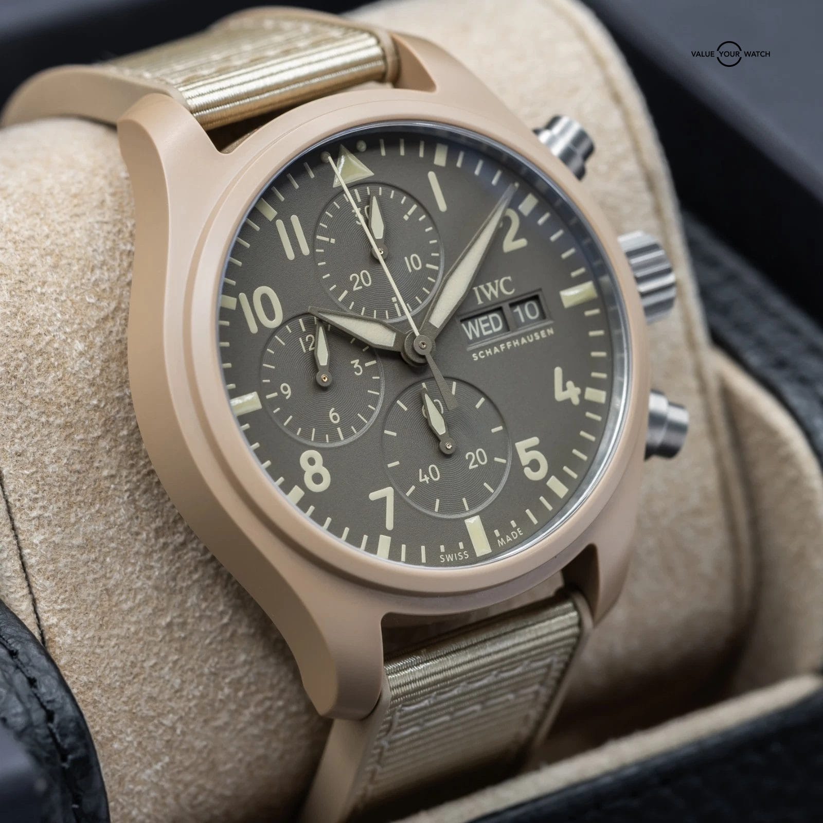 Up for sale here is an excellent example of one of the best offerings by IWC- the classic Pilot’s Chronograph with Day Date complications, fully cased in the Desert Mojave sand colored ceramic. Ref. IW389402