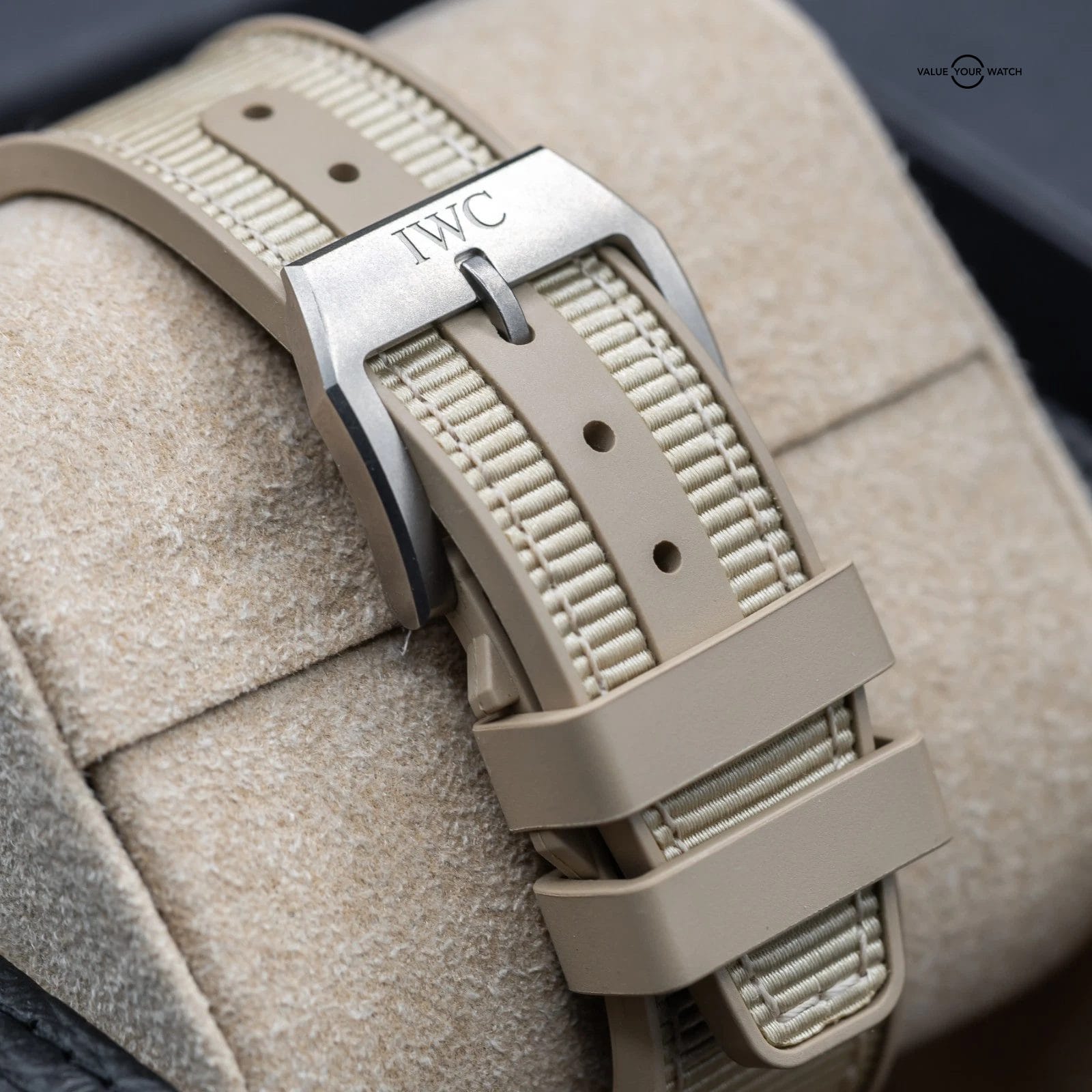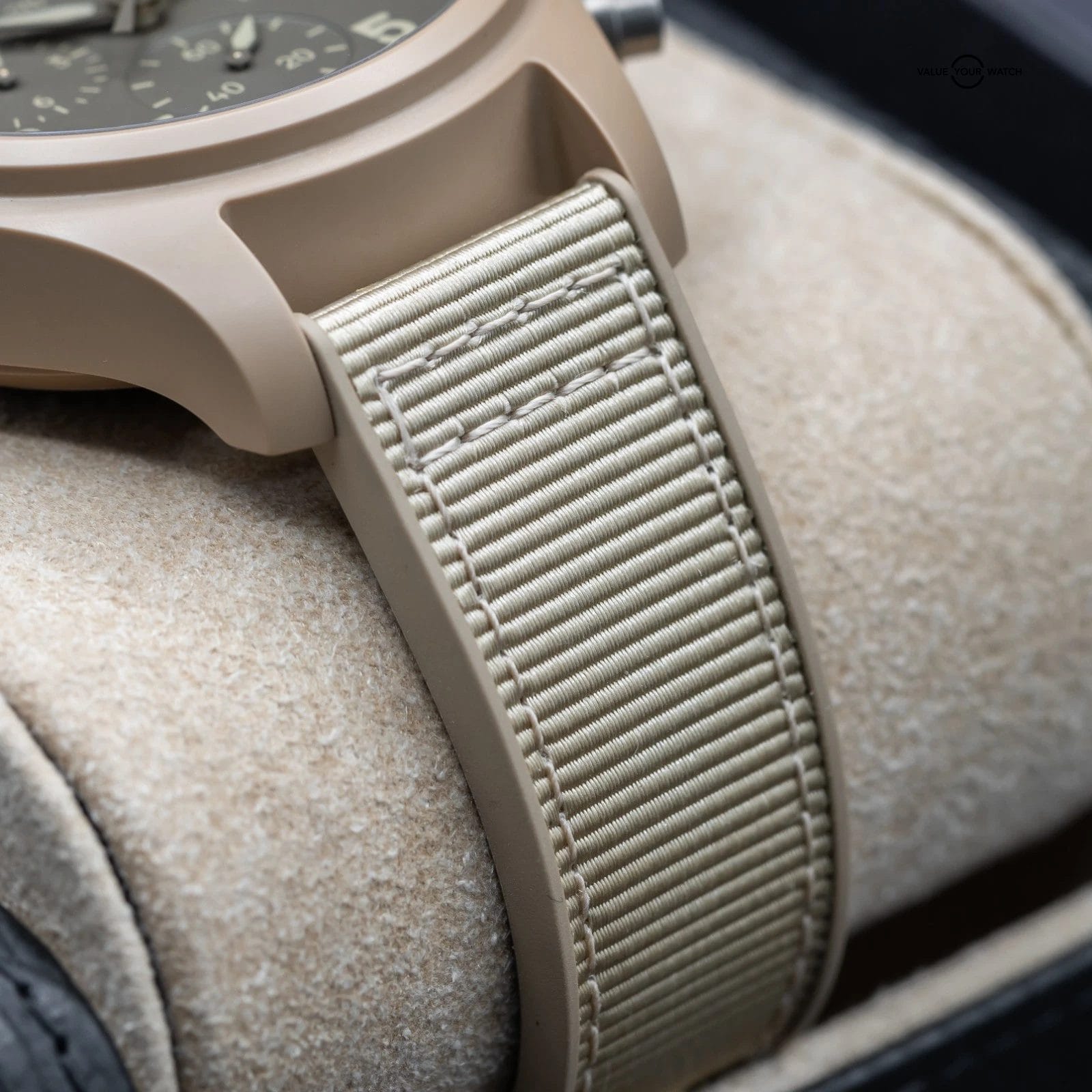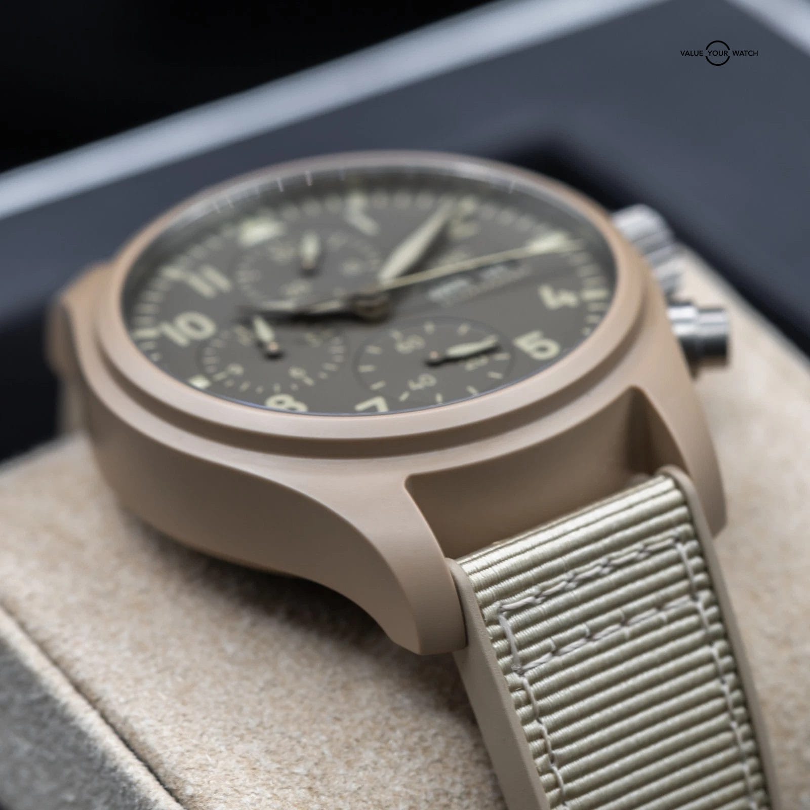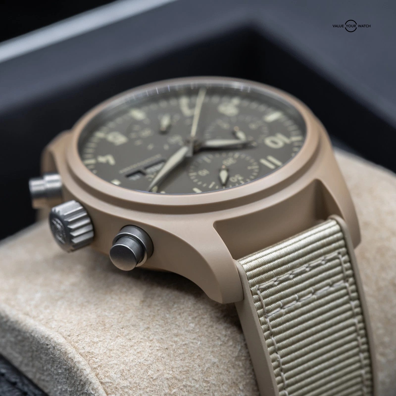 Up for sale here is an excellent example of one of the best offerings by IWC- the classic Pilot’s Chronograph with Day Date complications, fully cased in the Desert Mojave sand colored ceramic. Ref. IW389402