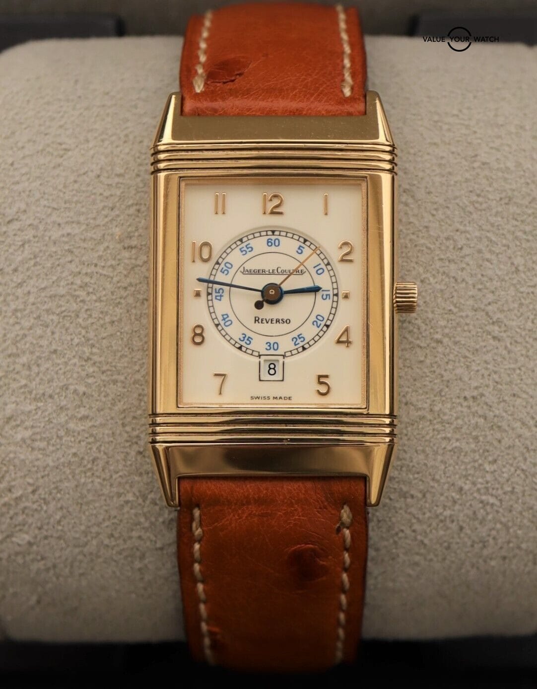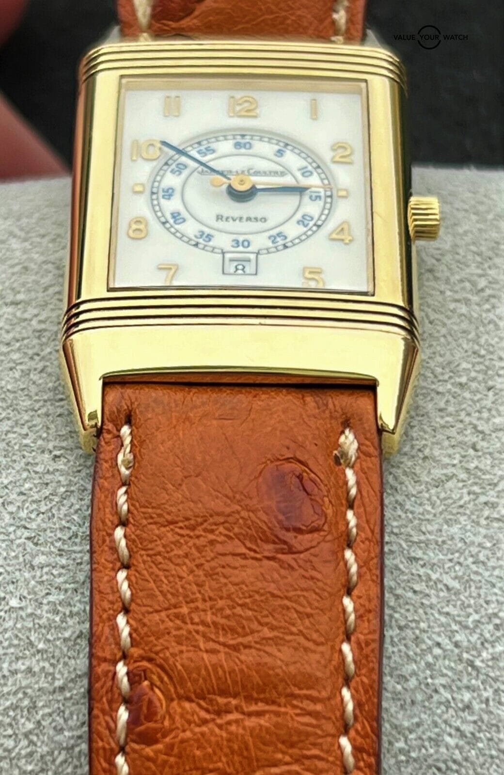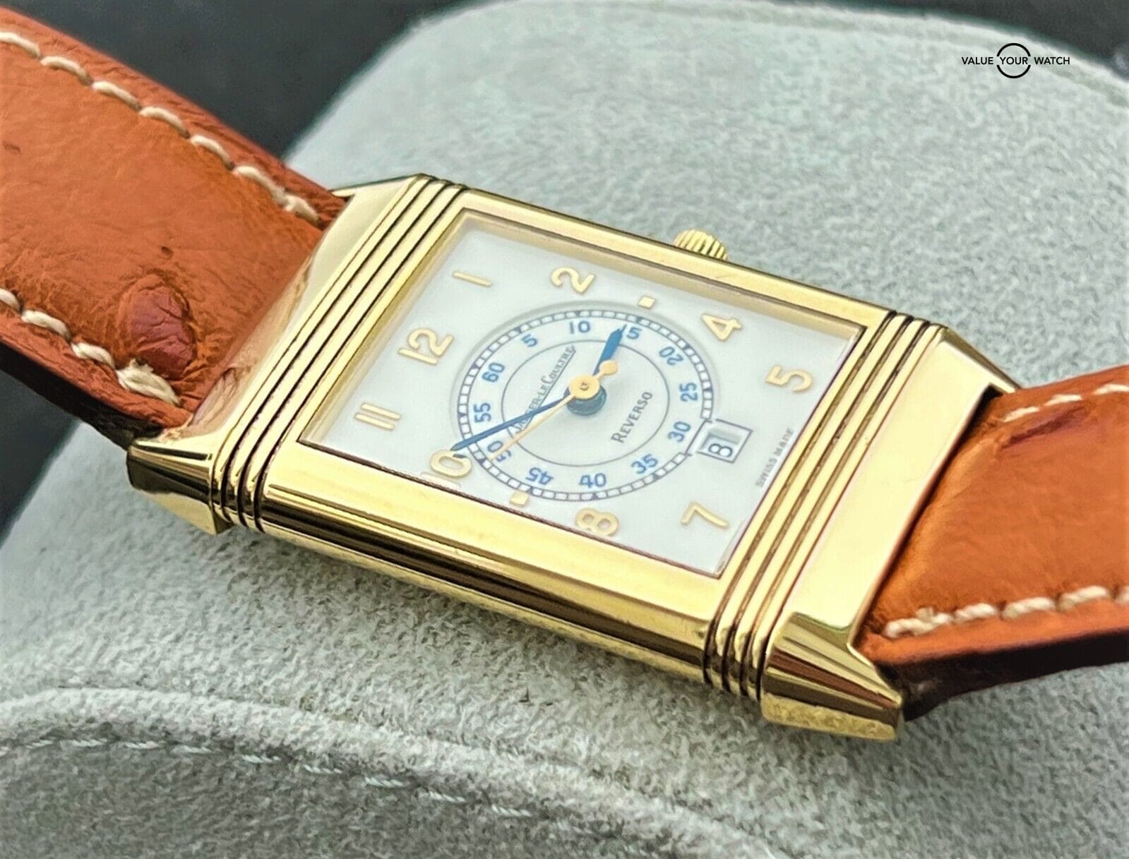 Please note that we suspect the swiveling watch head may have been previously swapped at some point with one from another Reverso as from our experience this reference number normally came with an automatic movement rather than the quartz JLC movement found in this watch. That said, all the parts are 100% JLC down to the case, dial, hands, movement, and buckle.