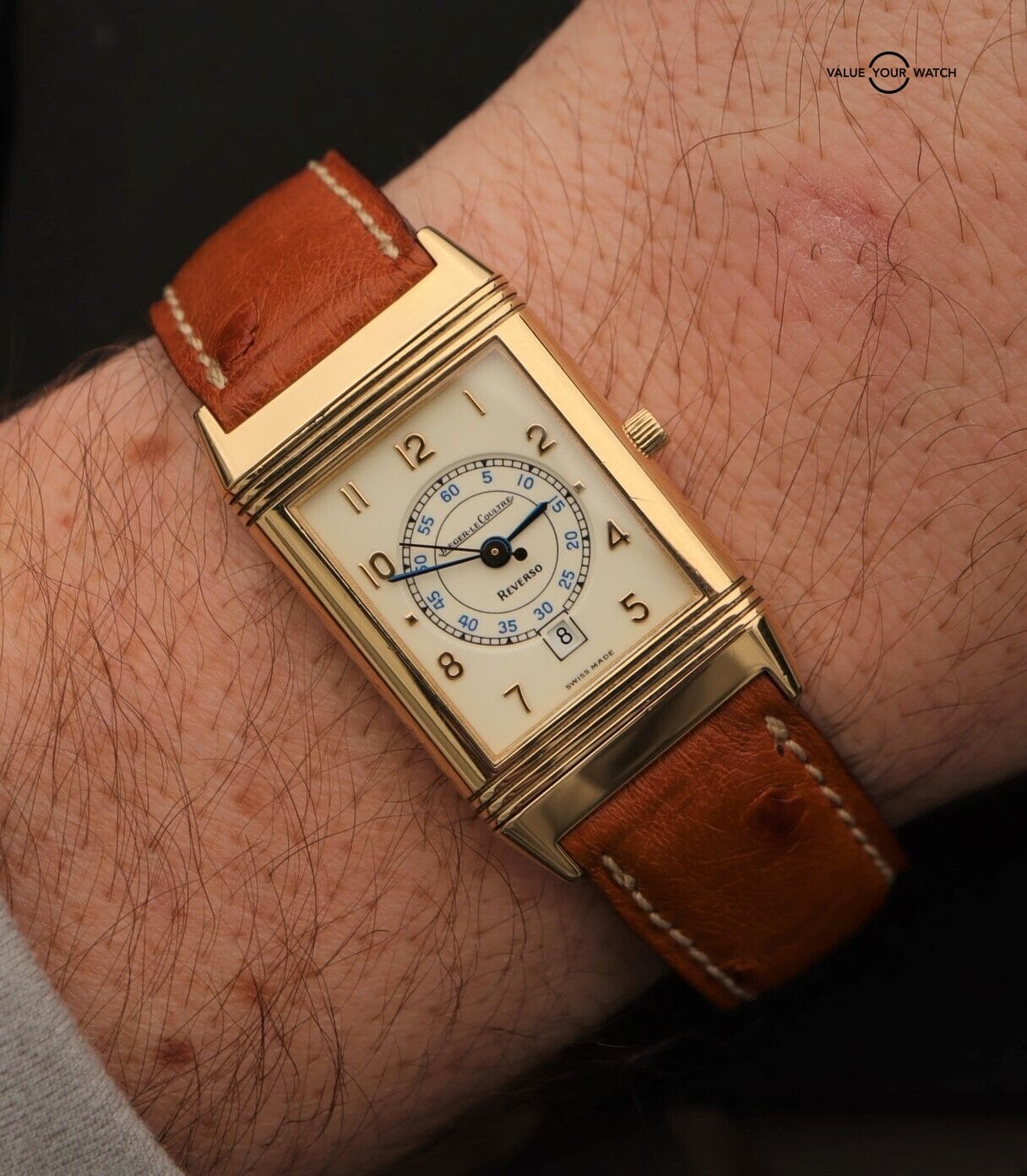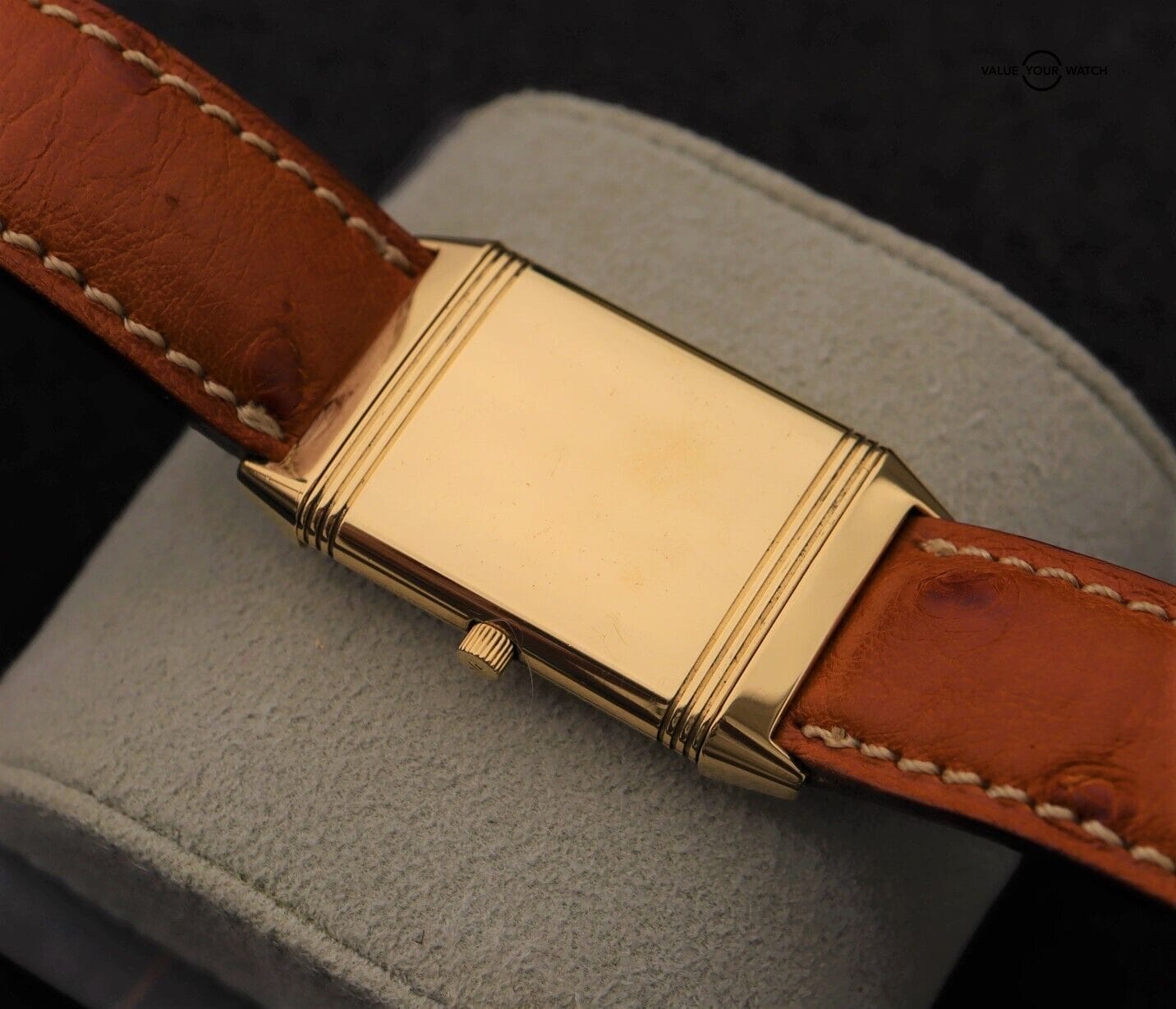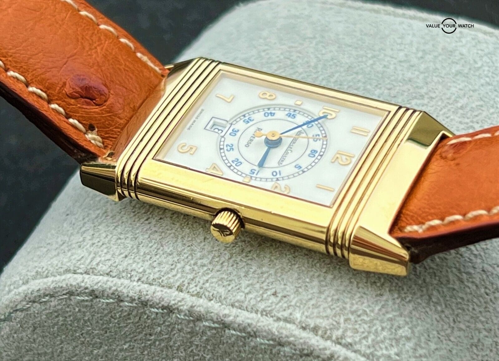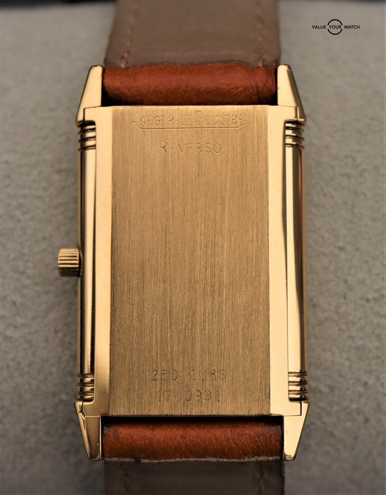 Please note that we suspect the swiveling watch head may have been previously swapped at some point with one from another Reverso as from our experience this reference number normally came with an automatic movement rather than the quartz JLC movement found in this watch. That said, all the parts are 100% JLC down to the case, dial, hands, movement, and buckle.