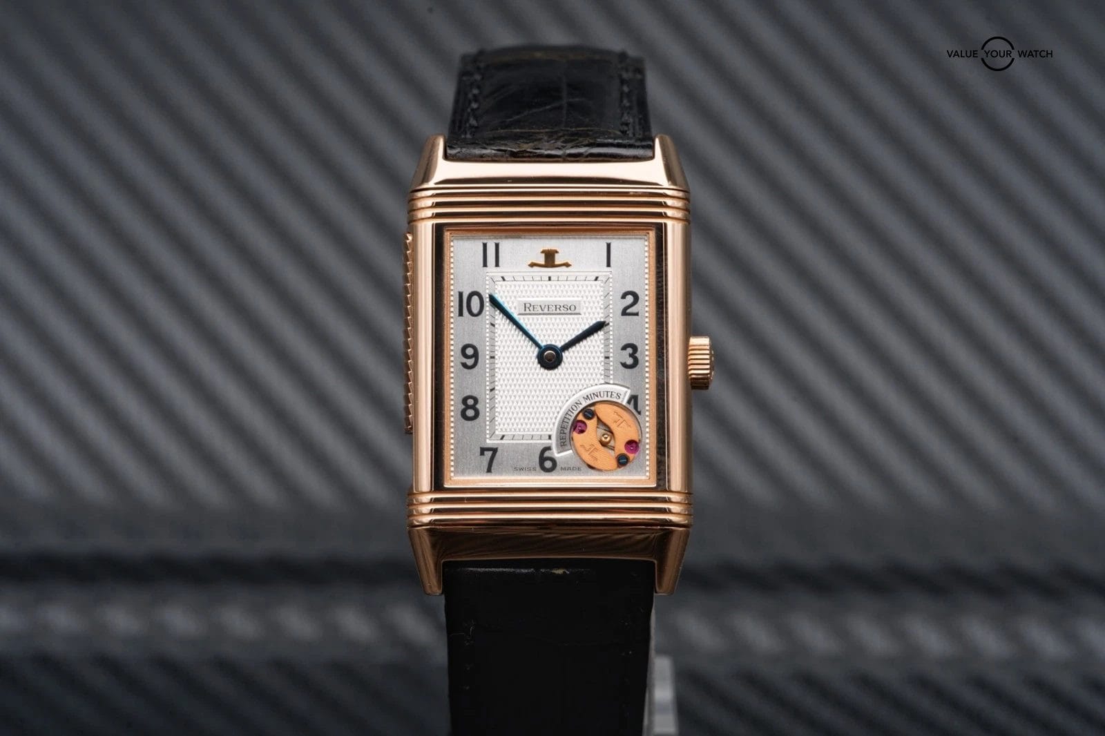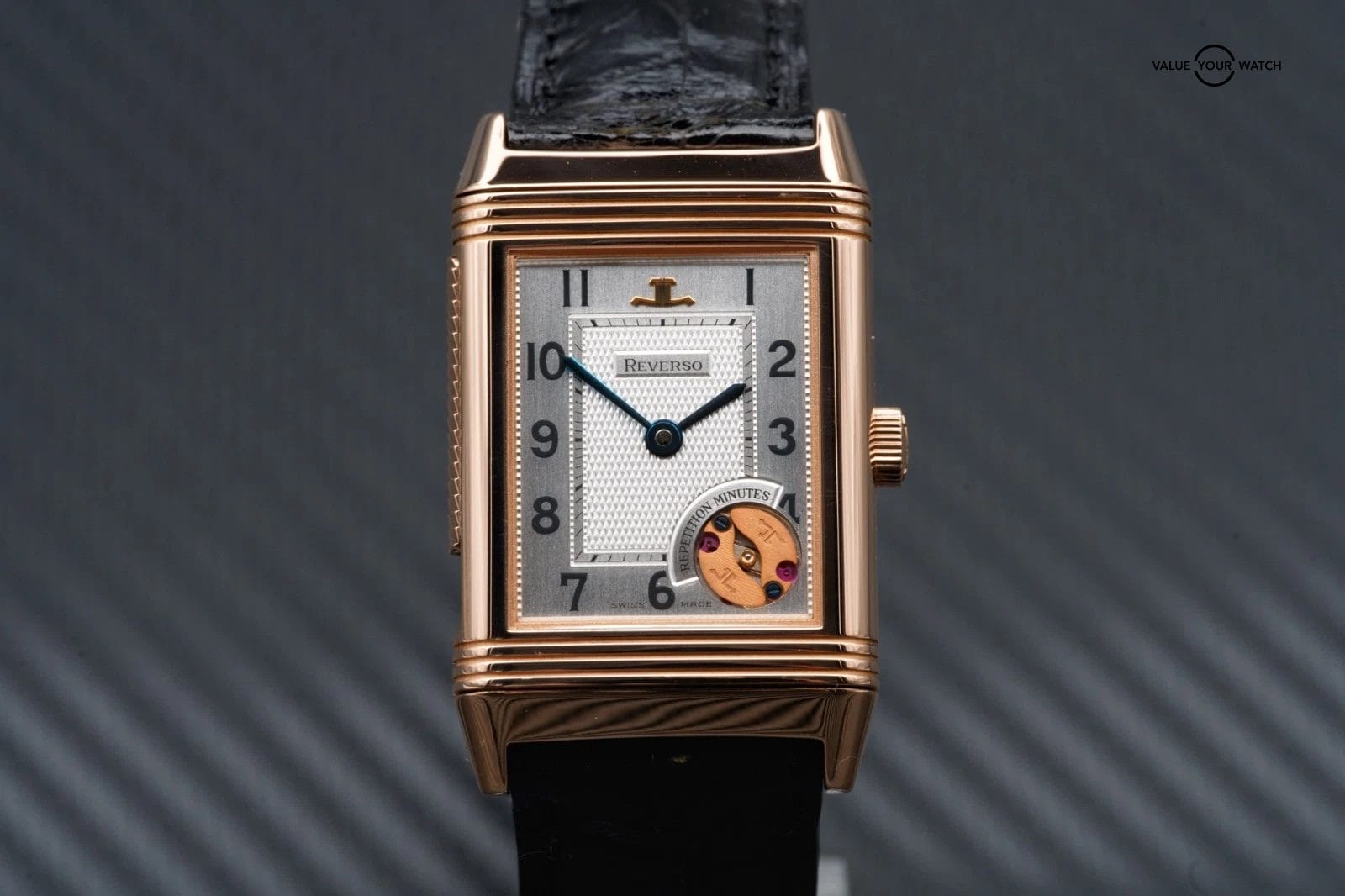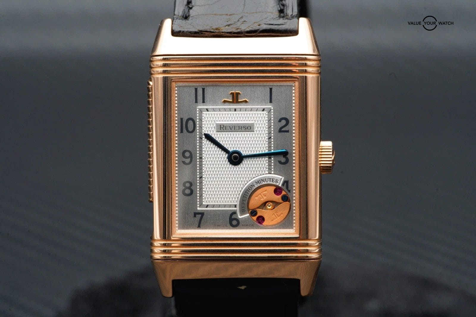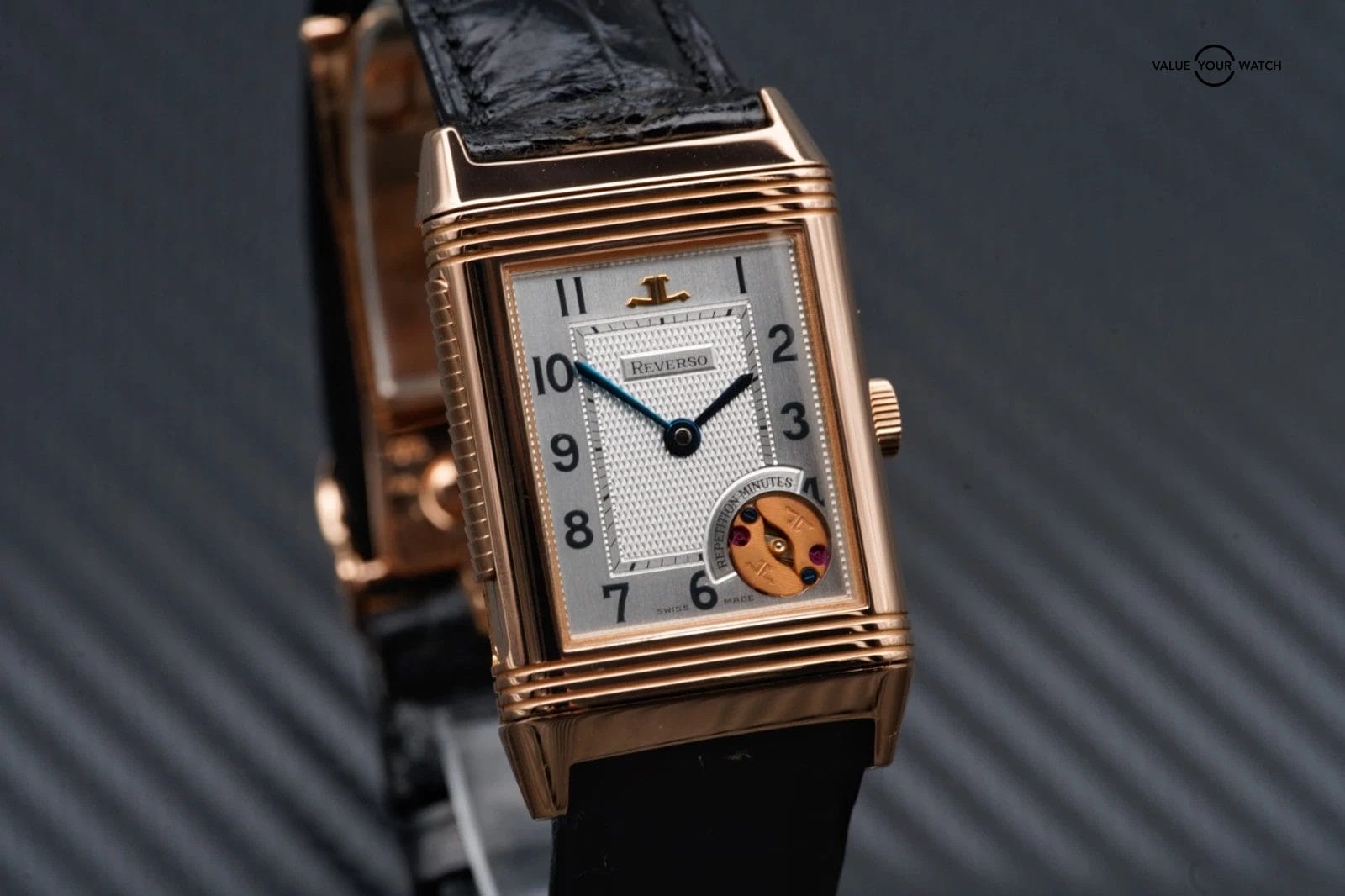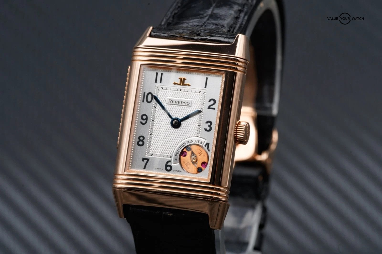 For sale is the unique, 1 of 500 Jaeger-LeCoultre Reverso Minute Repeater in rose gold on a black alligator leather strap.