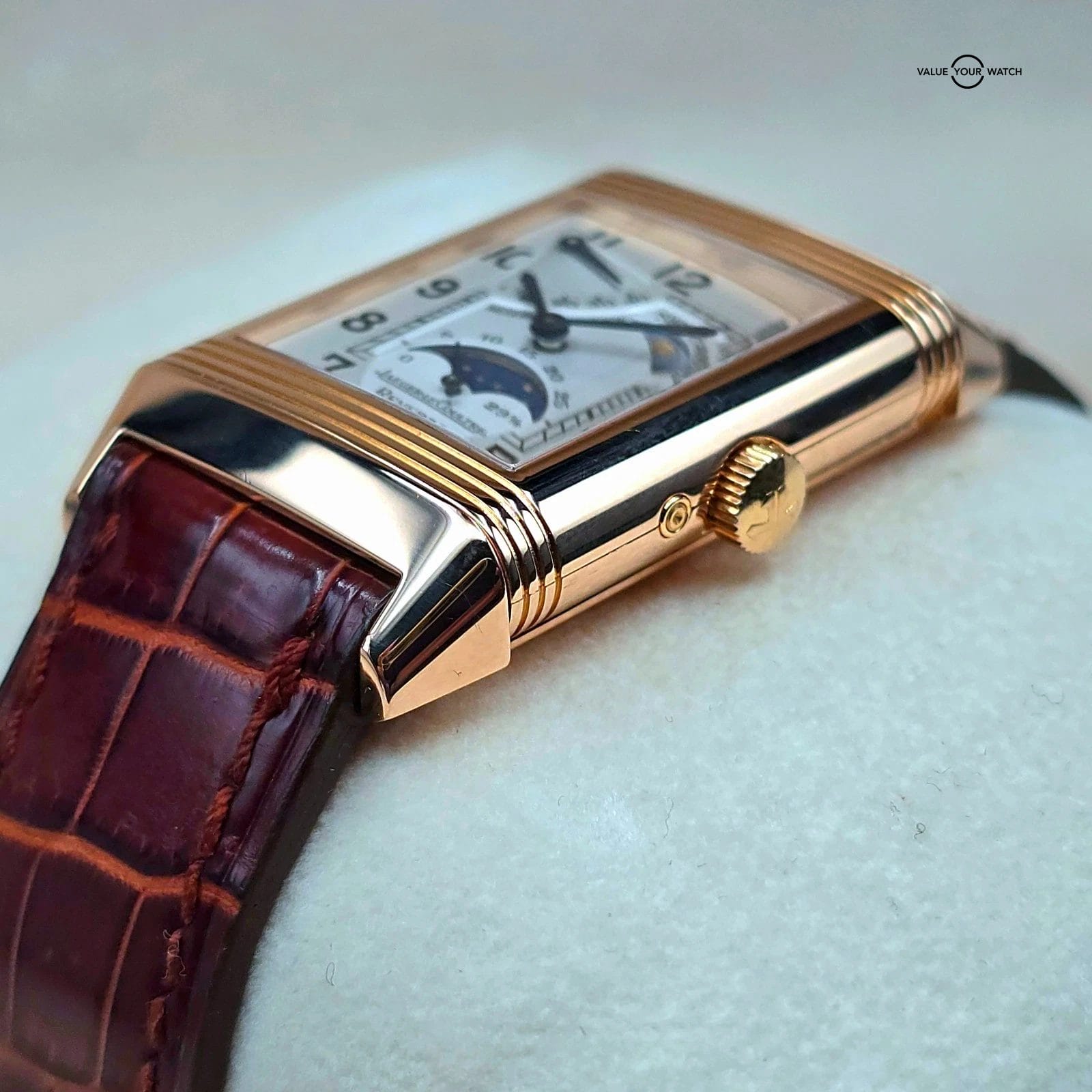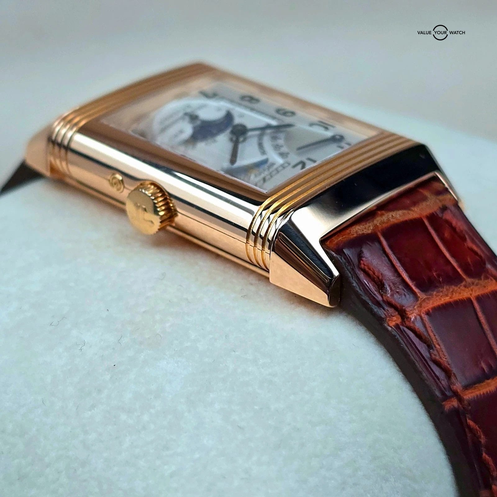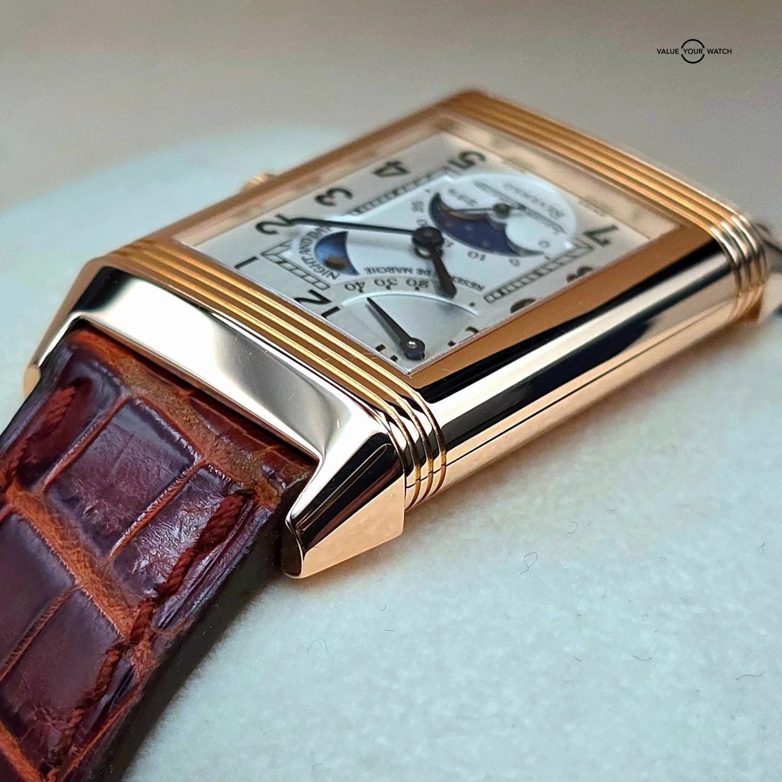 Up for sale here is an incredible timepiece from JLC. The Reverso is arguably the best watch made by the manufacturer, and when complications are added, it’s even better! Cased in solid 18k rose gold. Ref. 270.2.63