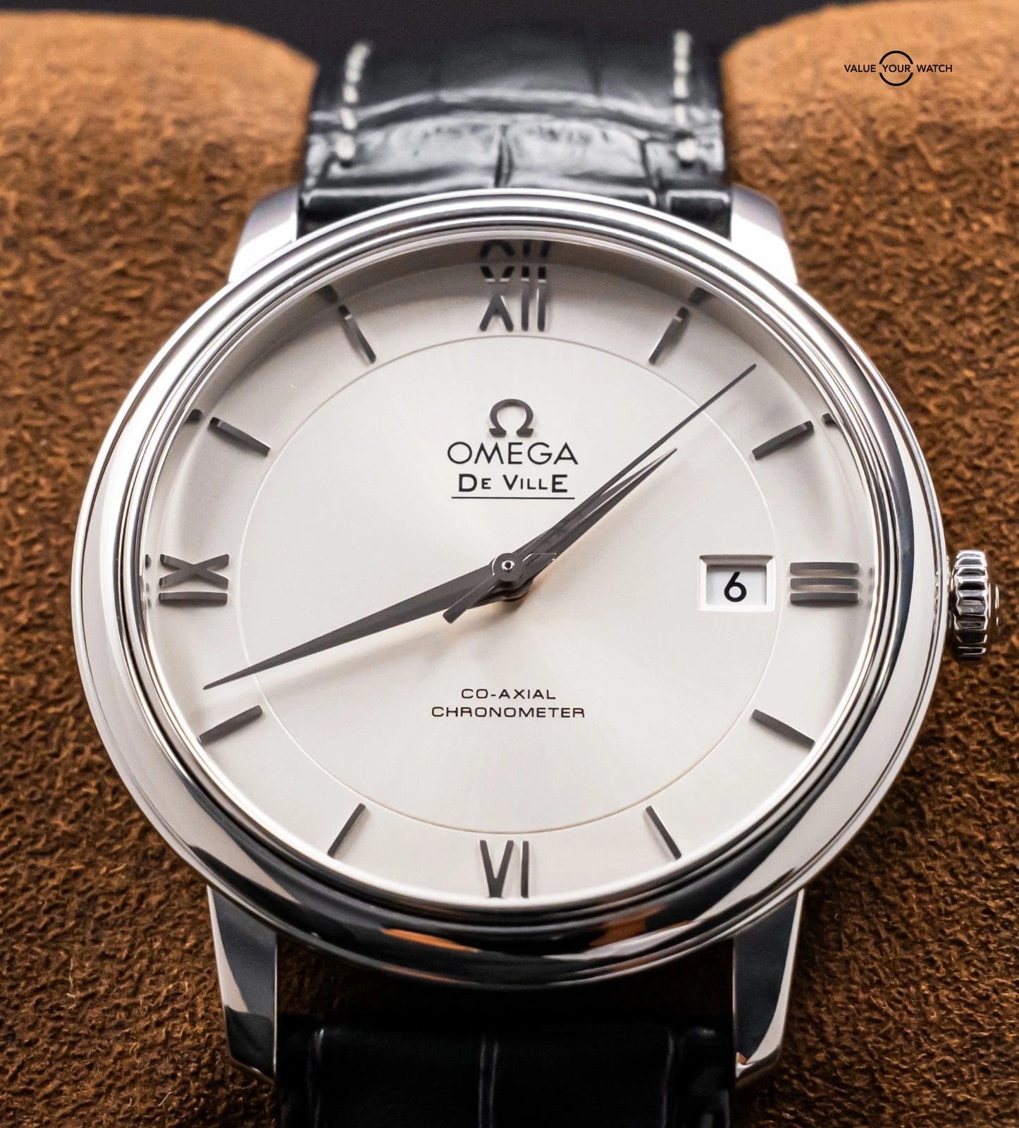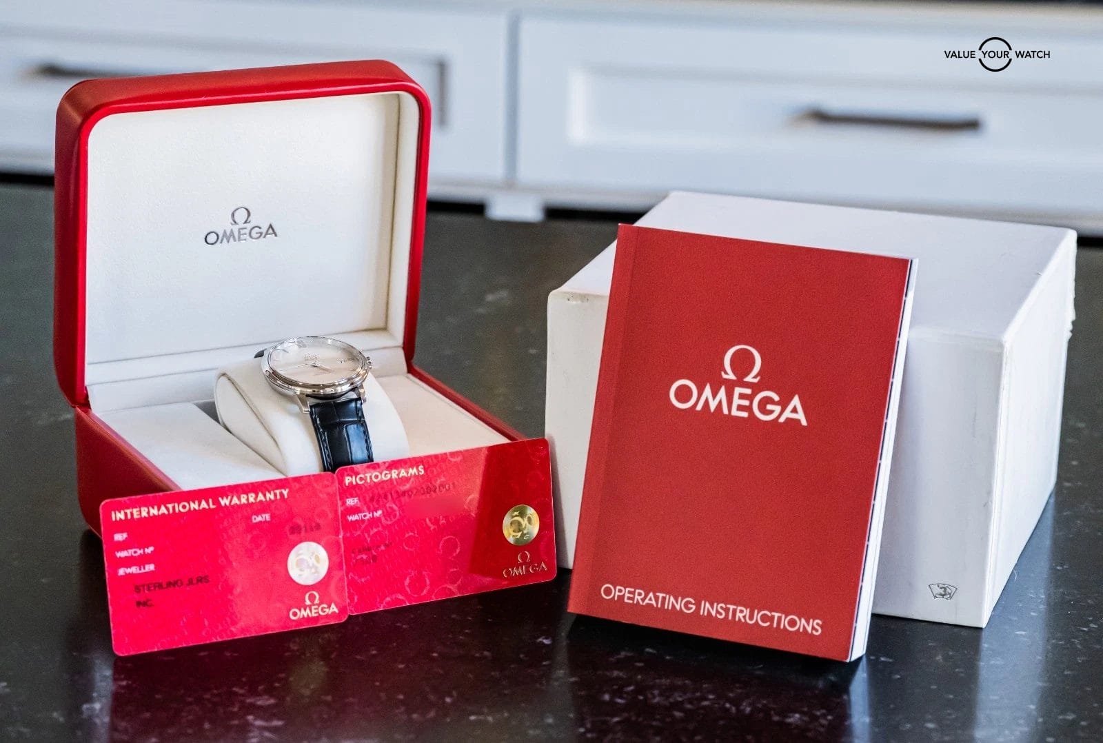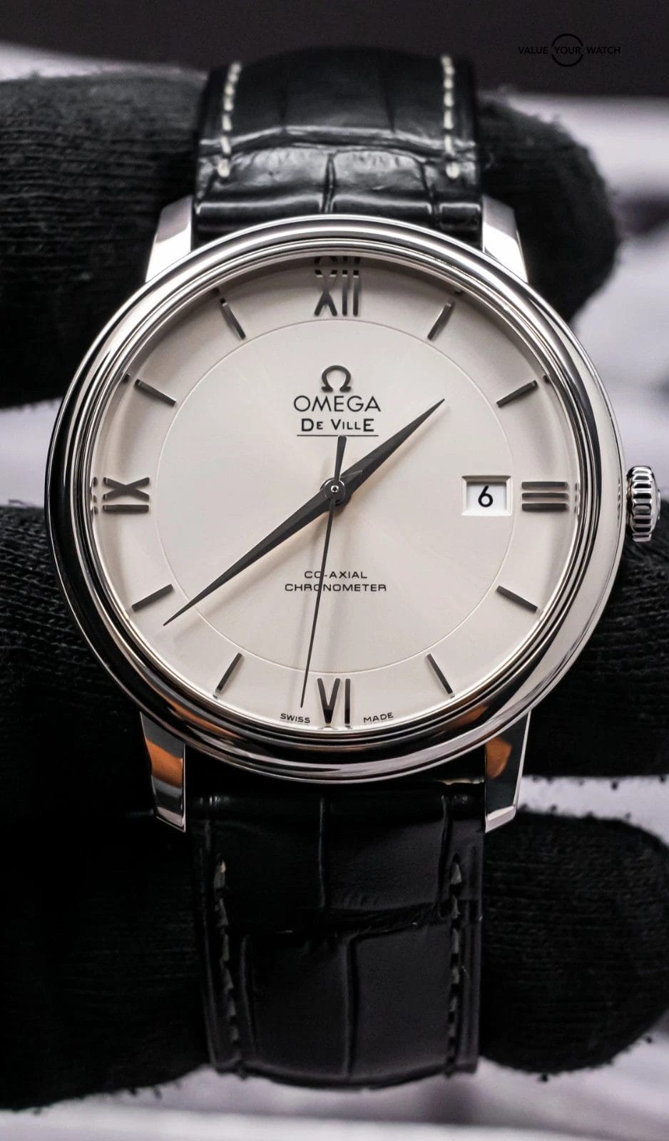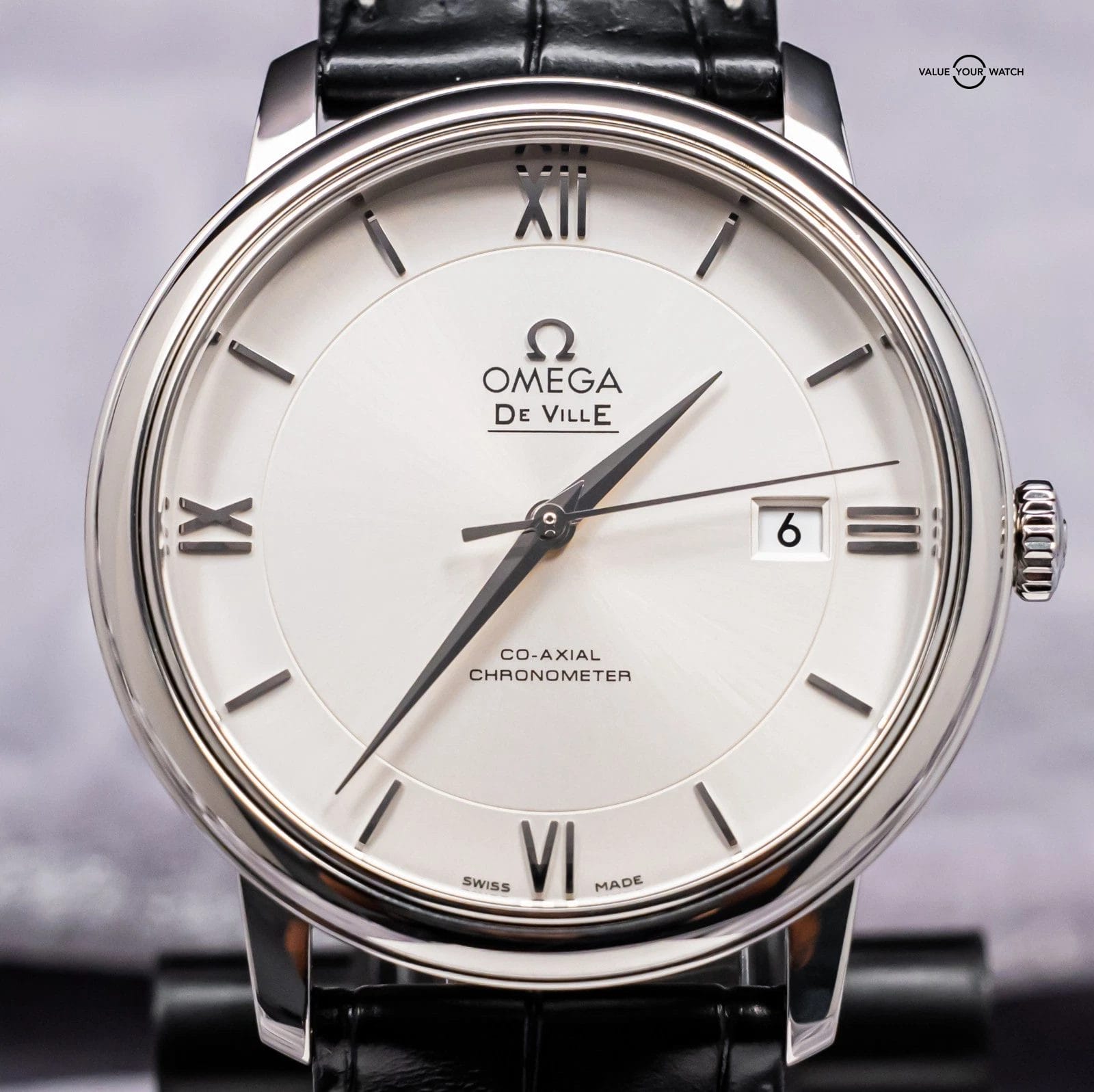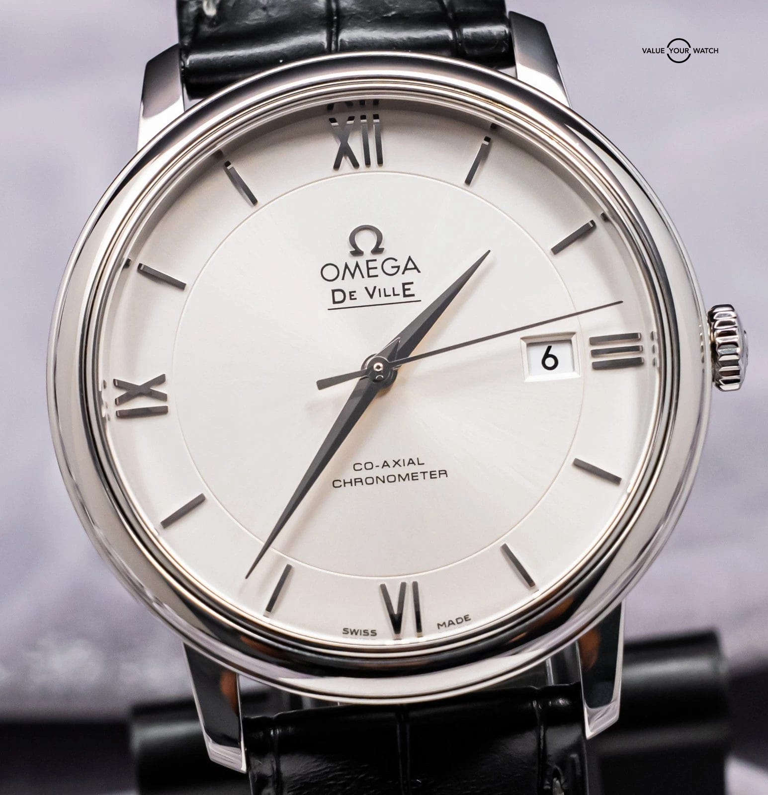 STUNNING Omega De Ville Prestige Co-Axial Chronometer 39.5 mm with Silver Dial on Black Omega Alligator Leather Strap! Arrives as a complete set with the original Omega boxes and papers including the pictogram card, international warranty card, and manual. Acquired from the original owner who wears his pieces sparingly. Very classic setup, easy to dress up or down with the immense versatility. Super comfortable and ready to be on wrist!