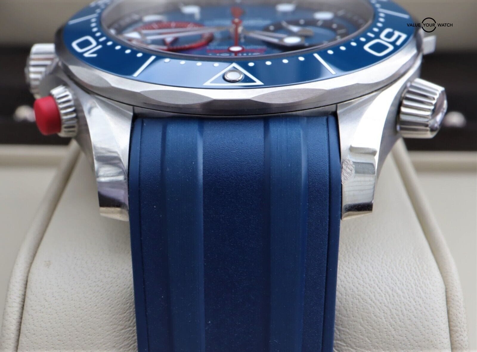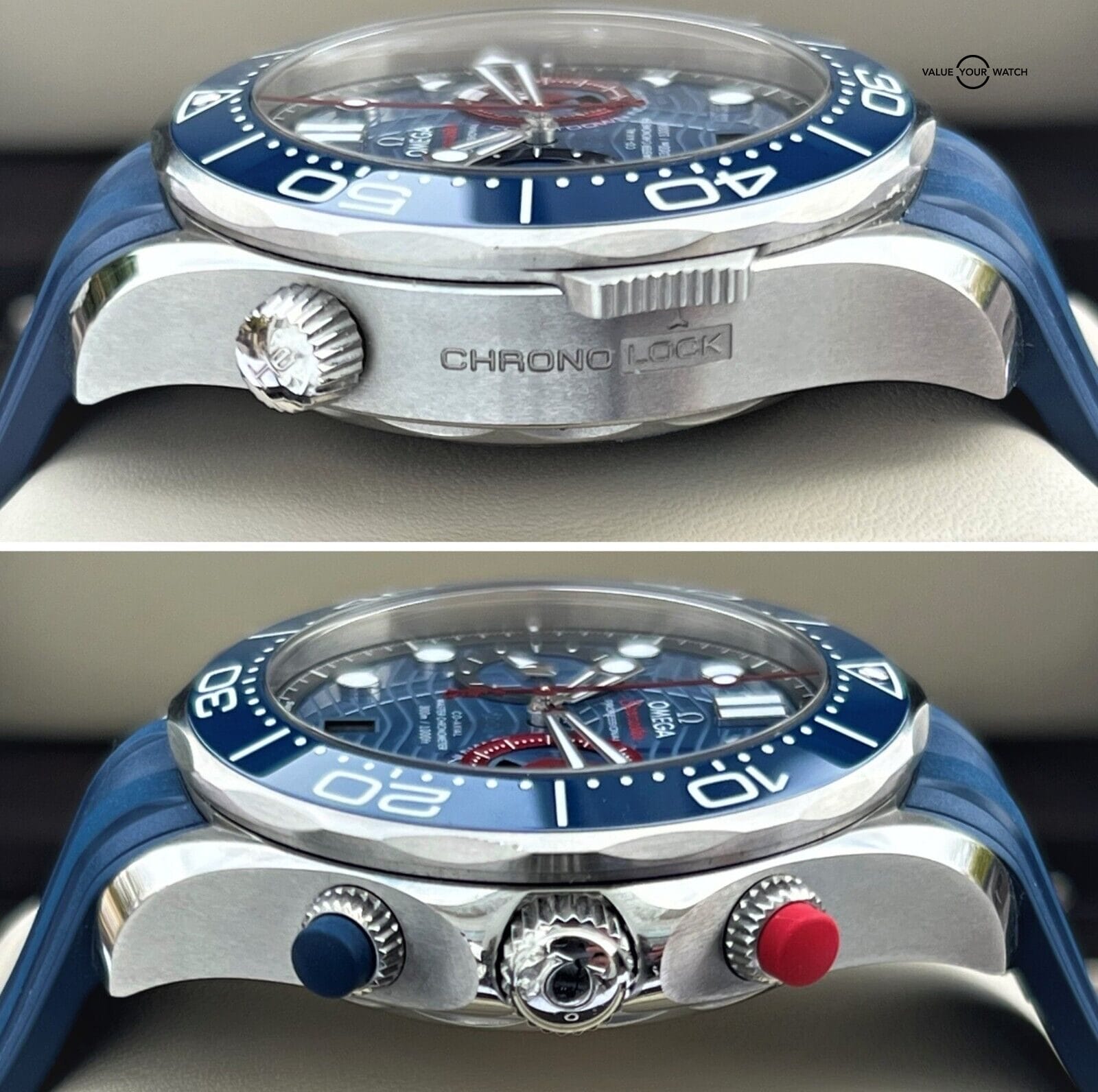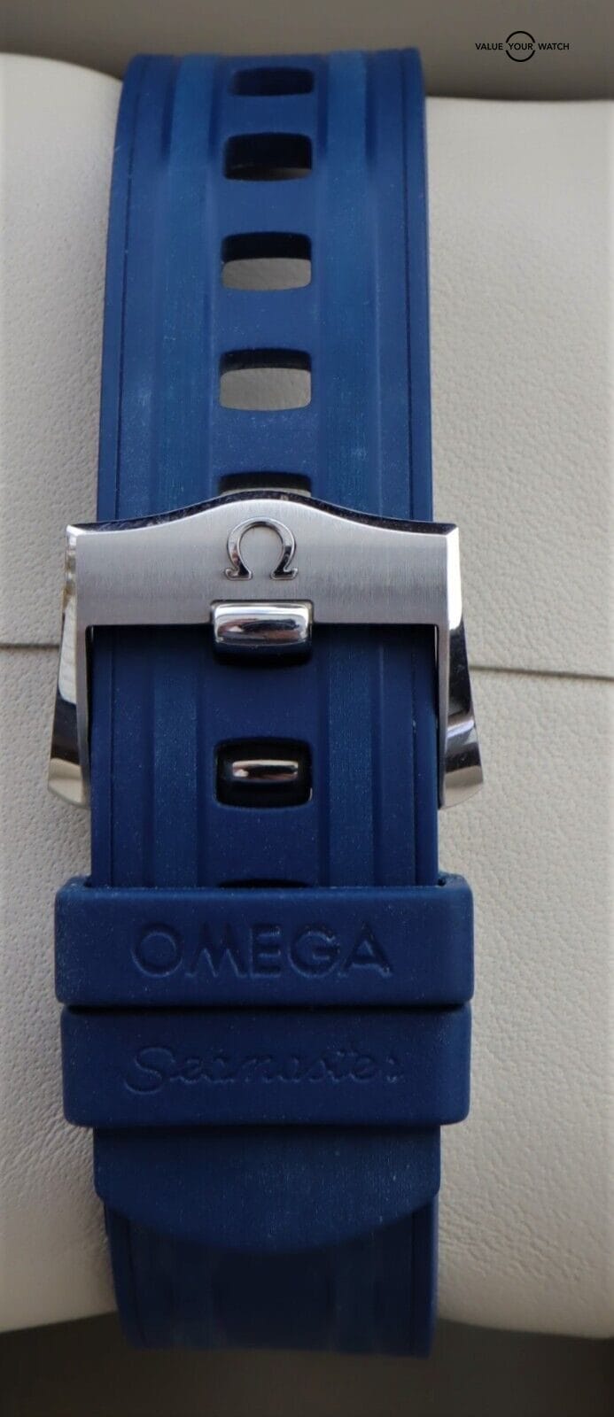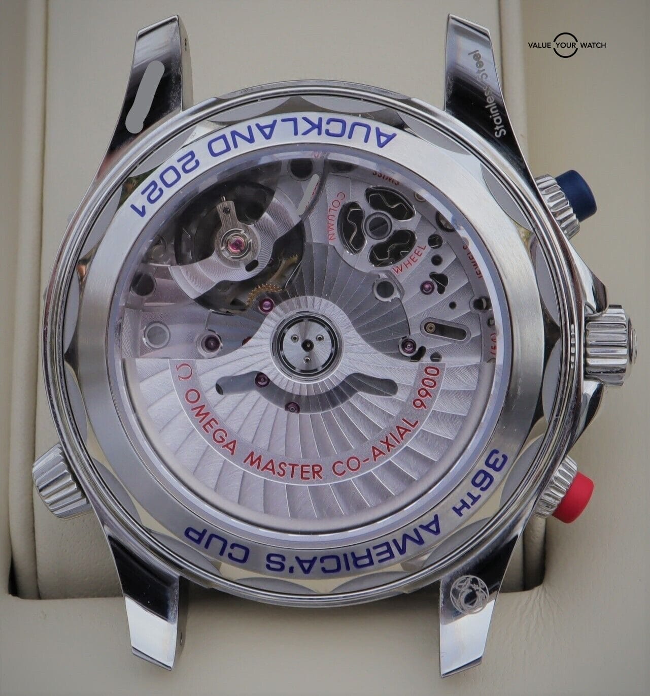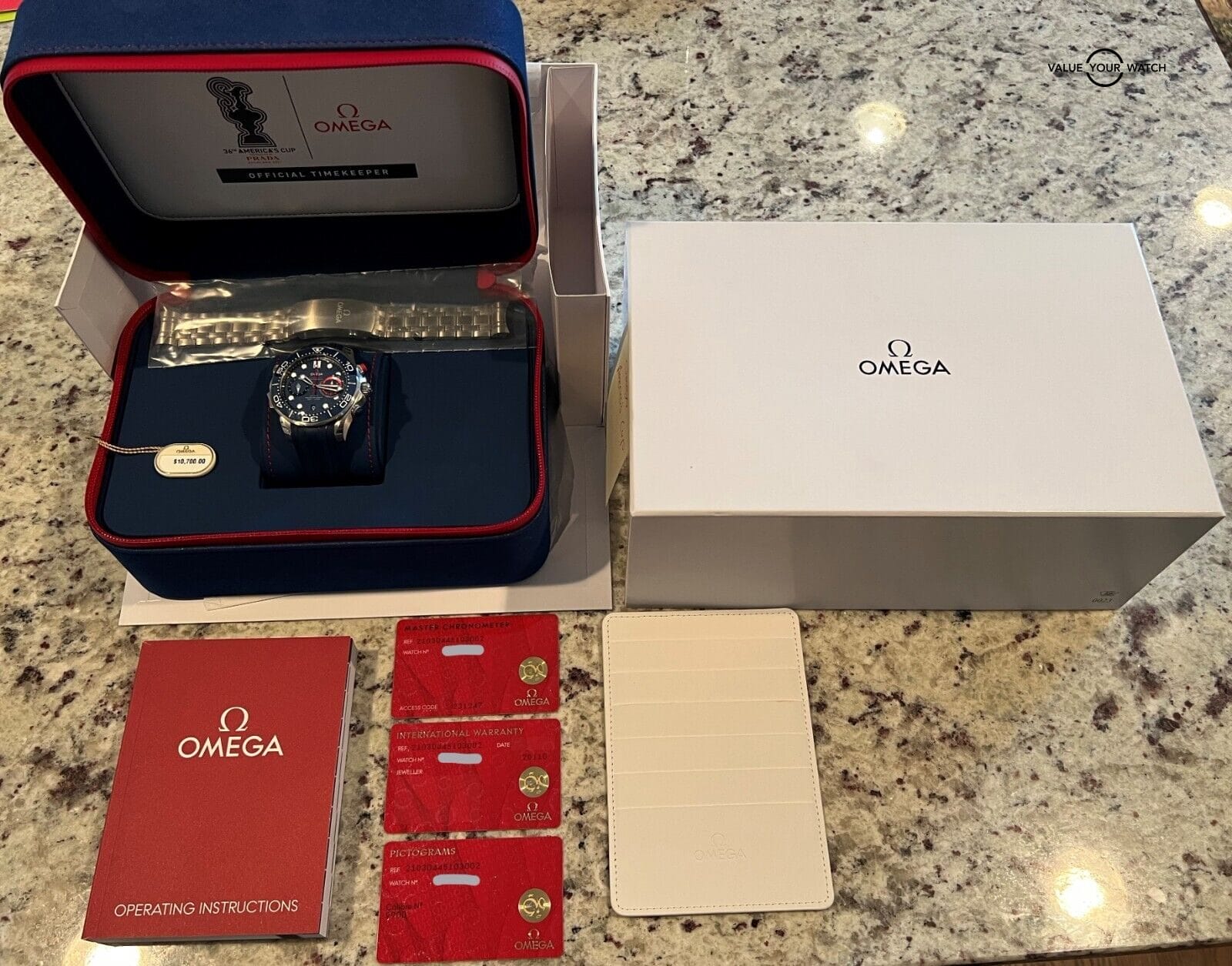 This beautiful timepiece comes complete with the outer white box, inner blue America’s cup box, all manuals, 2 straps, and all 3 cards (warranty card, pictogram, and chronometer). It features 2 OEM Omega straps that has quick strap change system. First strap in rubber, second strap is the Stainless Steel, that has never been worn. This watch is in excellent condition with only 1 blemish on the 11 O’Clock lug. This watch was commissioned to pay tribute to the “36th America’s Cup” and “Auckland 2021”. Everything Is functioning as it should. Serial numbers and names are blurred in photos only for privacy reasons.
