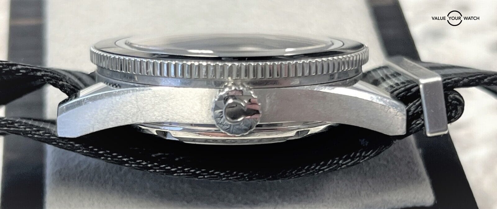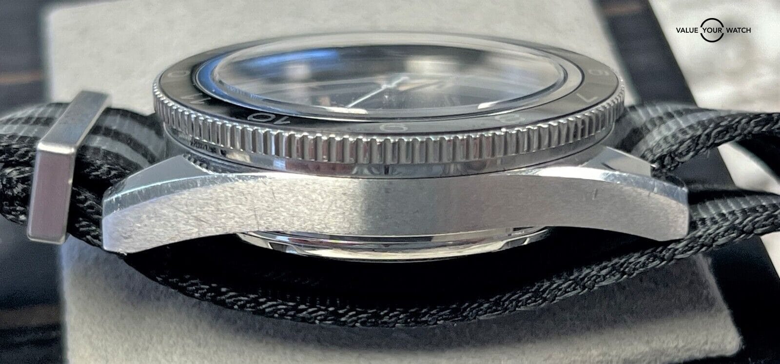 This piece comes as a watch only sale with a recent service receipt. The watch remains in its current unpolished condition. We will let the future buyer decide if they want to polish it or not. If you are reading this, you know it is the Spectre Limited of 7,007 models. It features the lollipop seconds hand and comes fitted on a 5 stripe Nato strap. The watch has typical cosmetic wear throughout (micro pinpoint dings and scratches). The crystal is clean with no nicks or scratches. Mechanically the watch is functioning as it should. Serial numbers and names are blurred in photos only for privacy reasons.