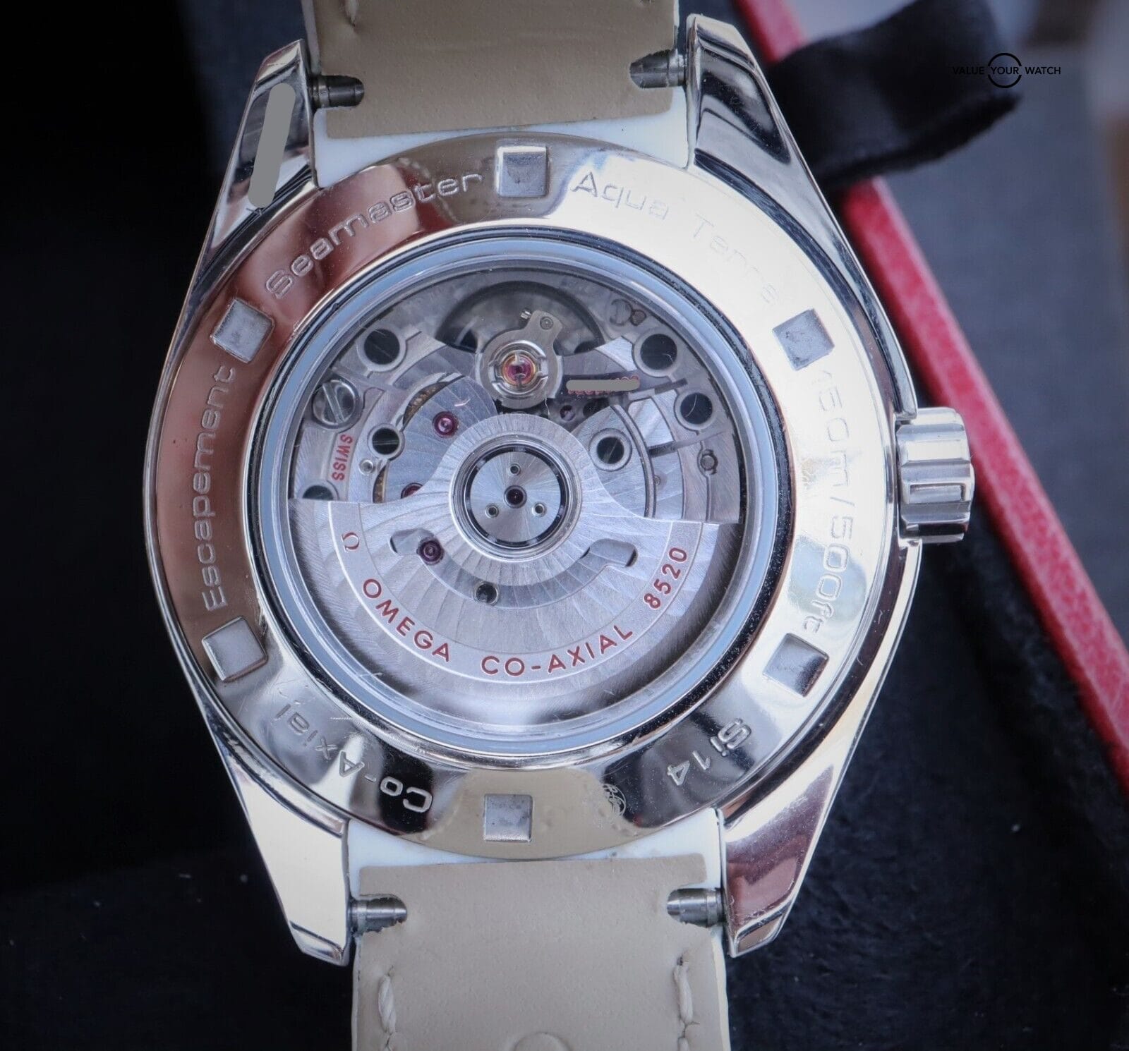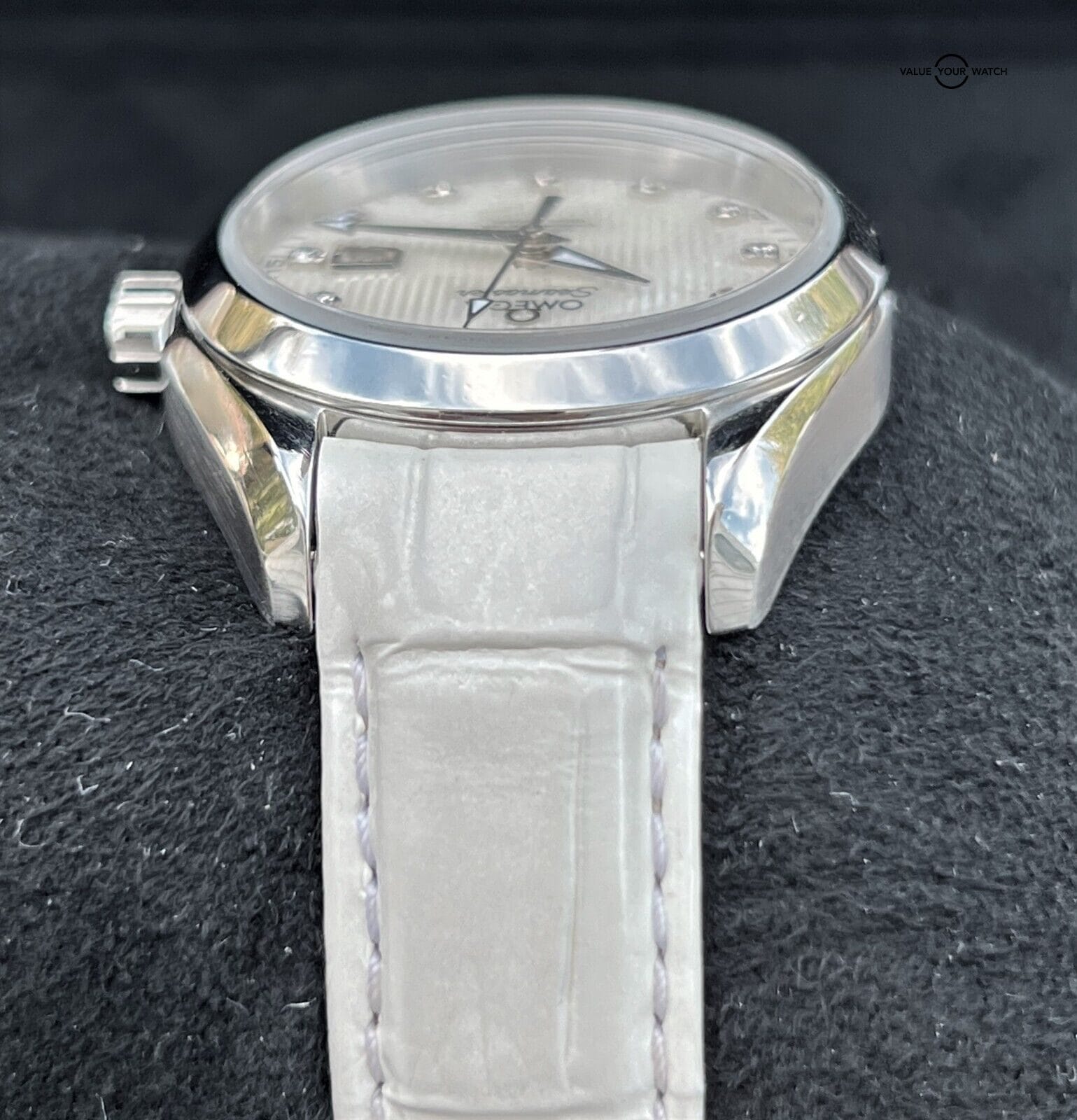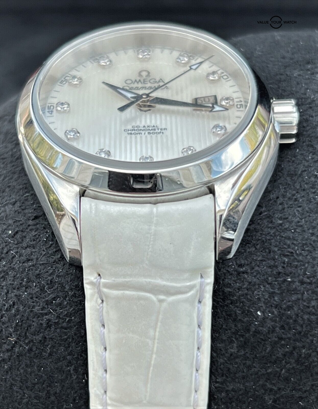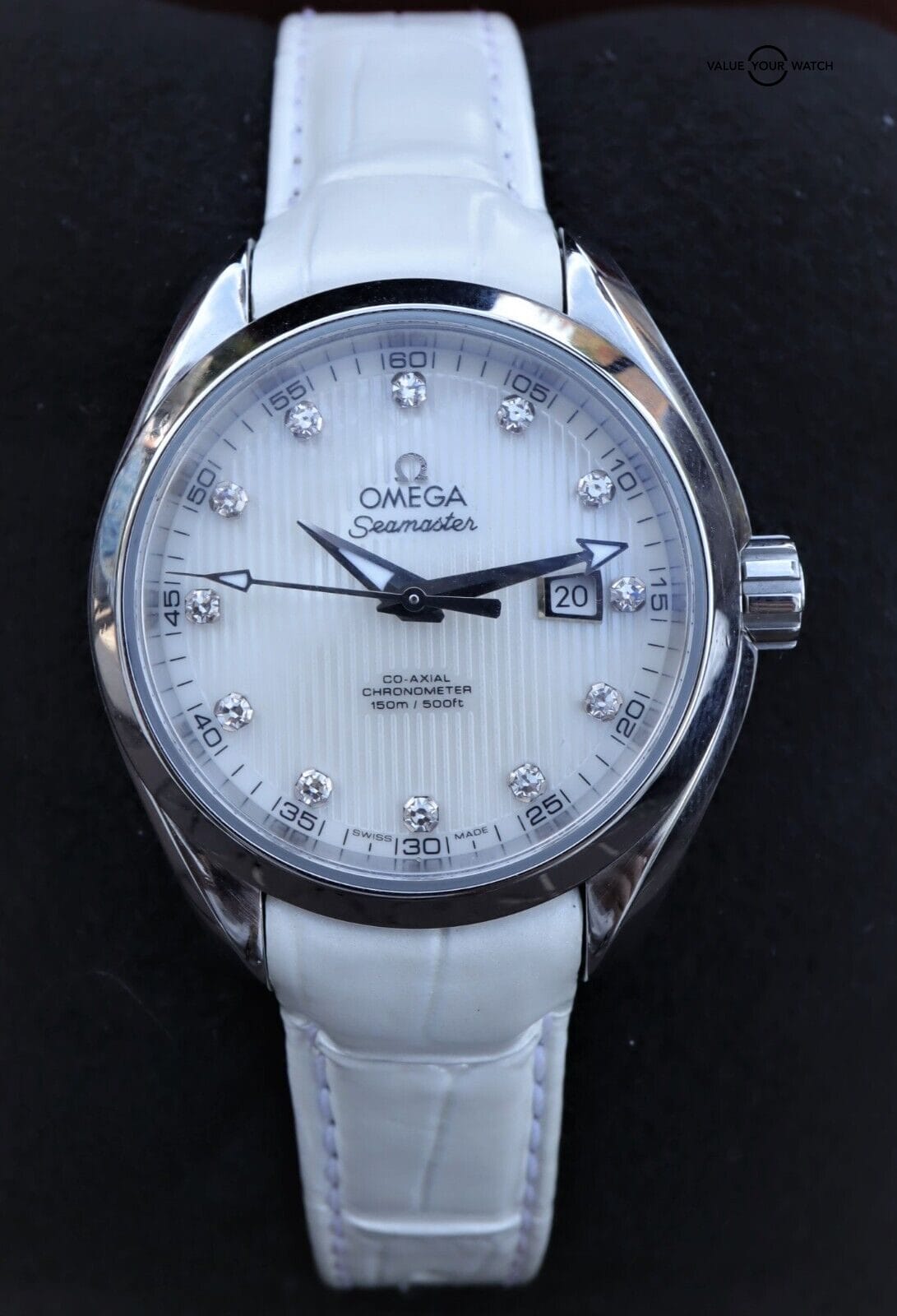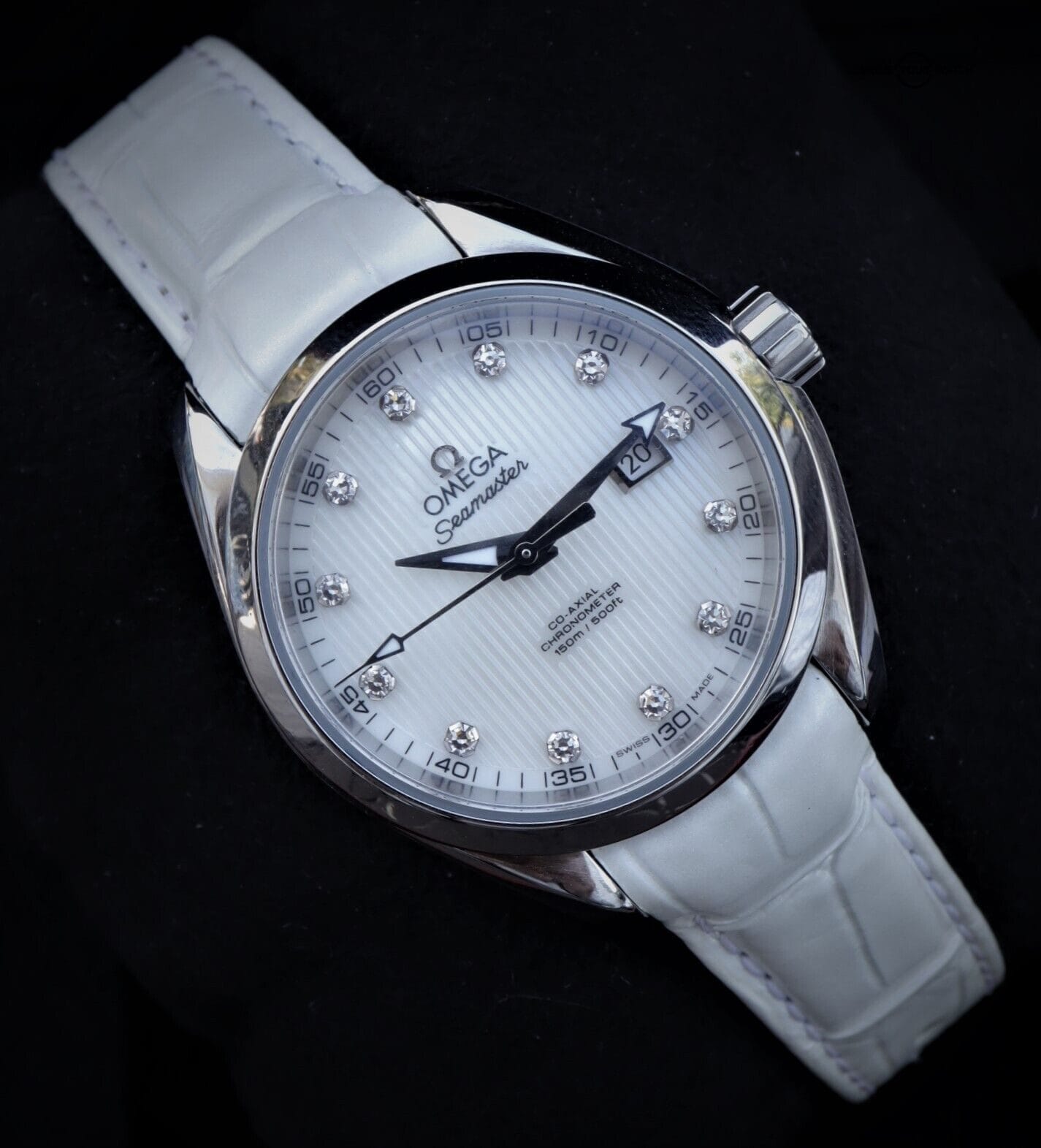 This model features a white mother-of-pearl dial decorated with diamond-set indexes, the Teak Concept pattern and a date window at the 3 o’clock position. A scratch-resistant sapphire crystal protects this unique dial. The bezel is mounted on a 34 mm stainless steel case on a white leather strap. This certified chronometer is powered by the OMEGA Co-Axial calibre 8520 which can be seen through the transparent caseback.