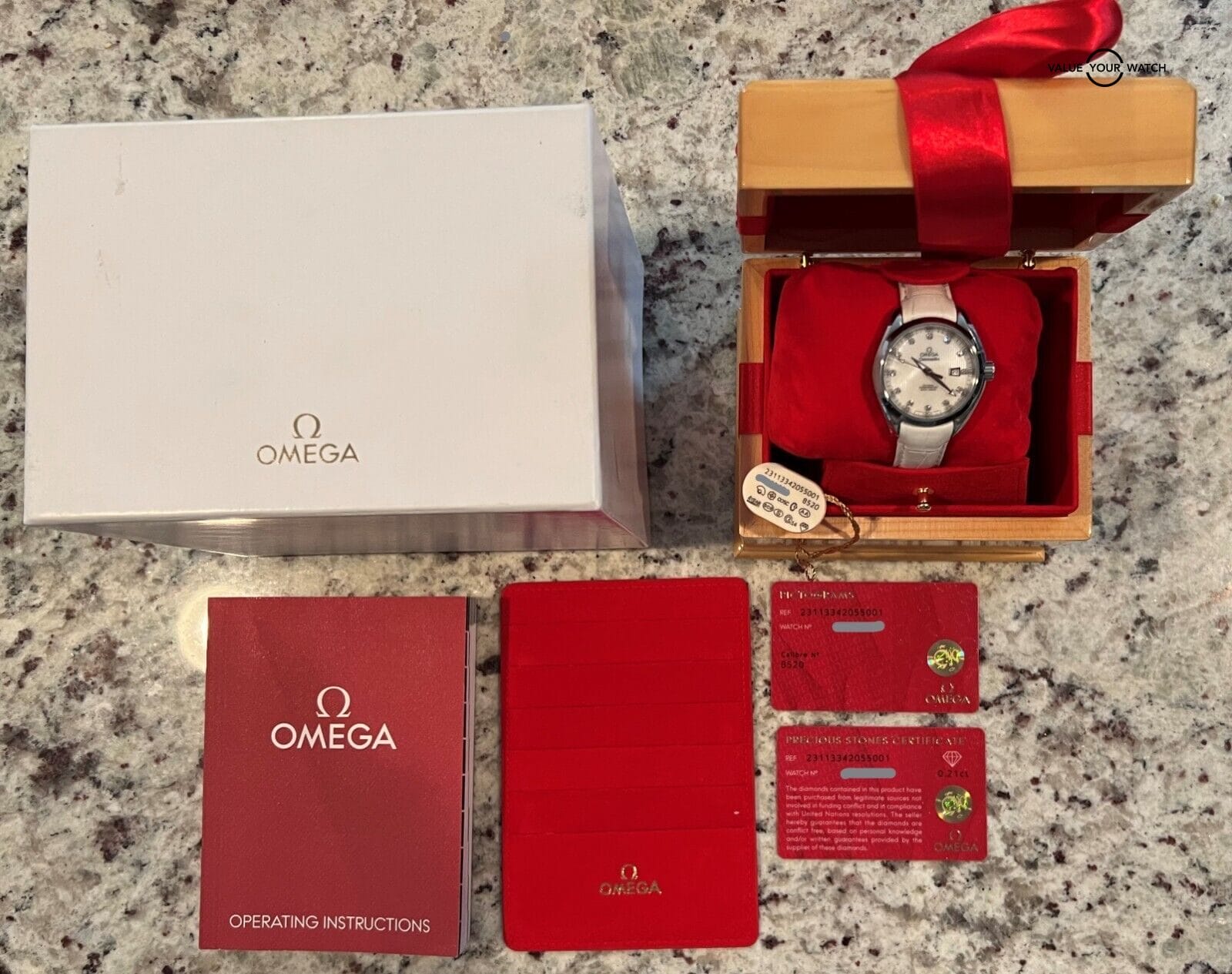 This beautiful timepiece comes with the outer white box, beautiful inner wooden display box, red travel pouch, instruction manual, hangtag, and the pictogram card as well as the precious stones certificate. Everything Is functioning as it should. Serial numbers and names are blurred in photos only for privacy reasons. The original owner spent just over $7,000 on this timepiece.
