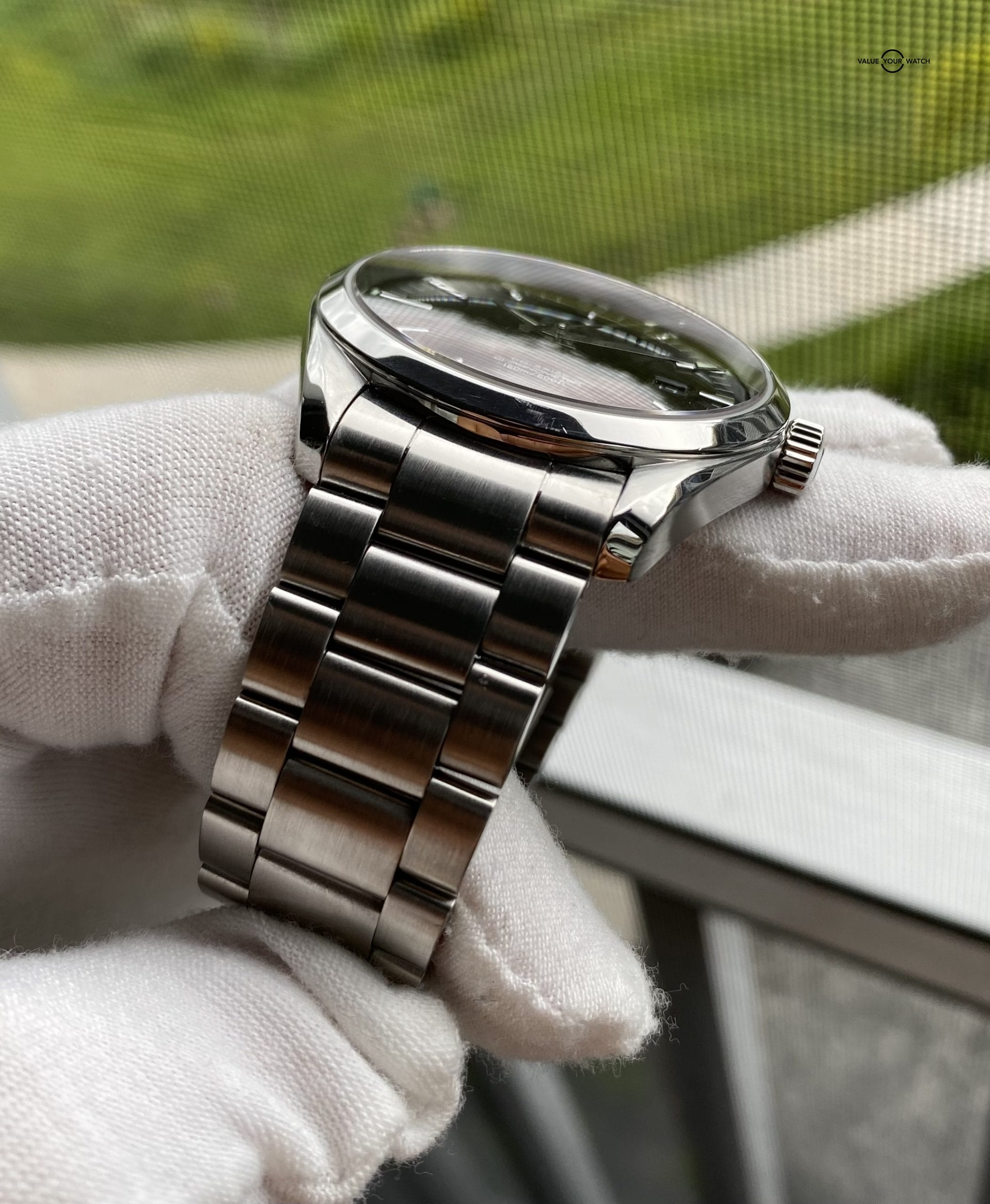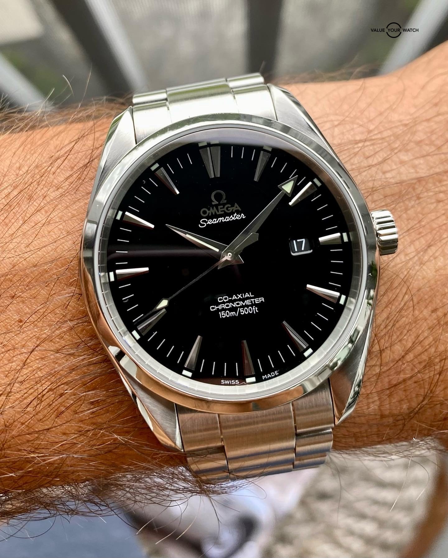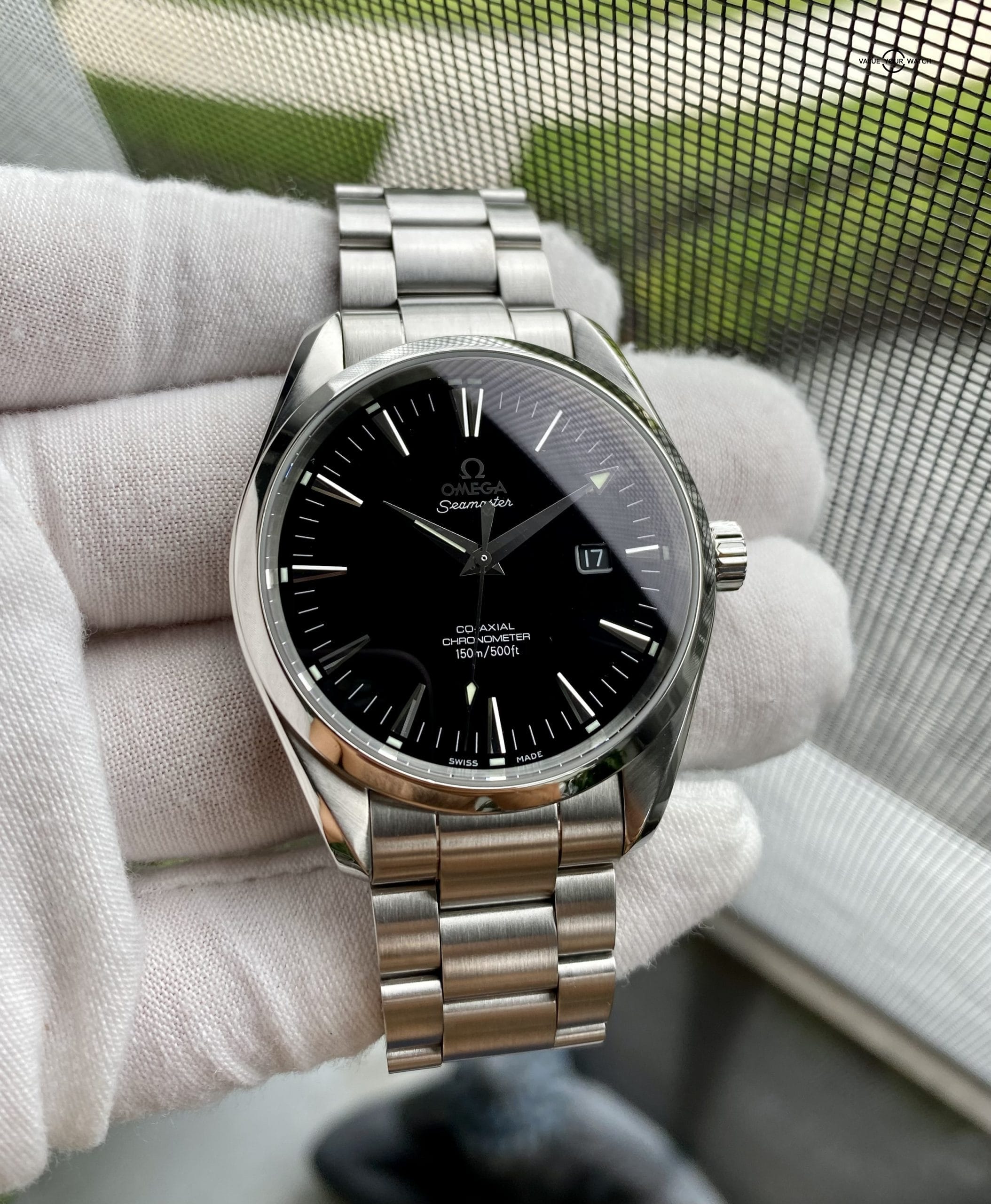 Available for purchase is this handsome classic Omega Seamaster Aqua Terra Big Size. It’s 42mm case houses a gorgeous smooth gloss black enamel dial, and Omegas 2500 workhorse automatic movement. Unlike the modern Aqua Terra’s this dial does not have the teak plank, which provides a sleeker more sophisticated vibe, while still been sporty. Another great quality of these older Aqua Terra models is how slim they are, at only 11mm thick it has great feel on the wrist. Date indicator at 3 o’clock, screw down crown, and display caseback.