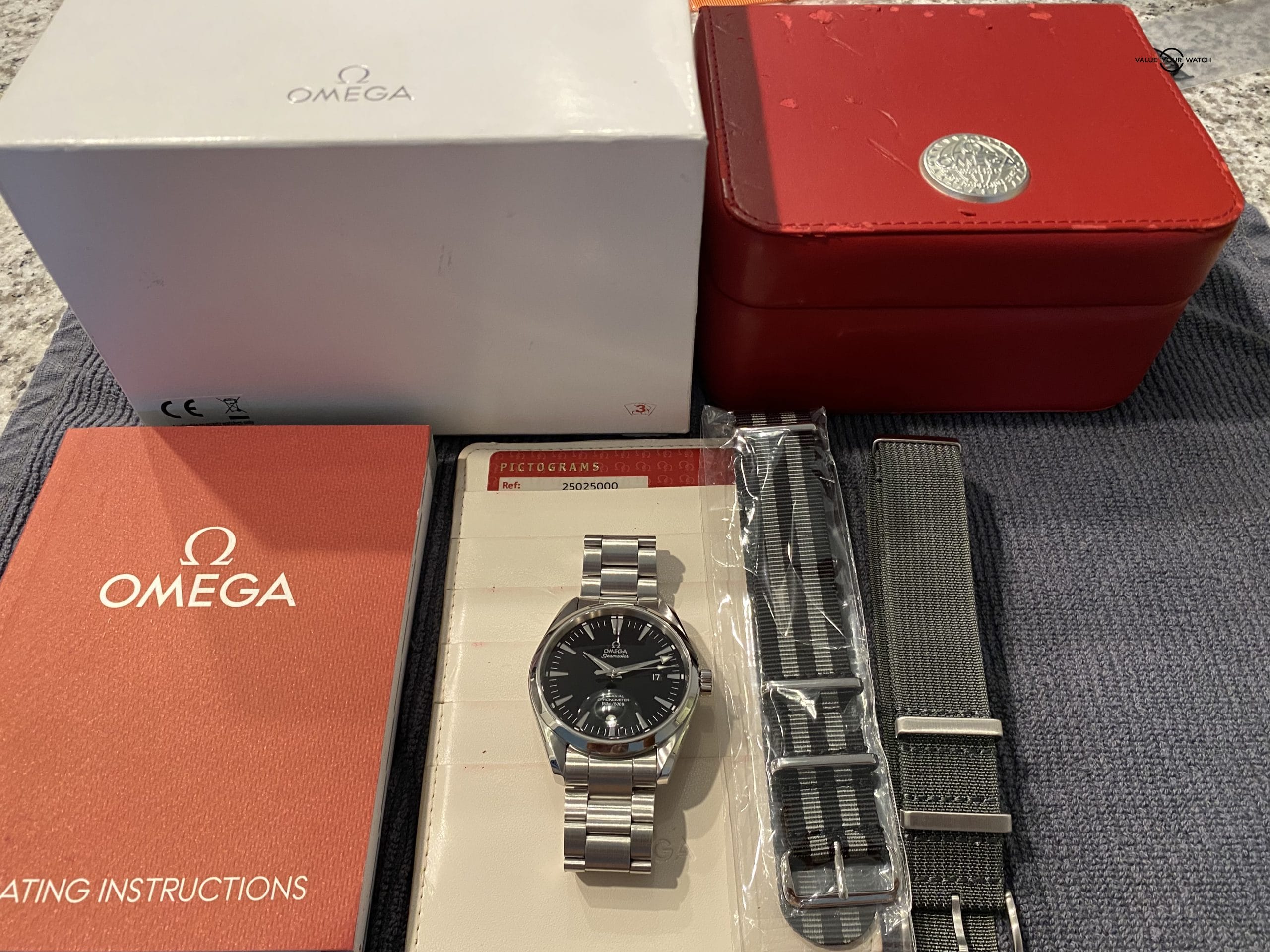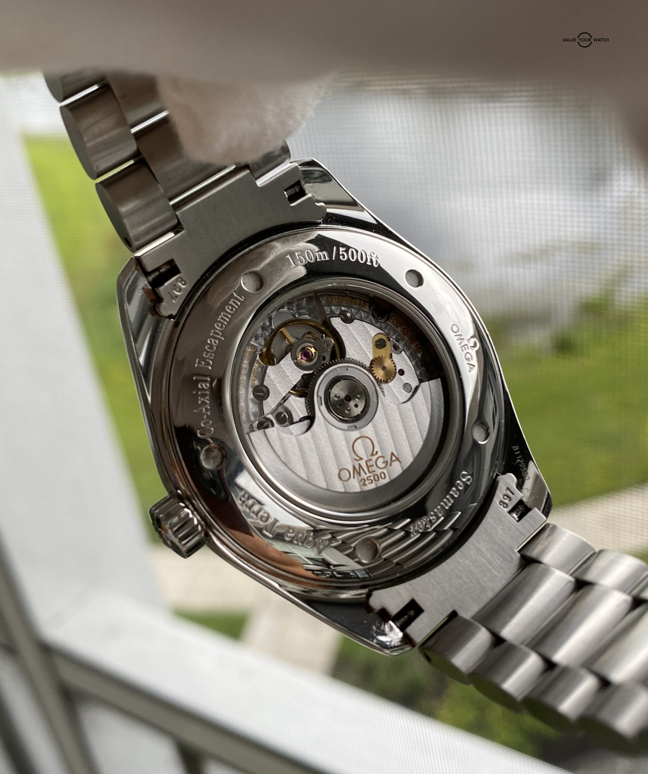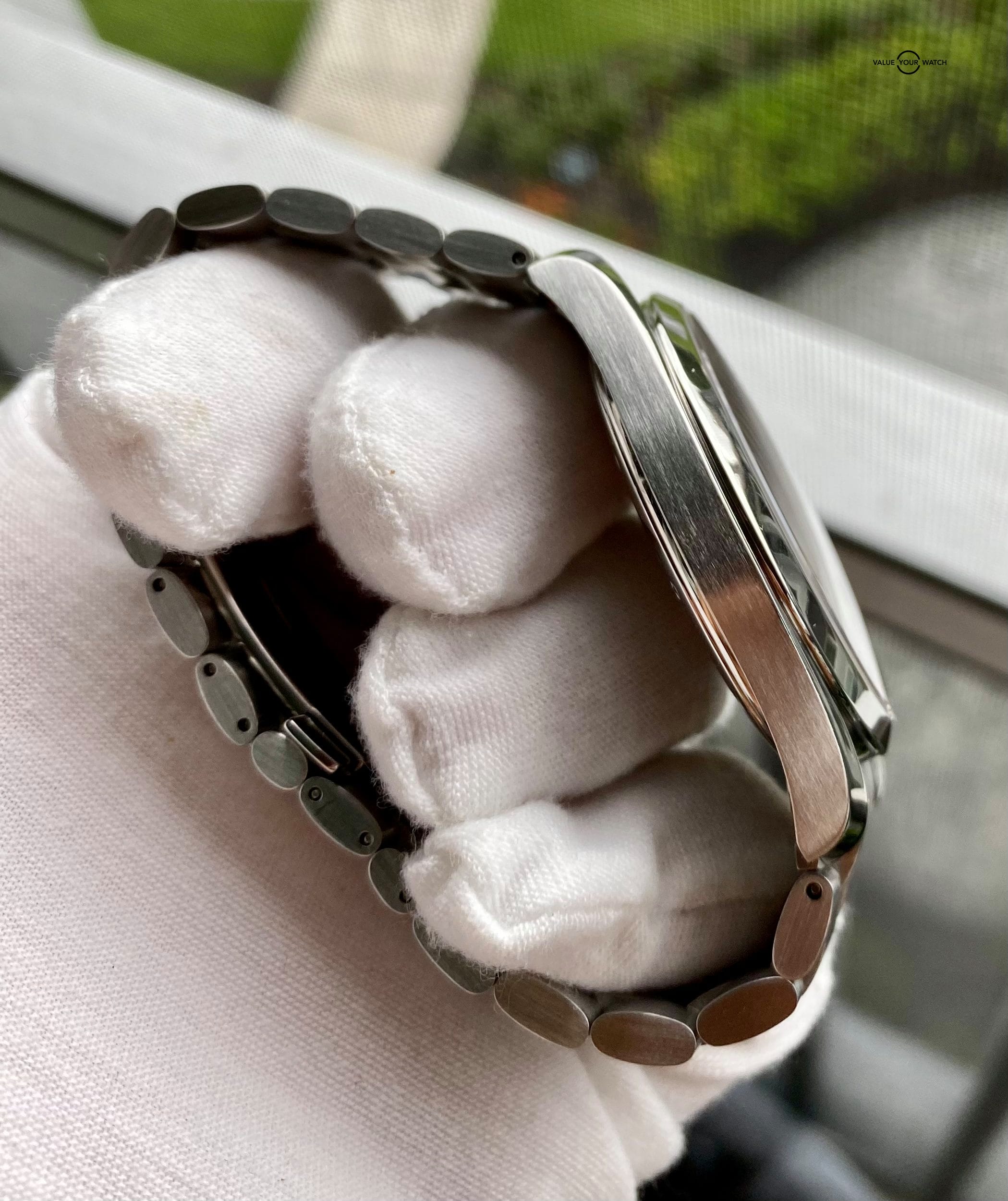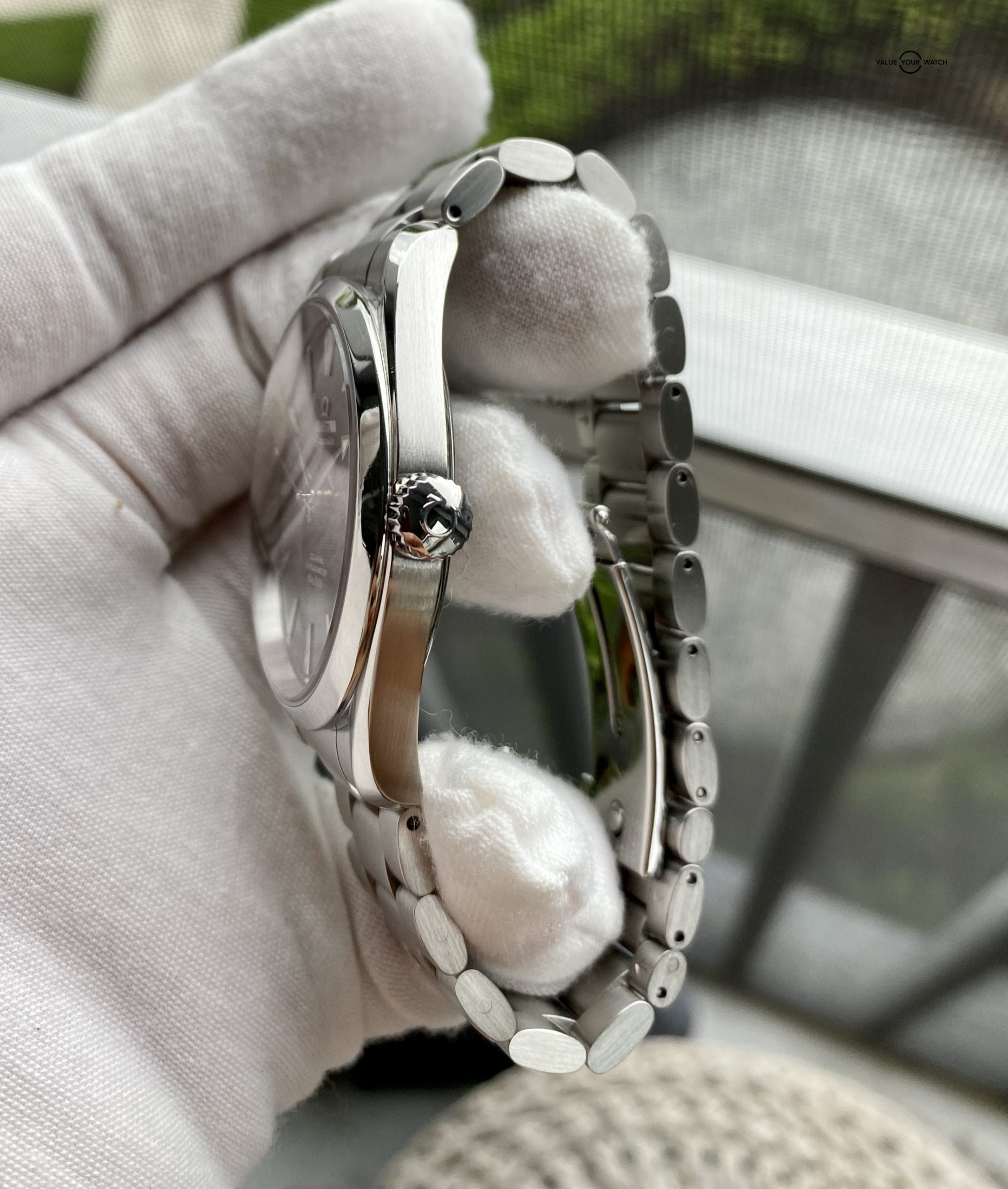 Available for purchase is this handsome classic Omega Seamaster Aqua Terra Big Size. It’s 42mm case houses a gorgeous smooth gloss black enamel dial, and Omegas 2500 workhorse automatic movement. Unlike the modern Aqua Terra’s this dial does not have the teak plank, which provides a sleeker more sophisticated vibe, while still been sporty. Another great quality of these older Aqua Terra models is how slim they are, at only 11mm thick it has great feel on the wrist. Date indicator at 3 o’clock, screw down crown, and display caseback.