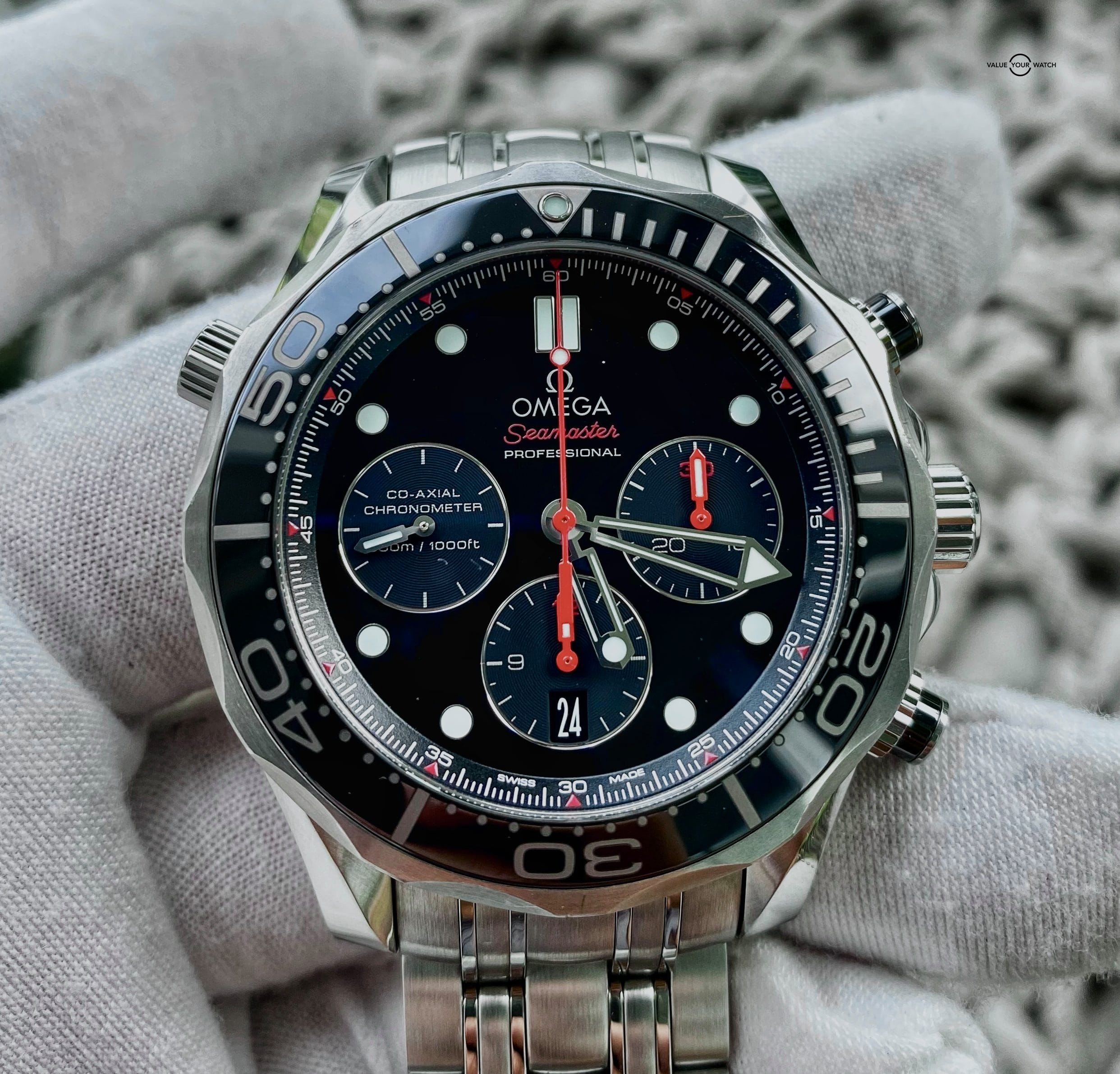 Available for purchase is this gloss black dial beauty of a Seamaster Diver 300m Chronograph. At 44mm this is a much more approachable size than the newer Planet Ocean Chronographs at 46mm and a substantial amount of heft more. Little hints of red on the dial and hands really set the feel of this watch off, but don’t make it too sporty.