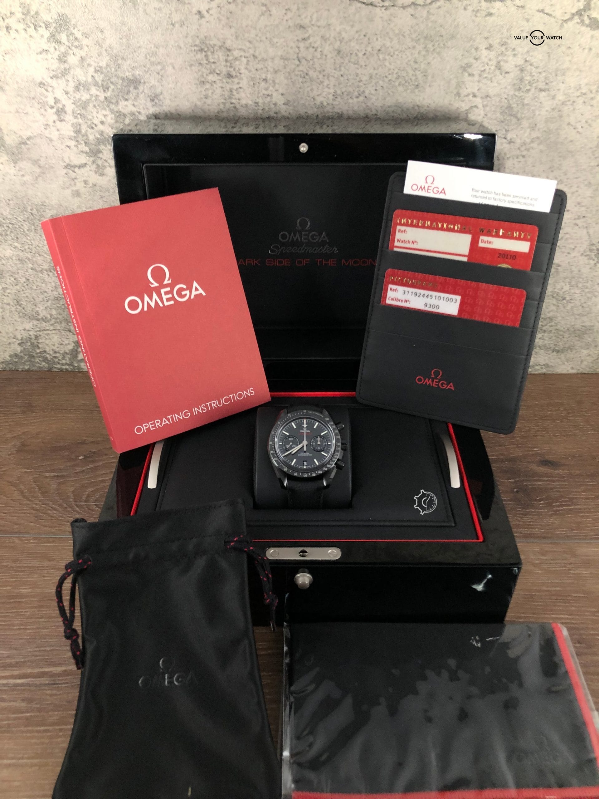 This watch comes as a full double boxed kit, including the pictogram card, international warranty card (blank), Operating Instructions Manual, black Omega bag & black Omega cleaning cloth.