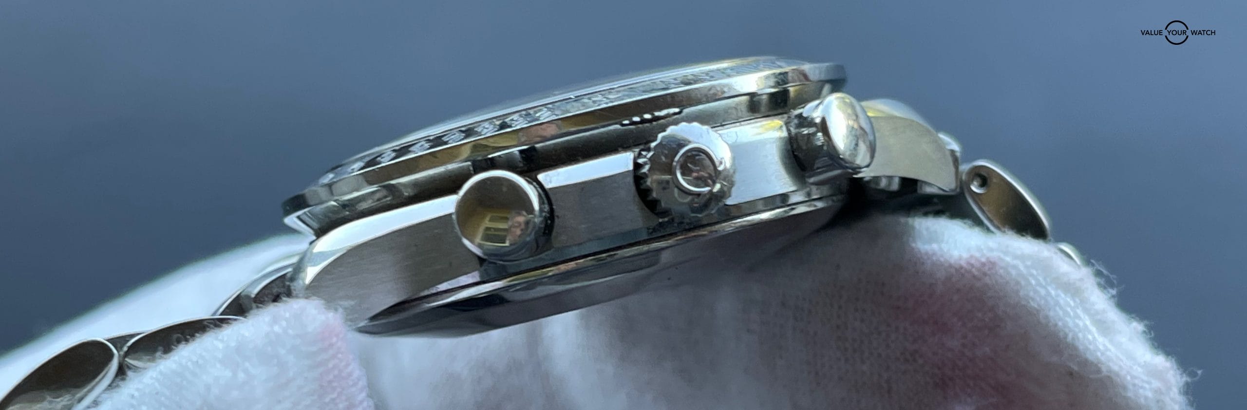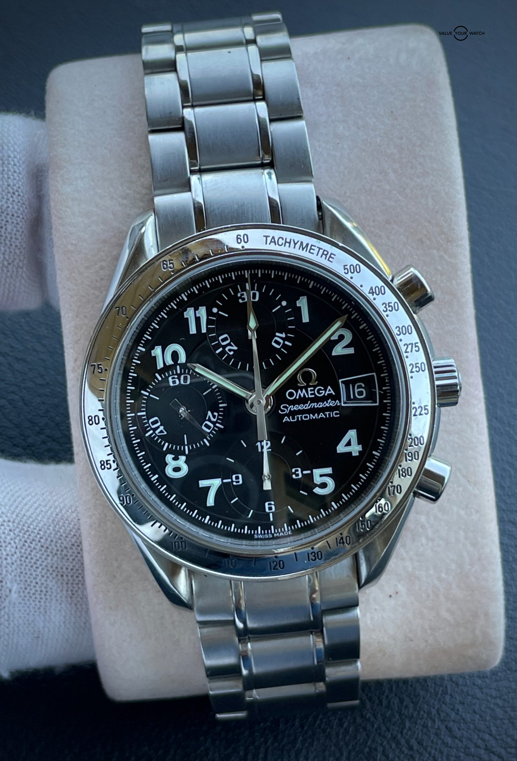 This Omega is a unique piece with its black dial, arabic numbers and chronographe. The steel case and Omega’s humble design makes this a timeless classic and is an excellent daily wearer. Will fit up to an 8 inch wrist.