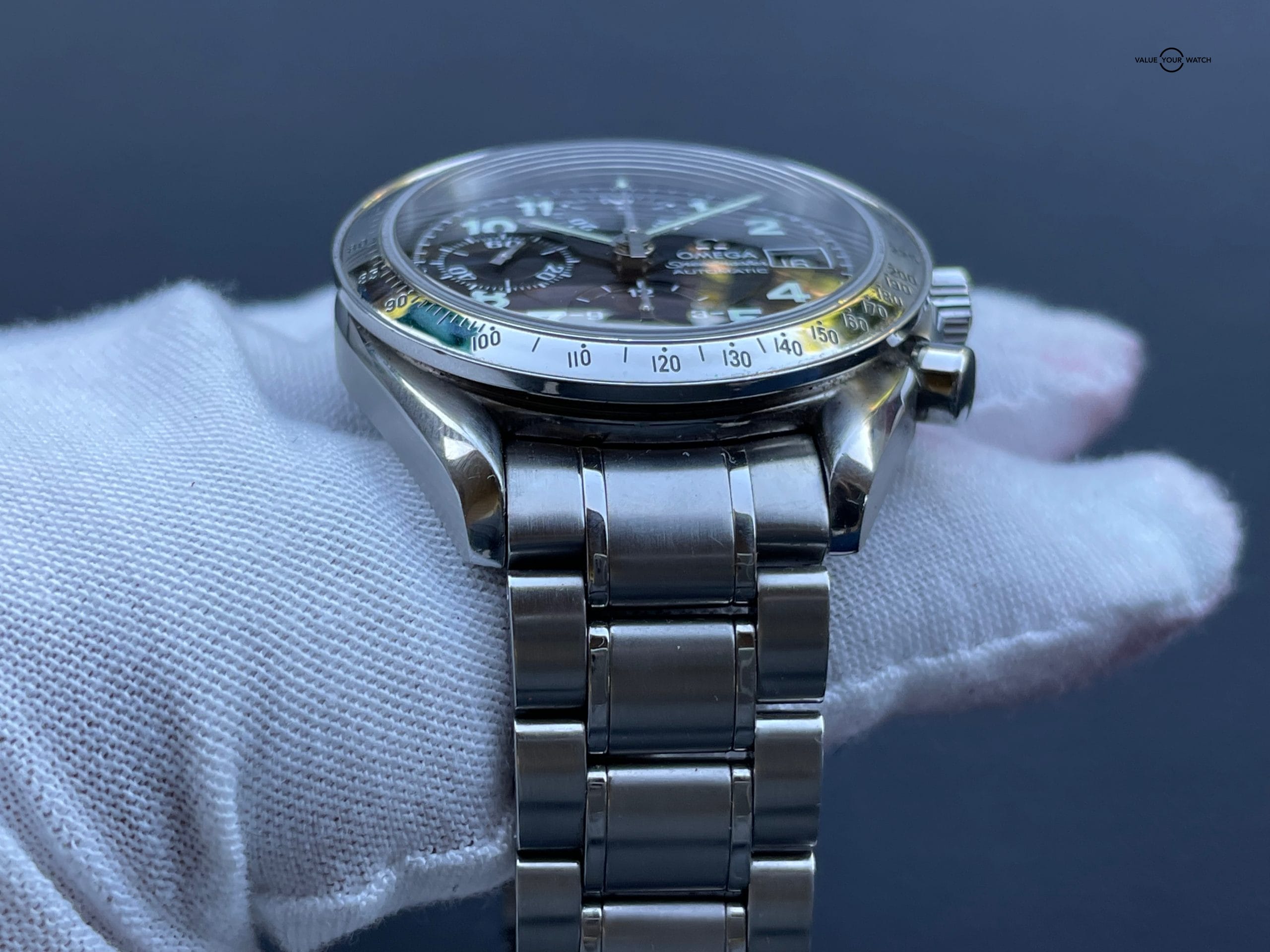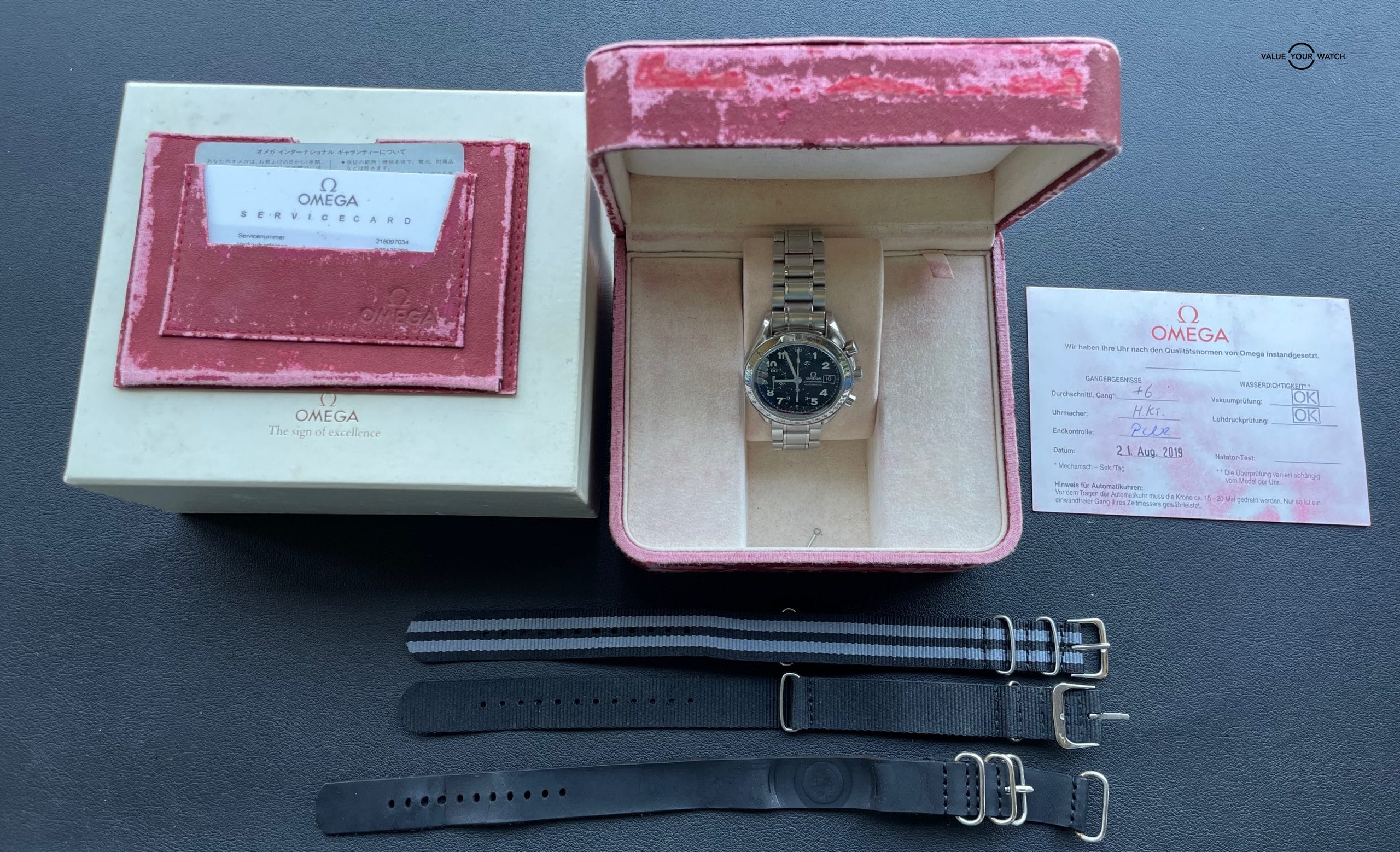 Collectible Omega Speedmaster Date Japan Edition. Comes with Original Outer and inner Omega Box Box, Omega service papers dated August 2019, you are good for another 10 years! Omega translation card and Omega plastic service cards. (see picture to see EXACTLY which papers included in sale)