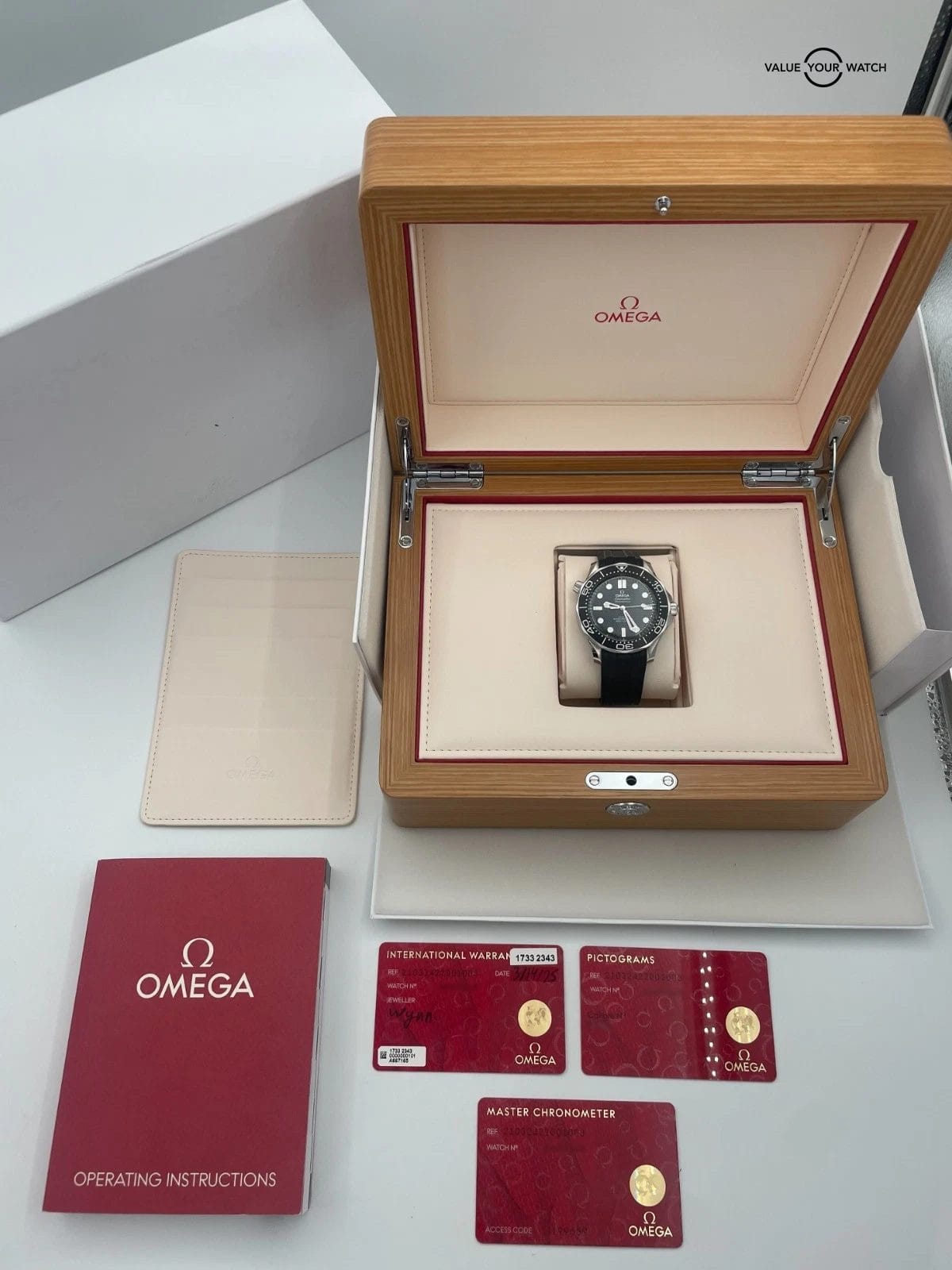 This timepiece comes as a complete set with outer white box, inner pearwood box, instruction manual, original receipt, pictogram, chronometer, and warranty card (Dated 3/14/2025). The watch is in nice pre-owned condition with typical cosmetic wear throughout. Mechanically the watch is functioning as it should. Serial numbers & names are blurred in photos only for privacy reasons.
