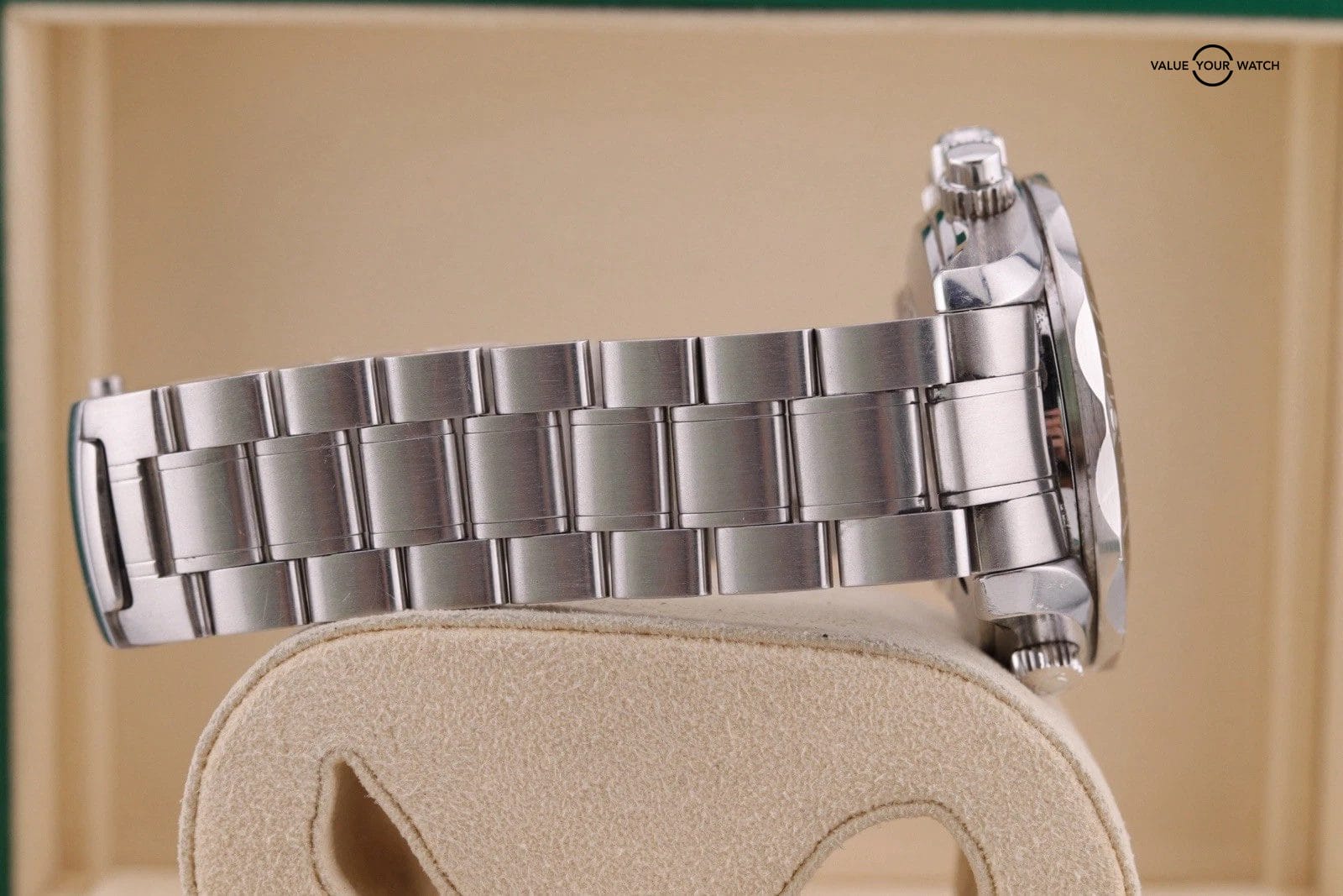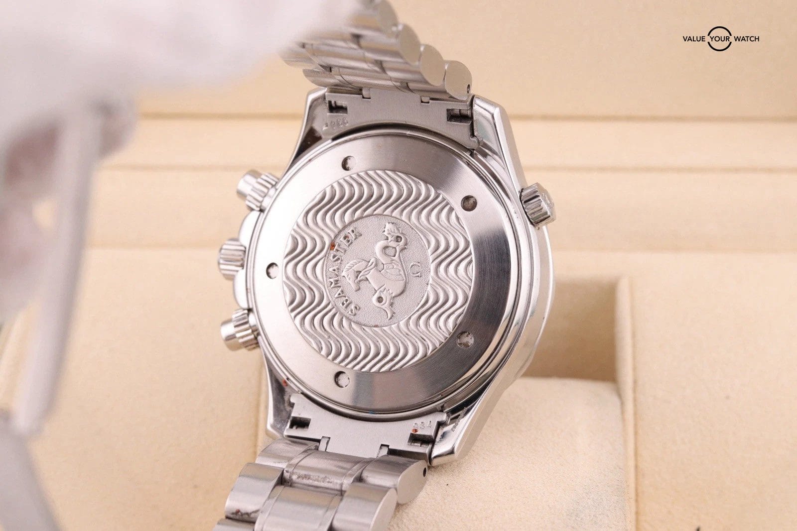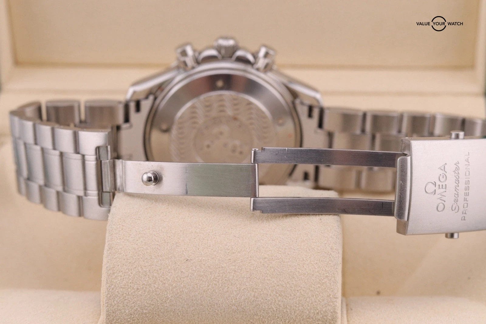 This Omega Seamaster Professional Chronograph (Ref. 2594.52.00) delivers a perfect blend of sporty function and iconic Omega styling. The 41.5mm stainless steel case is paired with a matching steel bracelet and features a black dial with luminous markers, broad sword hands, and a triple-register chronograph layout. A date window is neatly positioned at 6 o’clock.